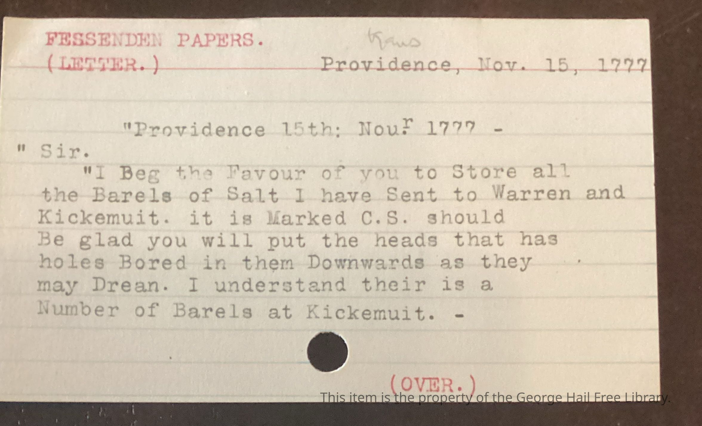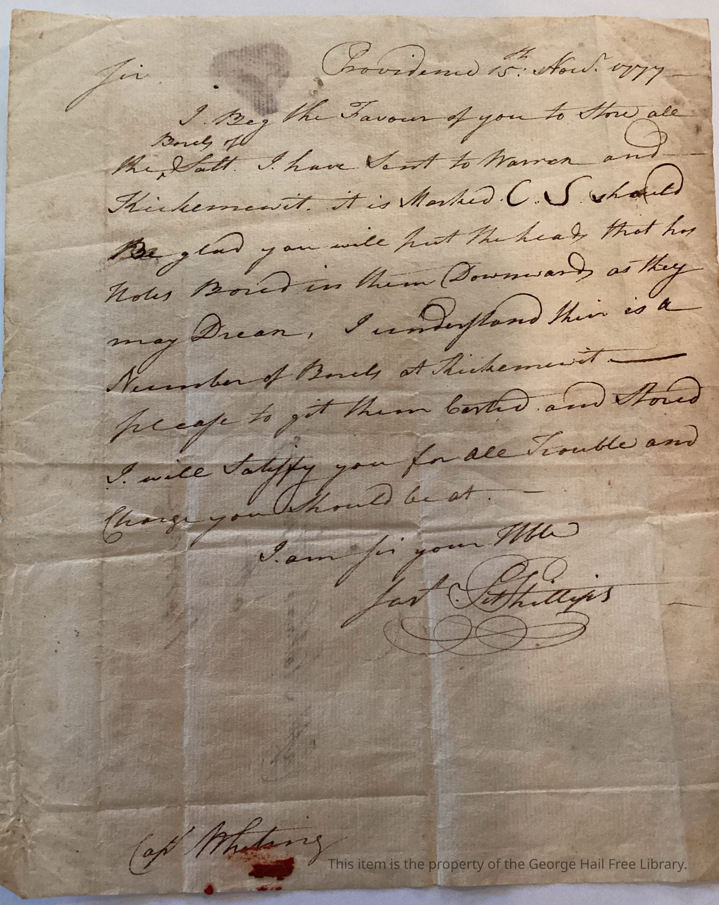 Letter to Nathan Whiting about barrels of salt (?) Phillips sent to “Warren and Kickemuit”Lexicon