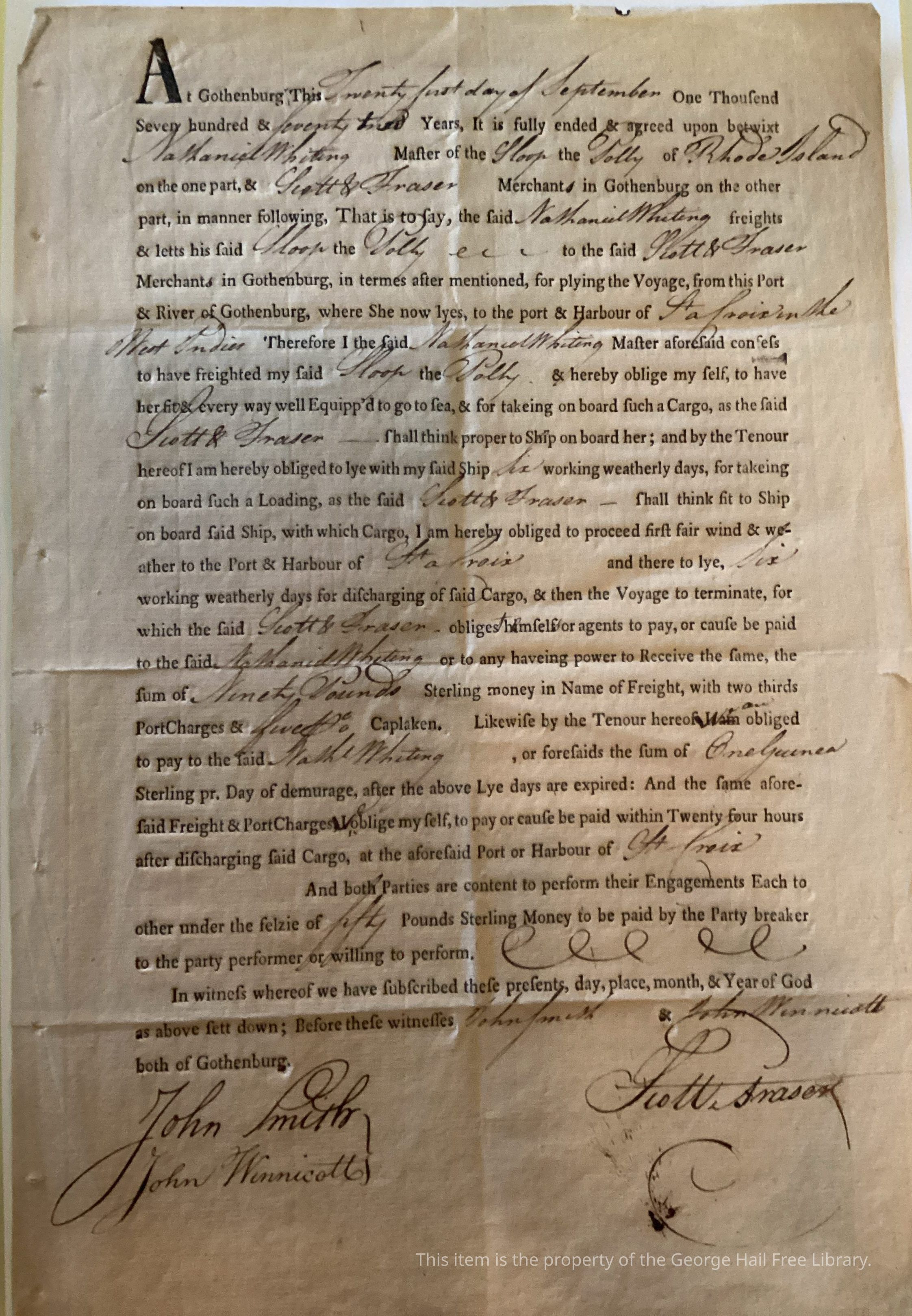 At Gothenburg This Twenty first day of September One Thousend [THOUSAND] Seven hundred & Seventy two Years, It is fully ended & agreed upon betwixt Nathaniel Whiting Master of the Sloop the Polly of Rhode Island on the one part, & Scott & Fraser Merchants in Gothenburg on the other part, in manner following, That is to say, the said Nathaniel Whiting freights & letts his said Sloop the Polly to the said Scott & Fraser Merchants in Gothenburg, in termes after mentioned, for plying the Voyage, from this Port & River of Gothenburg, where She now lyes, to the port & Harbour of St Croix in the West Indies. Therefore I the said Nathaniel Whiting Master aforesaid confess to have freighted my said Sloop the Polly & hereby oblige my self, to have her fit & every way well Equipp'd to go to sea, & for takeing on board such a Cargo, as the Said Scott & Fraser - shall think proper to Ship on board her; and by the Tenour hereof I am hereby obliged to lye with my said Ship six working weatherly days, for takeing on board such a Loading, as the said Scott & Fraser - shall think fit to Ship on board said Ship, with which Cargo, I am hereby obliged to proceed first fair wind & weather to the Port & Harbour of St Croix and there to lye, Six working weatherly days for discharging of said Cargo, & then the Voyage to terminate, for which the said Scott & Fraser - obliges themselfs or agents to pay, or cause be paid to the said Nathaniel Whiting or to any haveing power to Receive the same, the sum of Ninety Pounds Sterling money in Name of Freight, with two thirds PortCharges & five Caplaken. Likewise by the Tenour hereof we are obliged to pay the said Nath Whiting, or foresaids the sum of One Guinea Sterling pr. Day of demurage, after the above Lye days are expired: And the same aforesaid Freight & PortCharges I oblige myself, to pay or cause be paid within Twenty four hours after discharging said Cargo, at the aforesaid Port or Harbour of St. Croix.