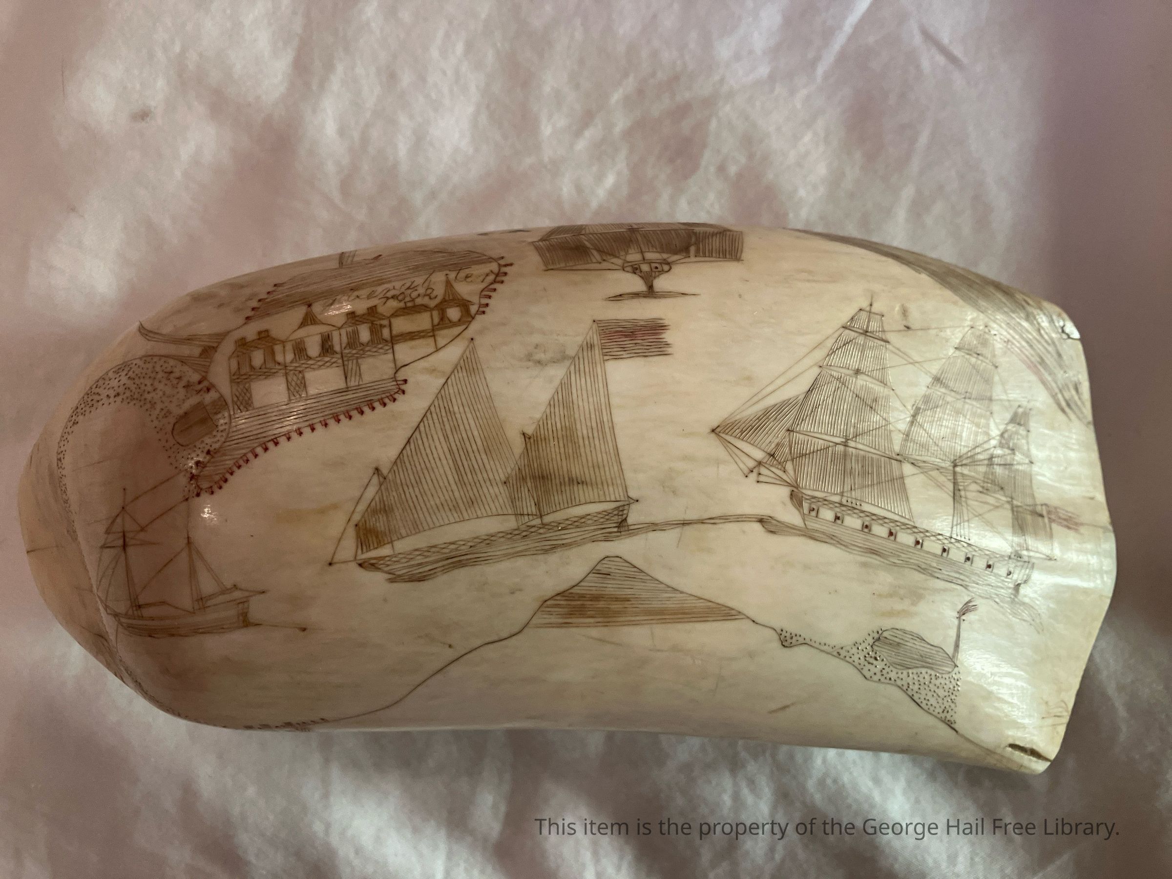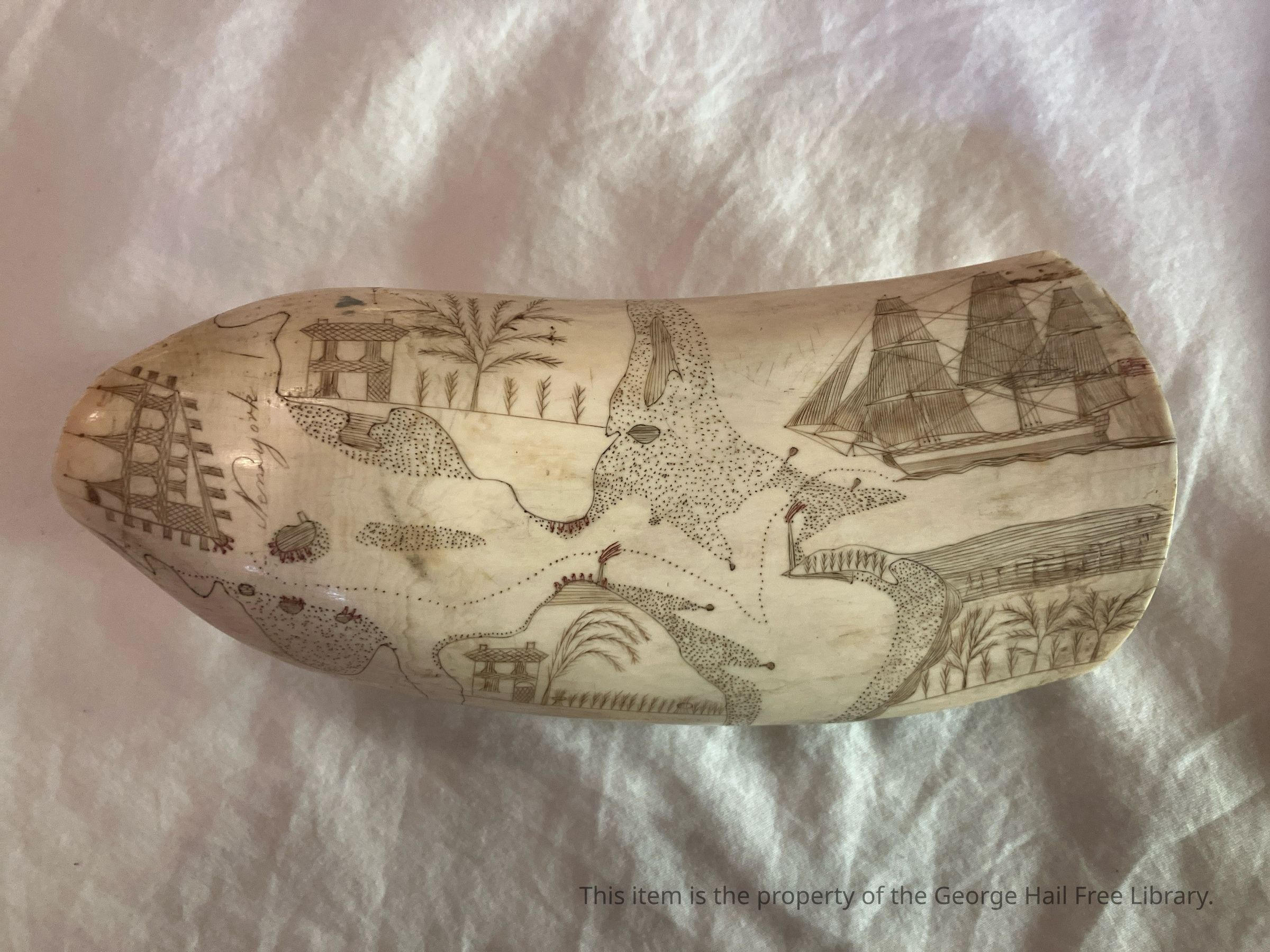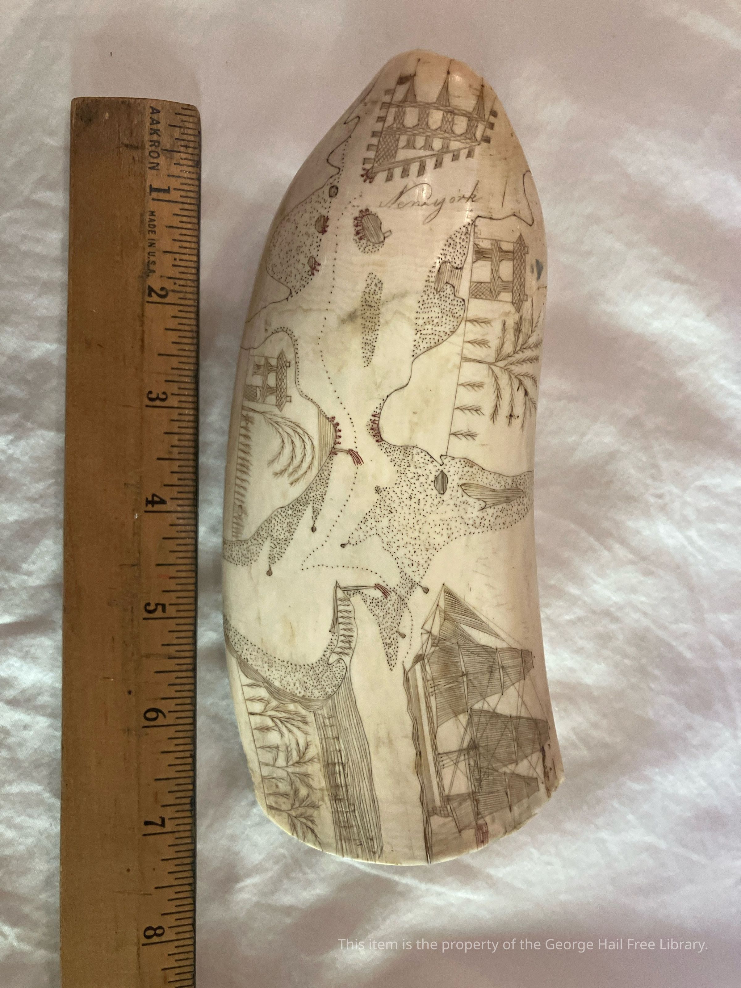 Scrimshaw is scrollwork, engravings, and carvings done in bone, ivory, or whale products such as teeth and baleen. Typically it refers to the artwork created by whalers, engraved on the byproducts of whales. It is most commonly made out of the bones and teeth of sperm whales, the baleen of other whales, and the tusks of walruses. It takes the form of elaborate engravings in the form of pictures and lettering on the surface of the bone or tooth, with the engraving highlighted using a pigment, or, less often, small sculptures made from the same material. (Some content from Wikipedia: https://en.wikipedia.org/wiki/Scrimshaw)