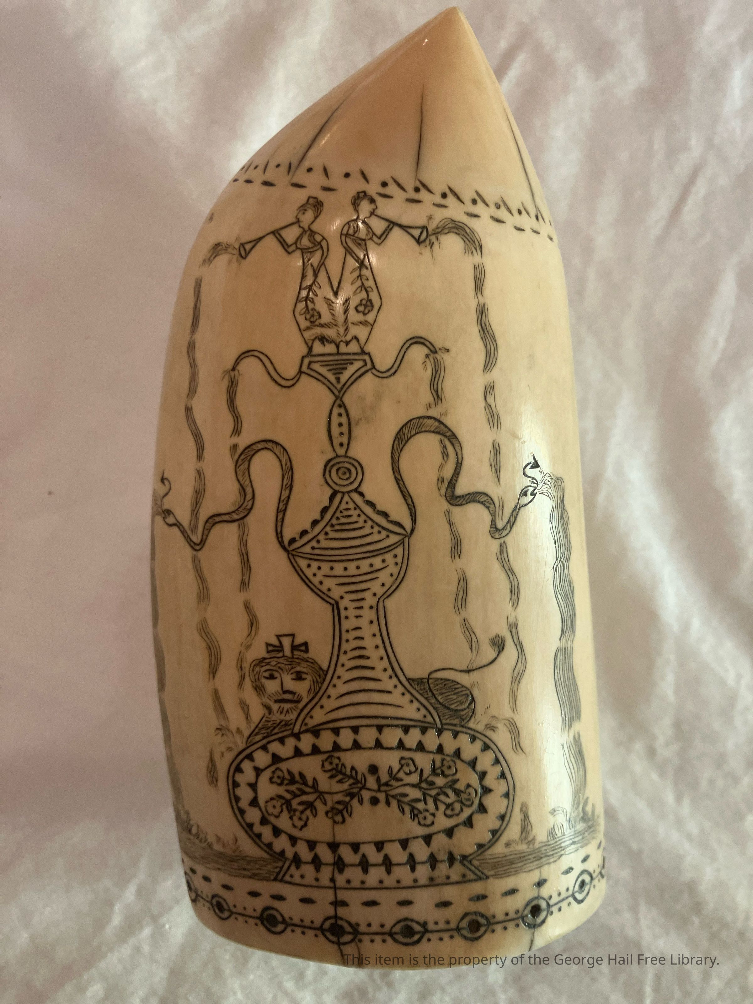 Scrimshaw is scrollwork, engravings, and carvings done in bone, ivory, or whale products such as teeth and baleen. Typically it refers to the artwork created by whalers, engraved on the byproducts of whales. It is most commonly made out of the bones and teeth of sperm whales, the baleen of other whales, and the tusks of walruses. It takes the form of elaborate engravings in the form of pictures and lettering on the surface of the bone or tooth, with the engraving highlighted using a pigment, or, less often, small sculptures made from the same material. (Some content from Wikipedia: https://en.wikipedia.org/wiki/Scrimshaw)