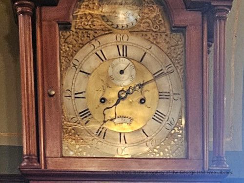 Here we see the face of a tall case clock designed by Edward Spalding that graces the main floor of the George Hail Library. Born in Connecticut in 1732, he moved to Providence when he was young and apprenticed as a clockmaker. By the age of 21, he was already producing his own clocks, making him one of Providence's earliest clockmakers. In 1757, he married Audrey Stafford, with whom he had three children. His son, Edward Jr., studied the craft under him.
