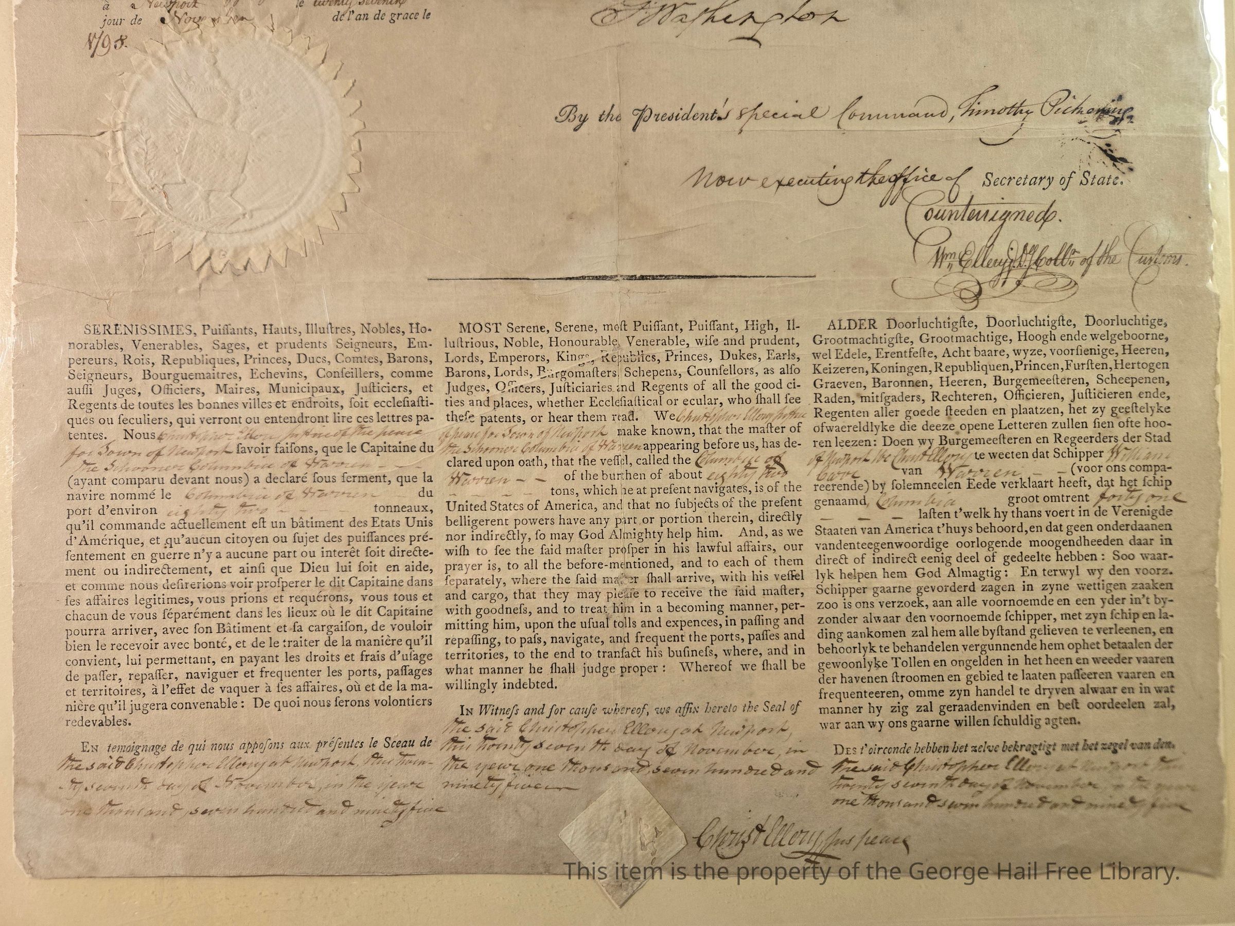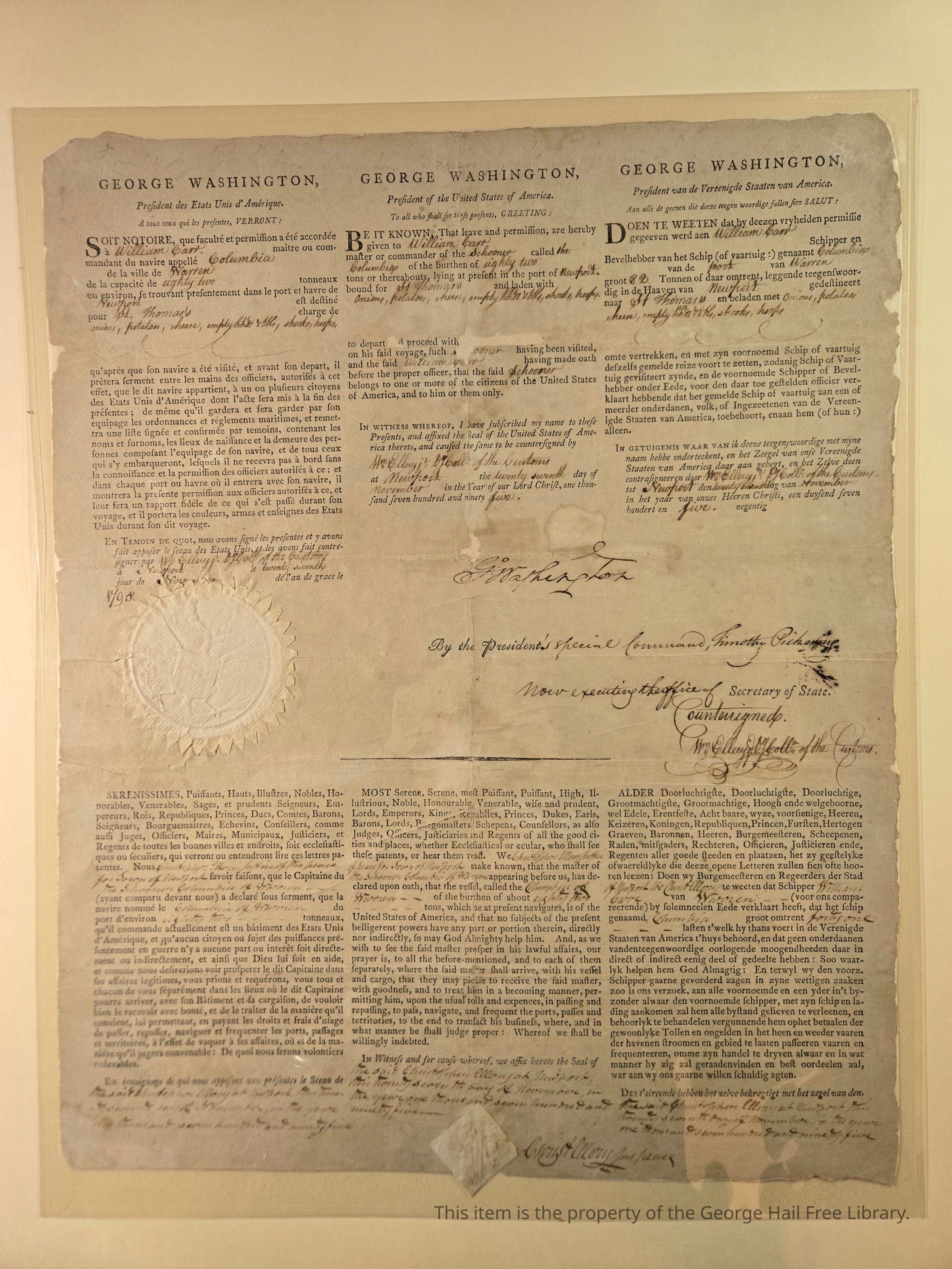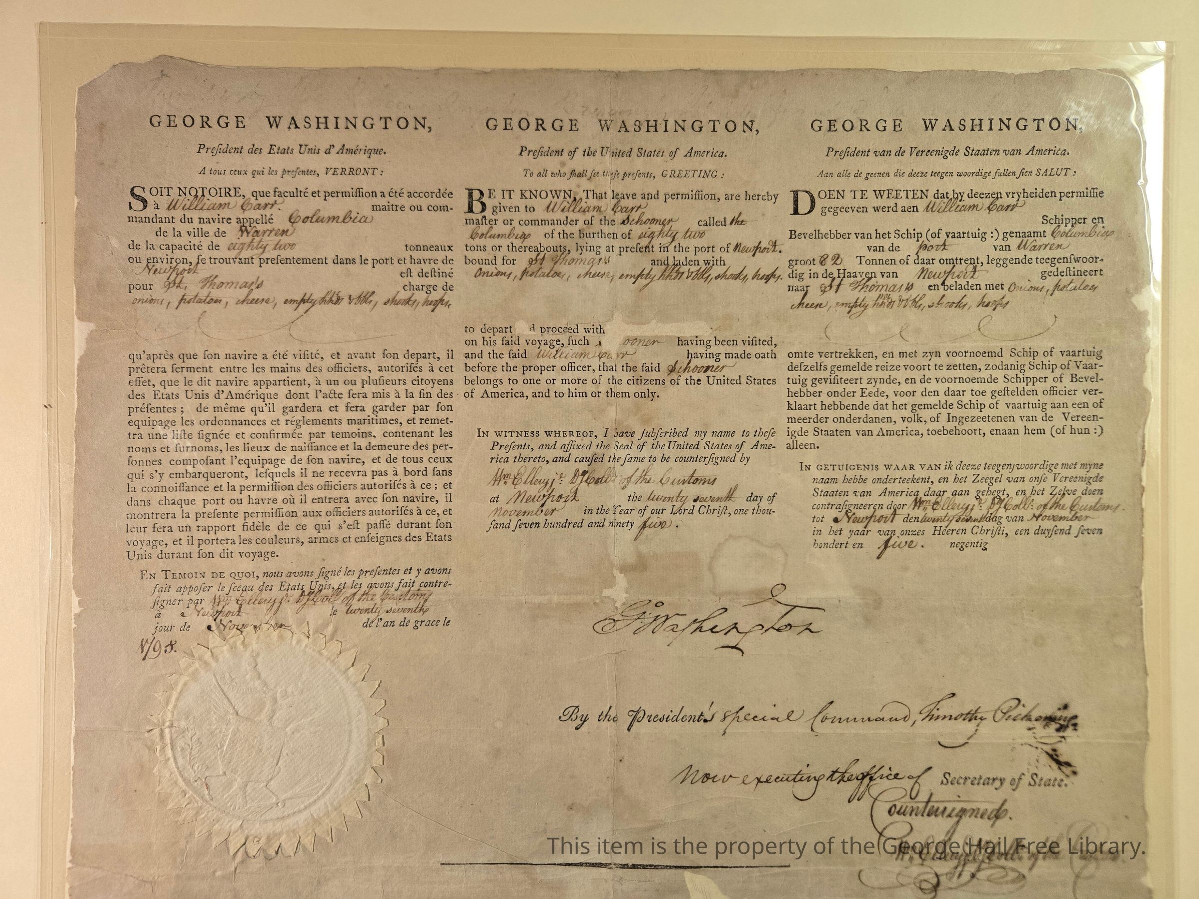 Schooner Columbia—signed by George Washington, Timothy PickeringContext