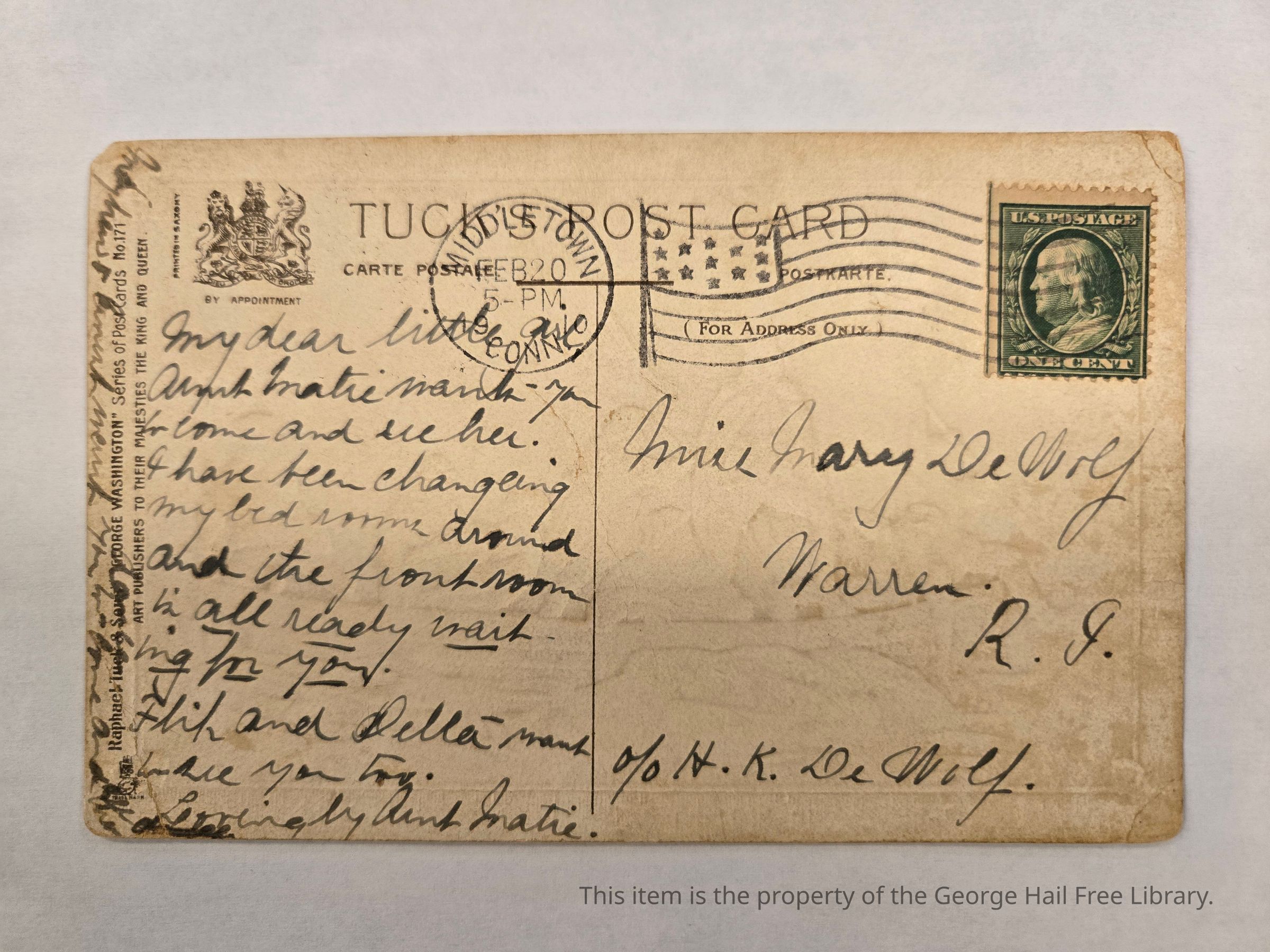 George Washington Postcard Addressed to Mary DeWolfEntry/Object ID