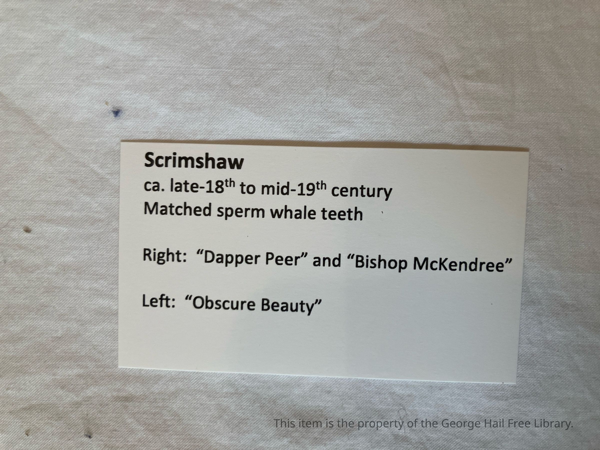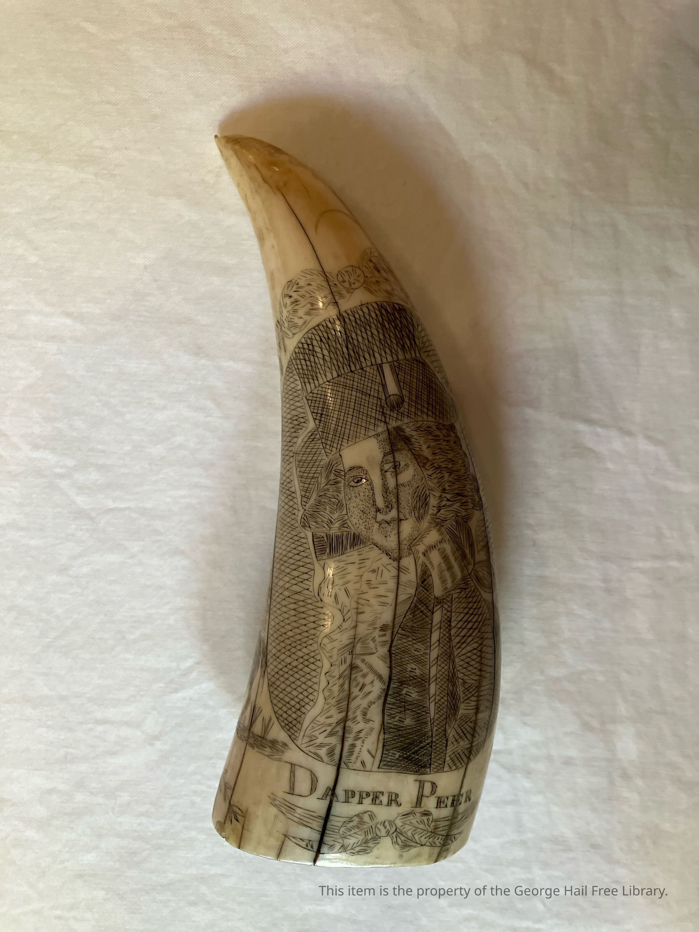 Scrimshaw is scrollwork, engravings, and carvings done in bone, ivory, or whale products such as teeth and baleen. Typically it refers to the artwork created by whalers, engraved on the byproducts of whales. It is most commonly made out of the bones and teeth of sperm whales, the baleen of other whales, and the tusks of walruses. It takes the form of elaborate engravings in the form of pictures and lettering on the surface of the bone or tooth, with the engraving highlighted using a pigment, or, less often, small sculptures made from the same material. (Some content from Wikipedia: https://en.wikipedia.org/wiki/Scrimshaw)