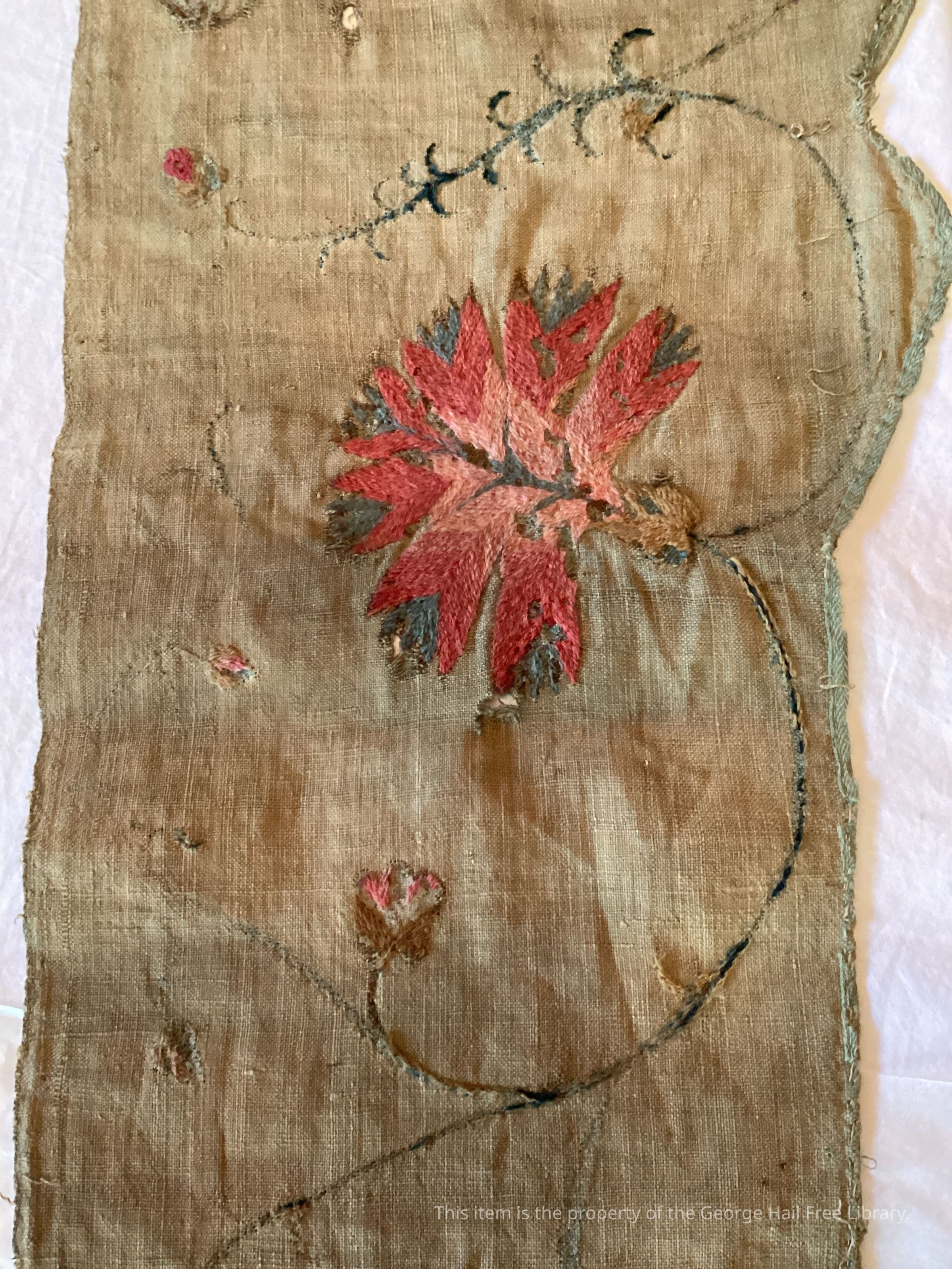 Worked by Hannah Gay of Warren during the Revolutionary War and some years before her marriage. She married Col. Peter Church November 1787. The embroidery was worked on India cotton before cotton cloth was made in this country.
