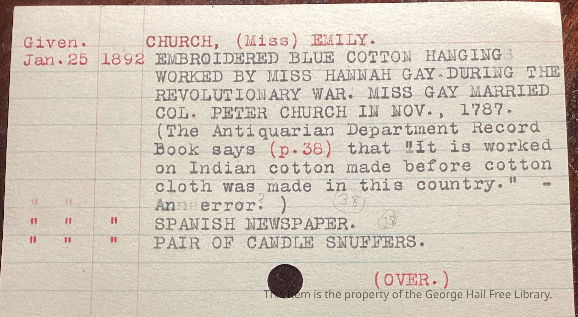 “Worked by Miss Hannah Gay during the Revolutionary War and some years before her marriage. She married Col. Peter church Nov 1787. It was worked on India cotton before cotton cloth was made in this country.