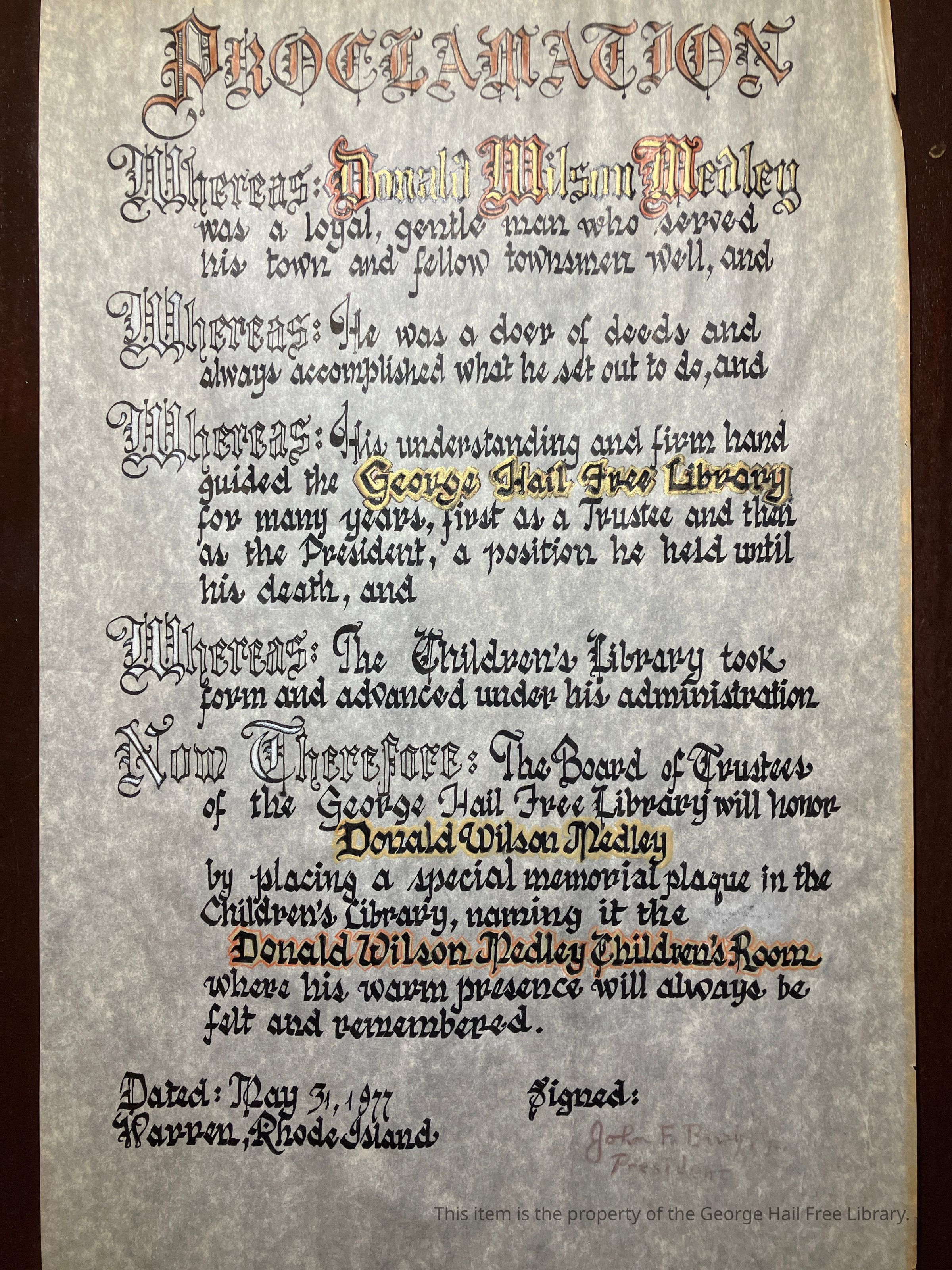 Now Therefore: The Board of Trustees of the George Hail Free Library will honor Donald Wilson Medley by placing a special memorial plaque in the Children's Library, naming it the Donald Wilson Medley Children's Room where his warm presence will always be felt and remembered.