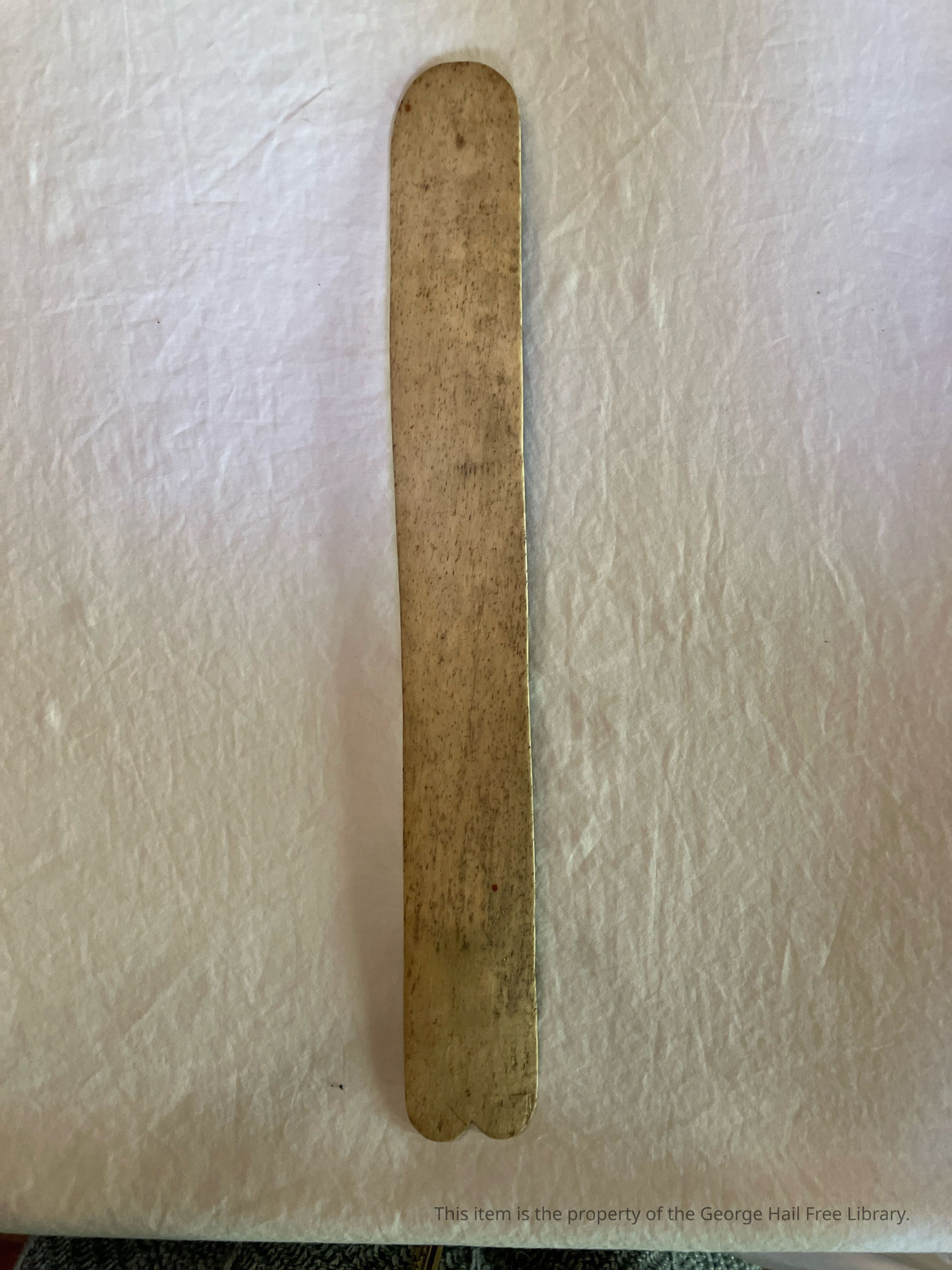 Busks were used in women's clothing from the 1600s--1900s to provide a desirable shape. Many were made from whale baleen and sailors would sometimes carve them and give them to loved ones as gifts. Use A busk (also spelled busque) is a rigid element of a corset at the center front of the garment. Two types exist, one- and two-part busks. Single-piece busks were used in "stays" and bodices from the sixteenth to early nineteenth centuries and were intended to keep the front of the corset or bodice straight and upright. They were typically made of wood, ivory, or bone slipped into a pocket and tied in place with a lace called the busk point. These busks were often carved and decorated, or inscribed with messages, and were popular gifts from men to women during courtship. Busks made from whale baleen first appear in the wardrobe accounts of Elizabeth I in the 1580s. (Source: https://en.wikipedia.org/wiki/Busk_(corsetry)).