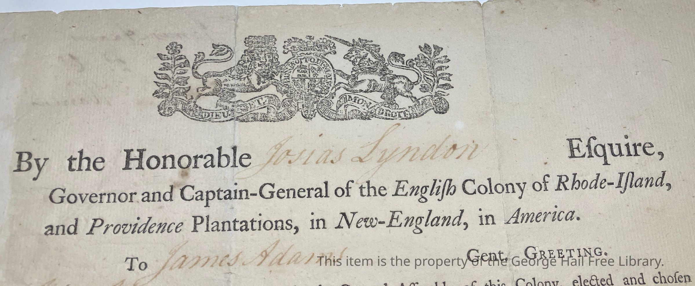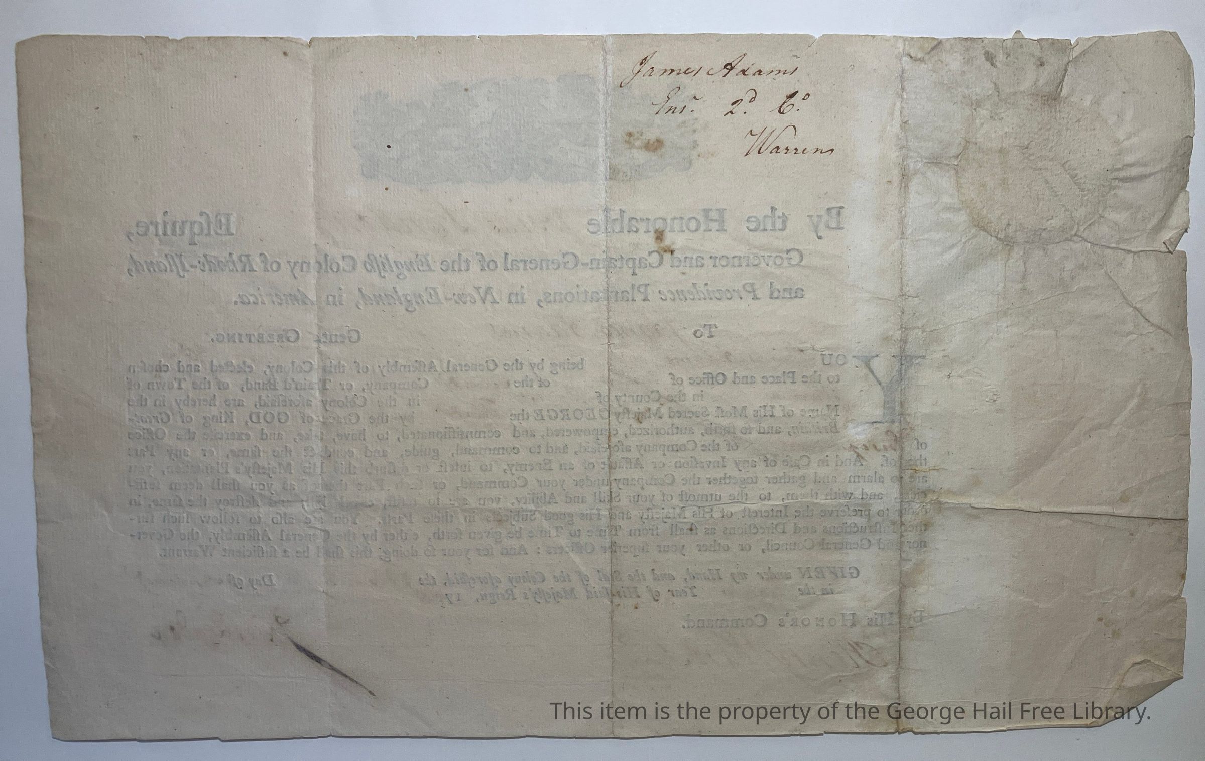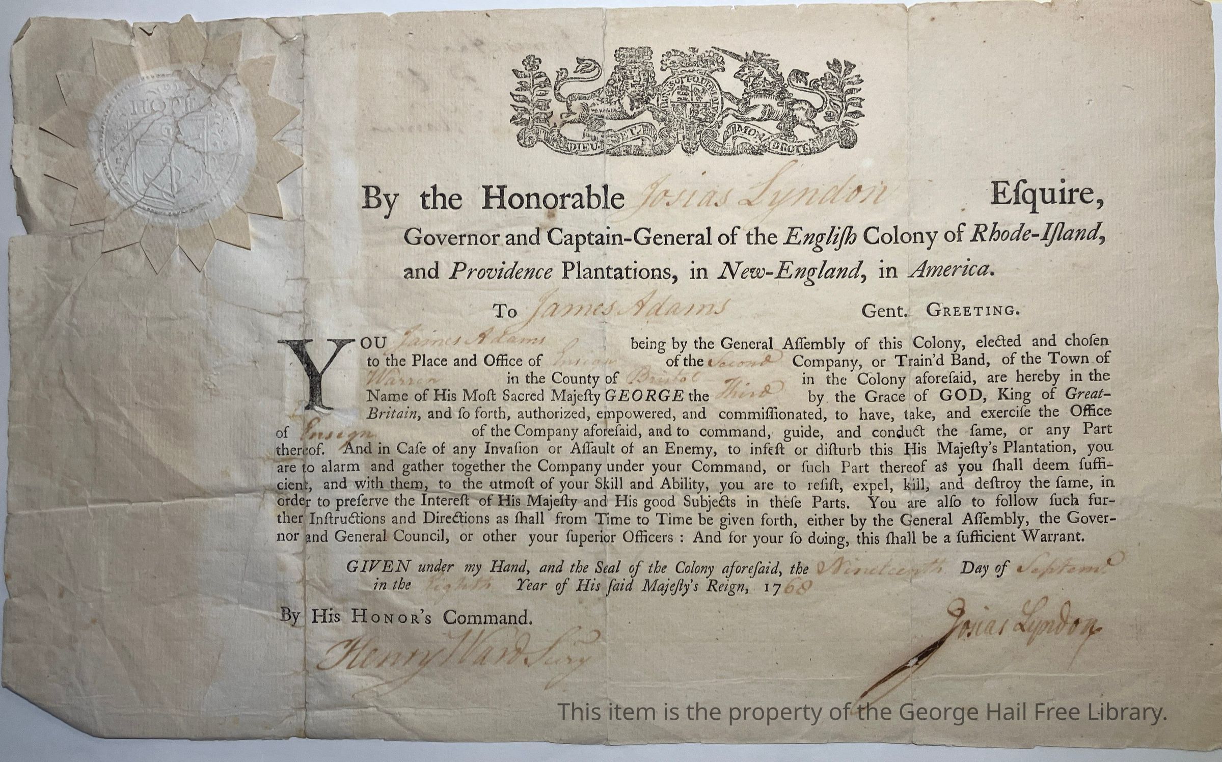 By the Honorable [Josias Lyndon] Esquire, Governor and Captain-General of the English Colony of Rhode-Island, and Providence Plantations, in New England, in America. To [James Adams] Gent. Greeting. You [James Adams] being by the General Assembly of this Colony, elected and chosen to the Place and Office of Ensign of the Second Company, or Train'd Band, of the Town Warren in the County of Bristol in the Colony aforesaid , are herby in Name of His Most Sacred Majesty GEORGE the Third by the Grace of GOD, King of Great-Britain, and so forth, authorized, empowered, and commissionated, to have, take, and exercise the Office of Ensign of the Company under your Command, or such Part thereof as you shall deem sufficient, and with them, to the utmost of your Skill and Ability, you are to resist, expel, kill, and destroy the same, in order to preserve the Interest of His Majesty and His good Subjects in these Parts. You are also to follow such further Instructions and Directs as shall from Time to Time be given forth, either by the General Assembly, the Governor and General Council, or other your superior Officers : And for your so doing, this shall be a sufficient Warrant. GIVEN under my Hand, and the Seal of the Colony aforesaid, the [Nineteenth] Day of [September] in the [Eighth] Year of His said Majesty's Reign, 1768. By His Honor's Command. [Henry Wardsury] [Josias Lyndon]