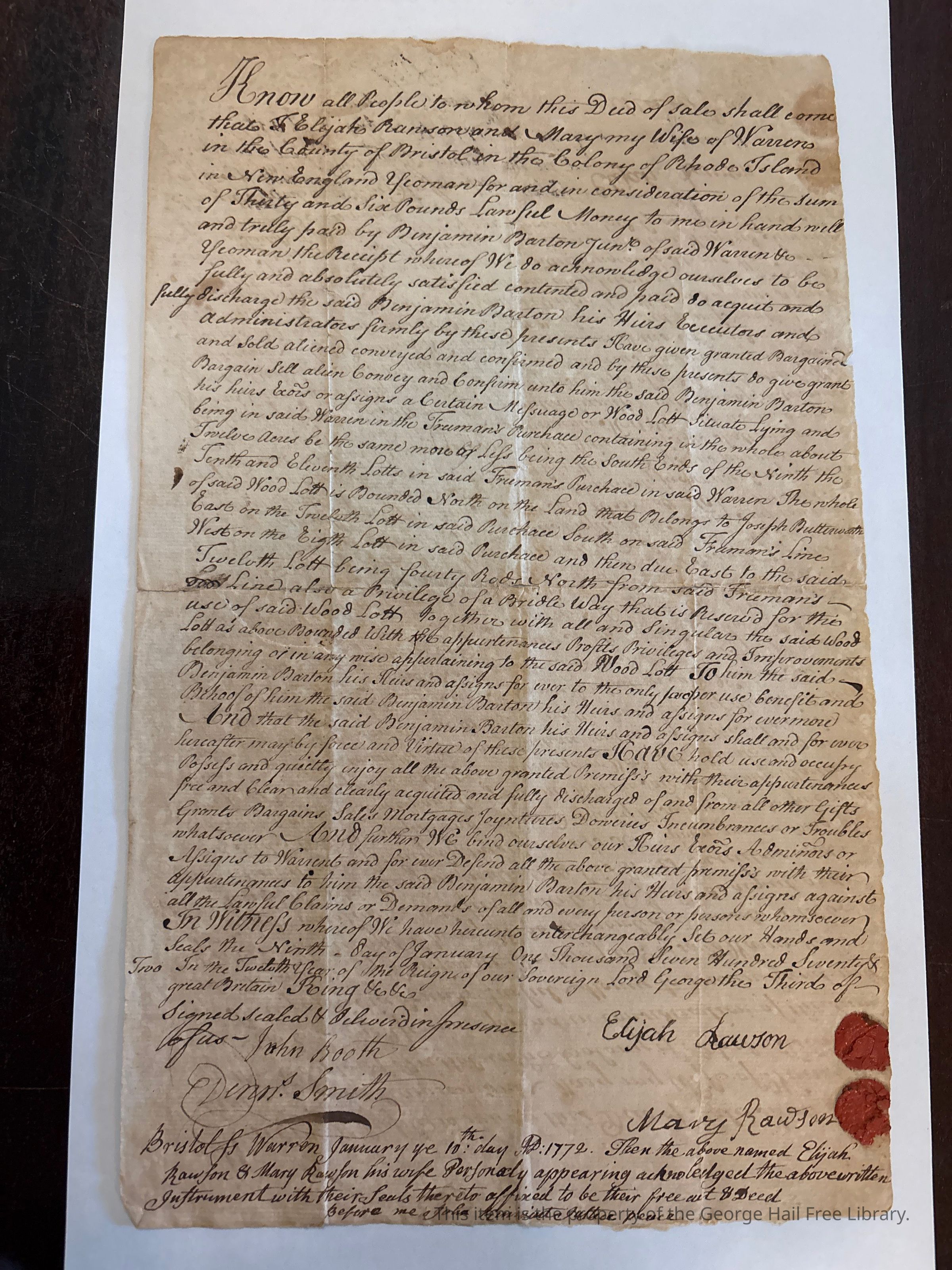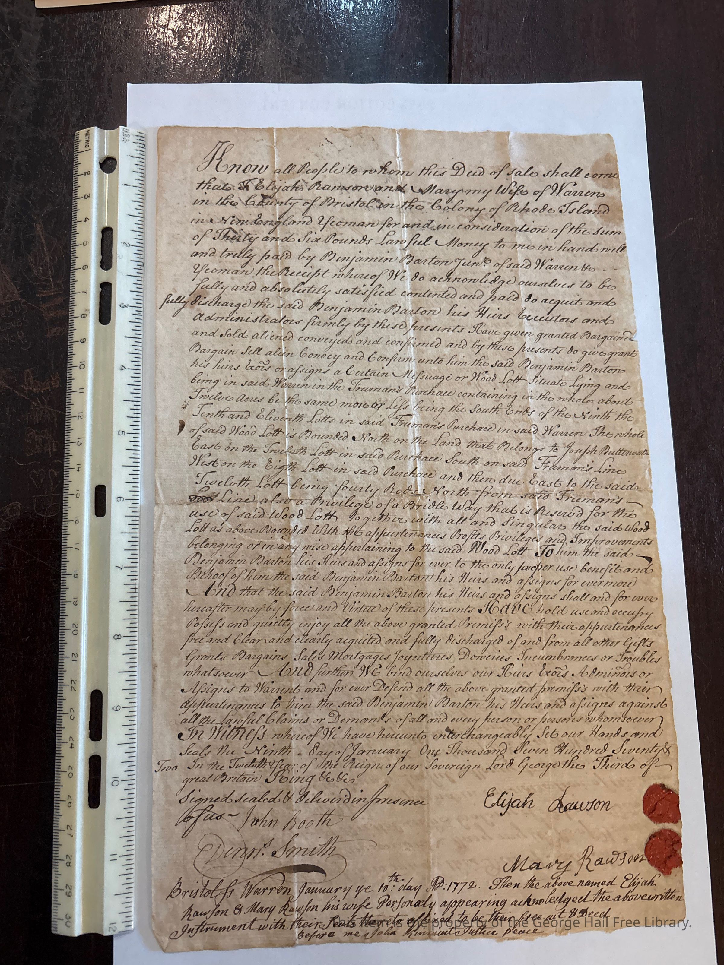 Know all people to who this Deed of sales shall come that I Elijah Rawson and Mary my wife of Warren in the County of Bristol in the colony of Rhode Island in New England, yeoman for and in consideration of the sum of thirty and six pounds lawful money to me in hand well and truly paid by Benjamin Barton Junior of said Warren [?] yeoman the receipt whereof we do acknowledge ourselves to be fully and absolutely satisfied contented and paid do acquit and fully discharge the said Benjamin Barton his heirs executors and administrators firmly by these presents have given granted bargained and sold aliened conveyed and confirm and by those present do give grant bargain sell alien convey and confirm unto him the said Benjamin Barton his heirs [executors] or assigns a certain melsuage or Wood Lott situate lying and being in said Warren in the Freeman's Purchase containing in the whole about twelve acres be the same more or less being the south ends of the Ninth the Tenth and the Eleventh Lotts in said Freeman's Purchase in said Warren. The whole of said Wood Lott is bounded north on the land of [?] belongs to Joseph Butterworth east on the Twelfth Lott in said purchase south on said Freeman's Line west on the eight lott in said Purchase and then due east to the said Twelfth Lott being fourty rods north from said Freeman's Line also a privilege of a bridle way that is [?] for the use of said Wood Lott together with all the singular and said Wood Lott as above bounded with the appurtenances profits privileges and improvements belonging or in any wise appertaining to the said Wood Lott. To him the said Benjamin Barton his heirs and assigns for ever to the only proper use benefit and behoof of him the said Benjamin Barton his heirs and assigns for evermore.