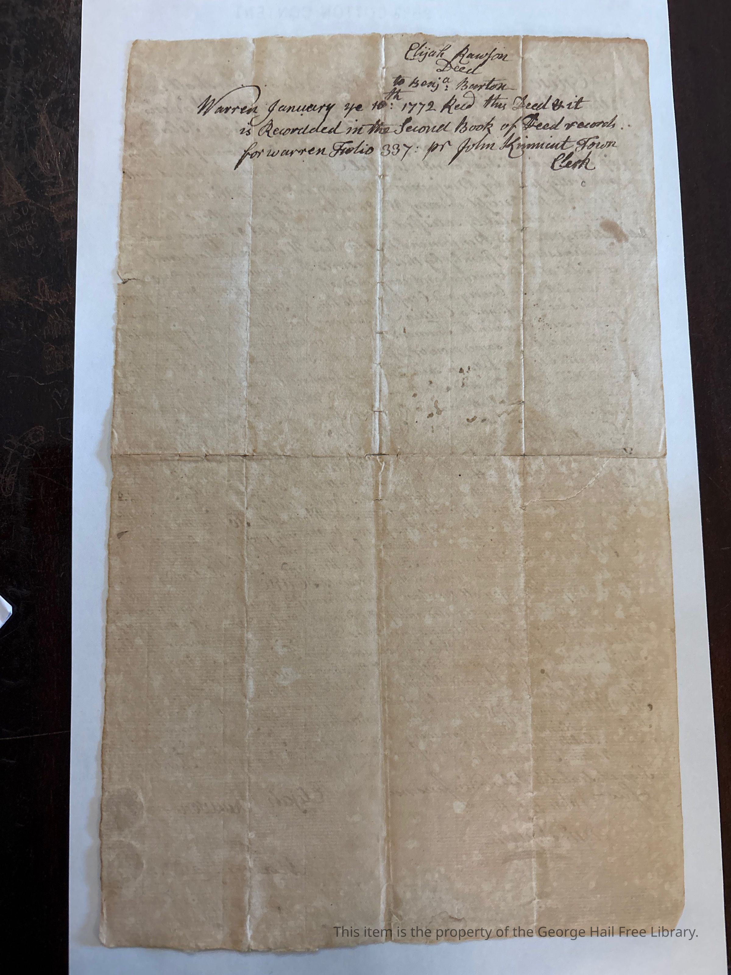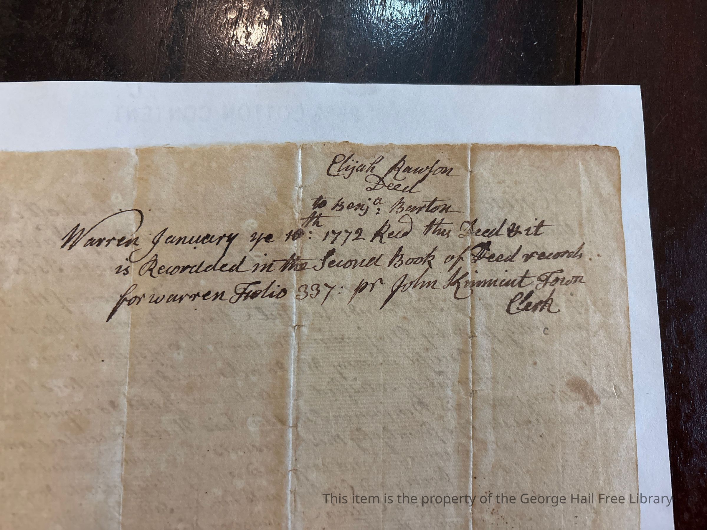 Warren January the 10th: 1772 [?] this deed [?] it is recorded in the second book of deed records for Warren Folio 337: [?] John Kinnicut Town ClerkLexicon