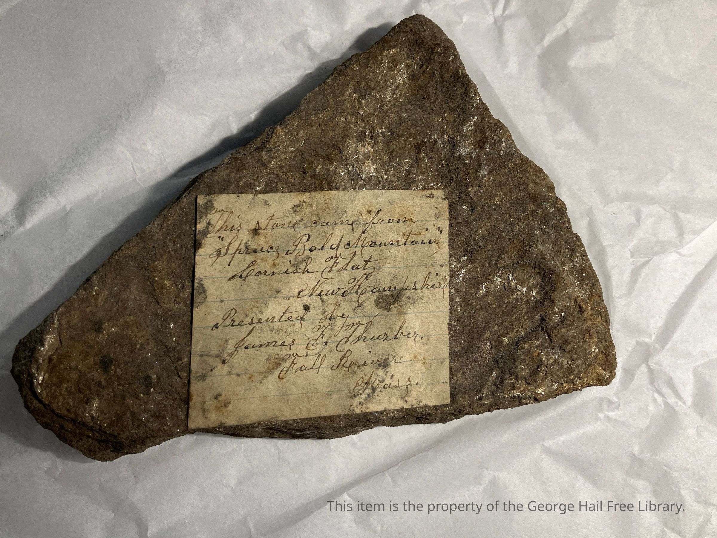 Inscription states "This Stone came from 'Spruce Bald Mountain' Cornish Flat, New Hampshire. Presented by James F. Thurber, Fall River, Mass."Create Date