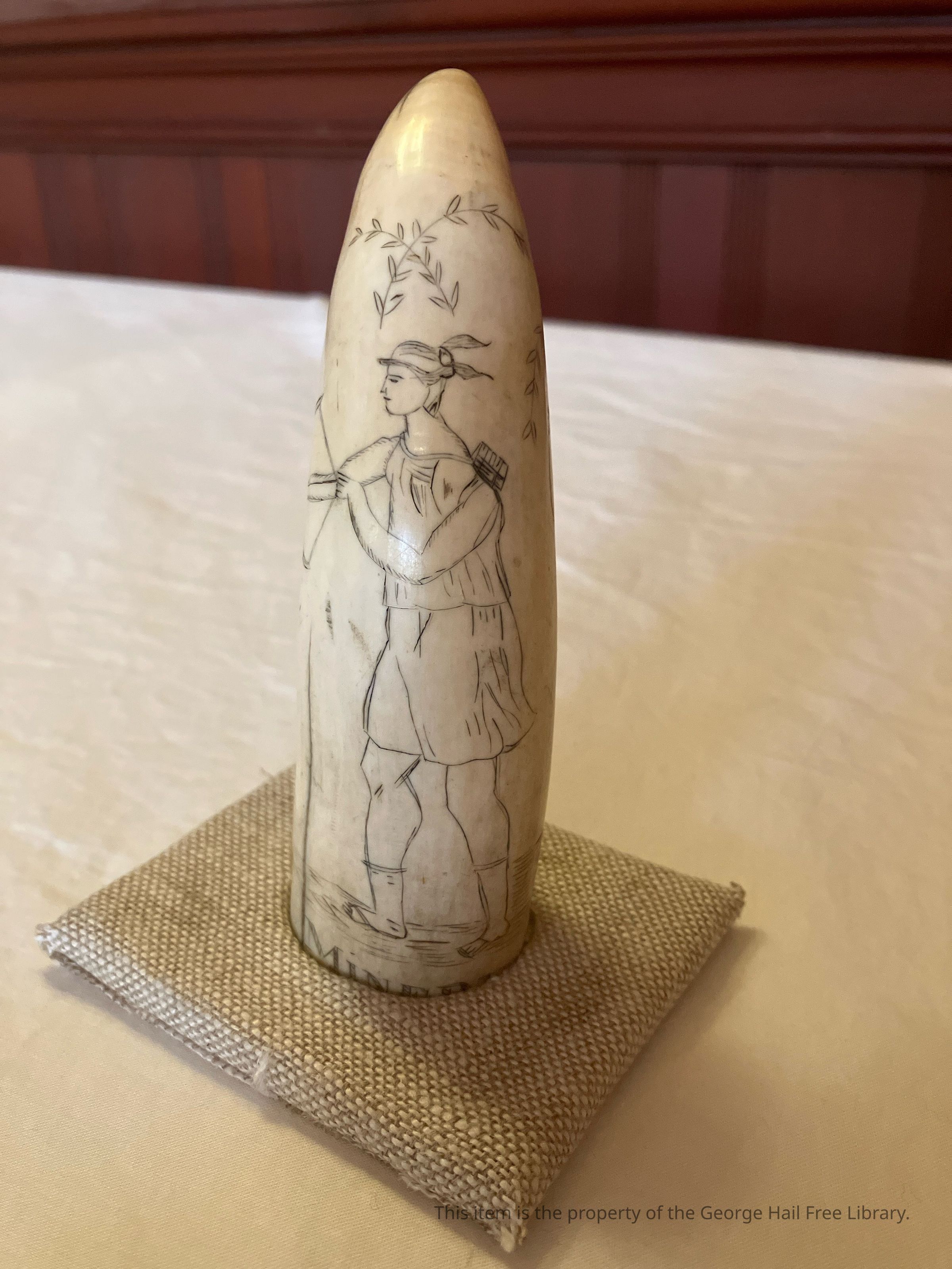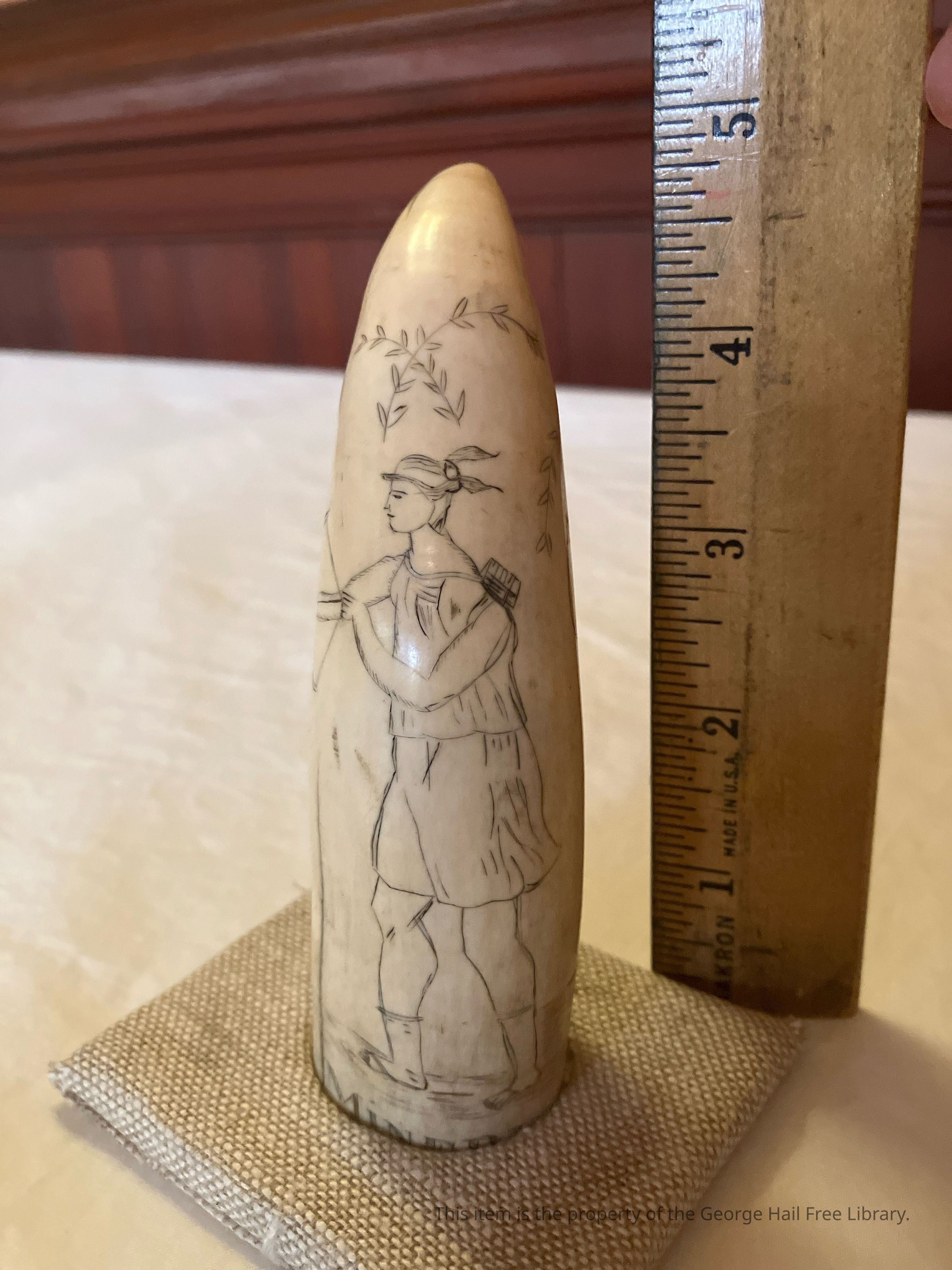 Scrimshaw is scrollwork, engravings, and carvings done in bone, ivory, or whale products such as teeth and baleen. Typically it refers to the artwork created by whalers, engraved on the byproducts of whales. It is most commonly made out of the bones and teeth of sperm whales, the baleen of other whales, and the tusks of walruses. It takes the form of elaborate engravings in the form of pictures and lettering on the surface of the bone or tooth, with the engraving highlighted using a pigment, or, less often, small sculptures made from the same material. (Some content from Wikipedia: https://en.wikipedia.org/wiki/Scrimshaw)