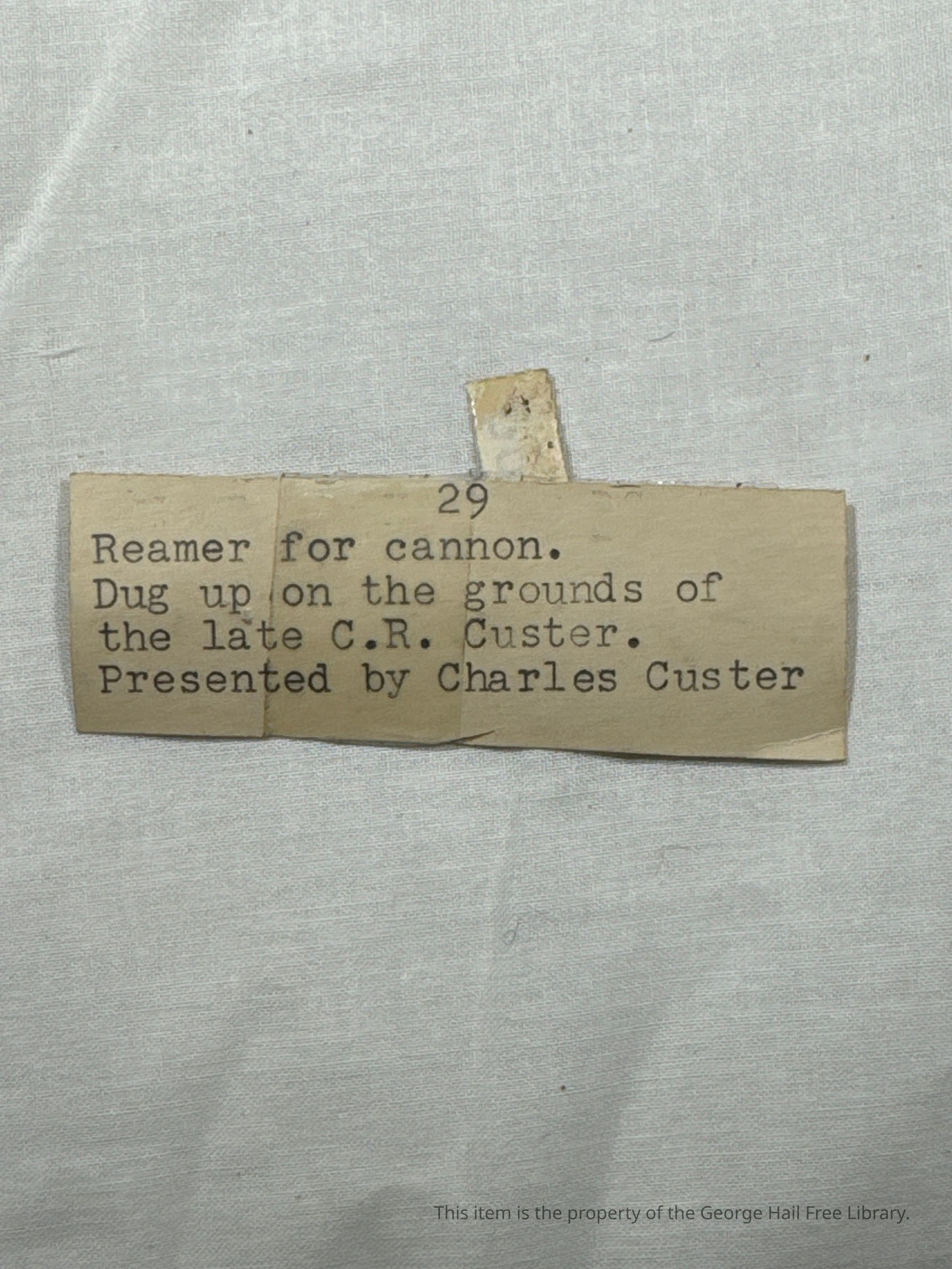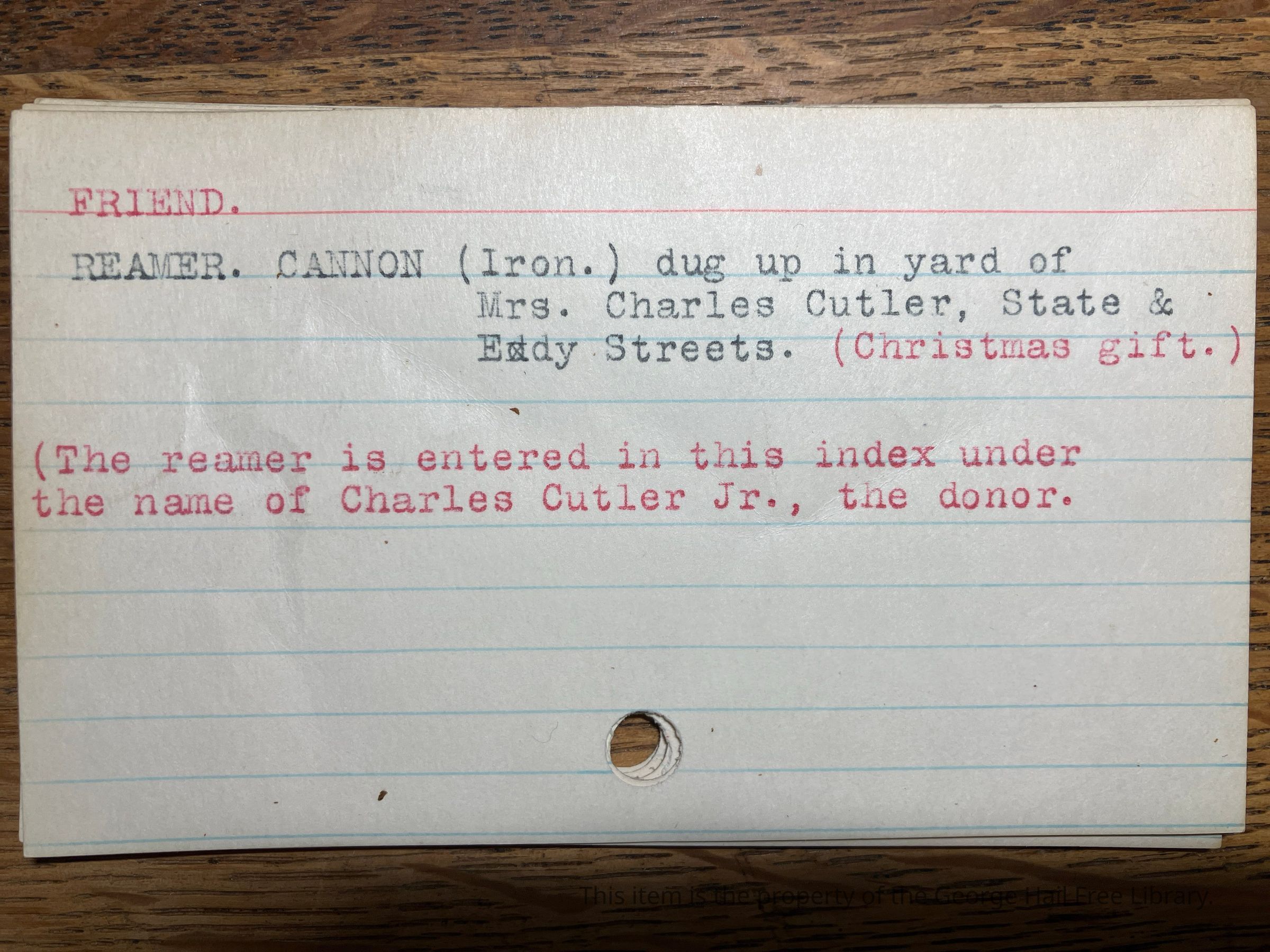 Reamer, Cannon (Iron.) dug up in yard of Mrs. Charles Cutler, State & Eddy Streets (Christmas gift.)Context