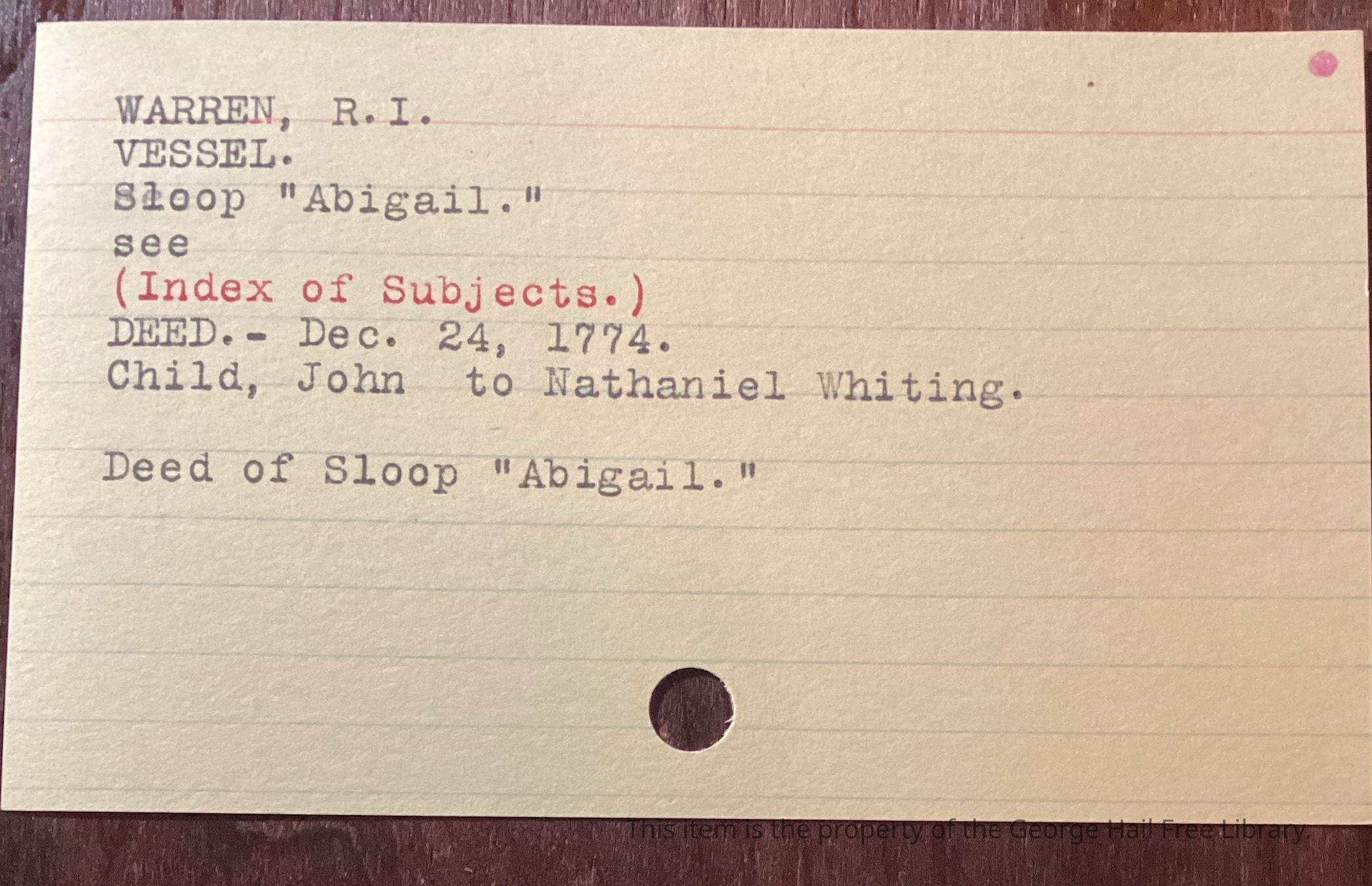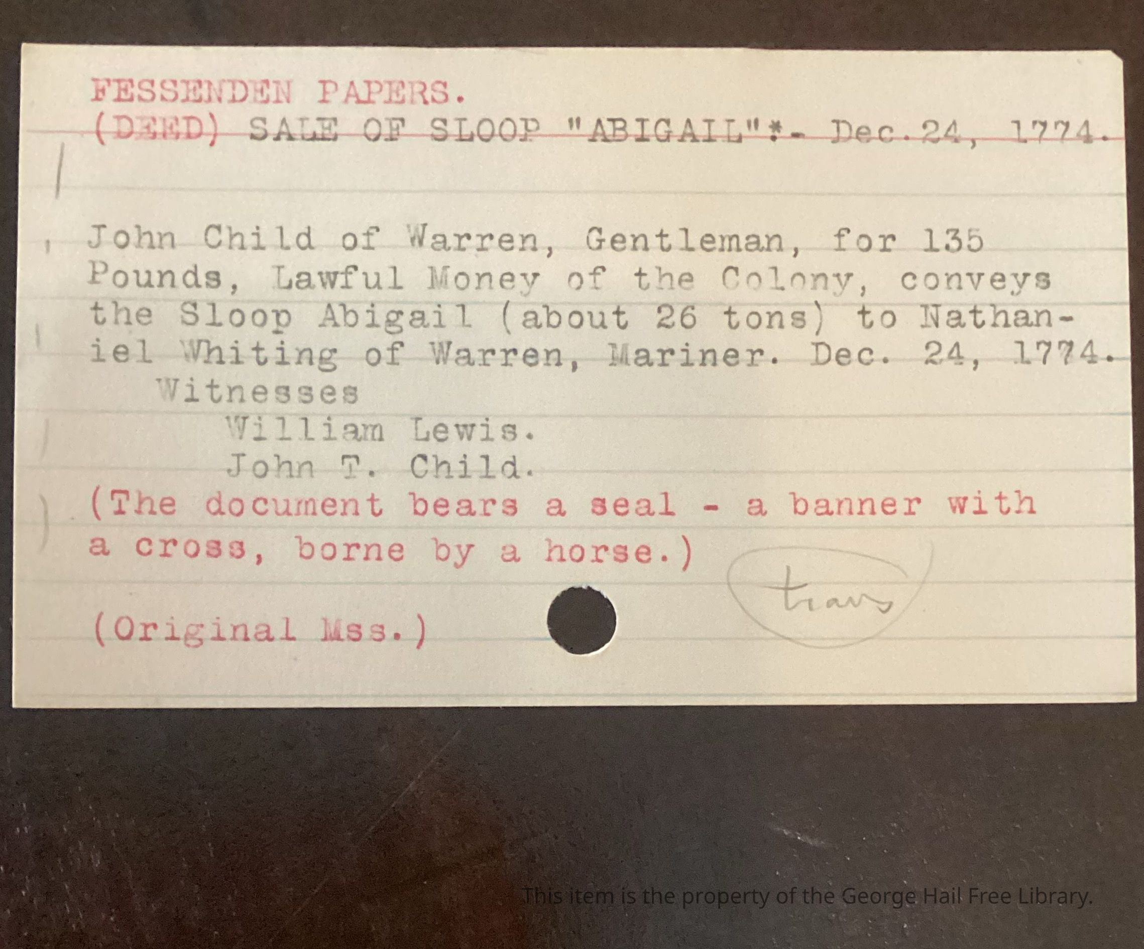Bill of sale for ship “Abigail”. Mentions John Child of Warren and Nathaniel Whiting. “Abigail” notable for transporting POWs from Yorktown to RI. The ship’s Master was John Haile of Warren, RI.Context
