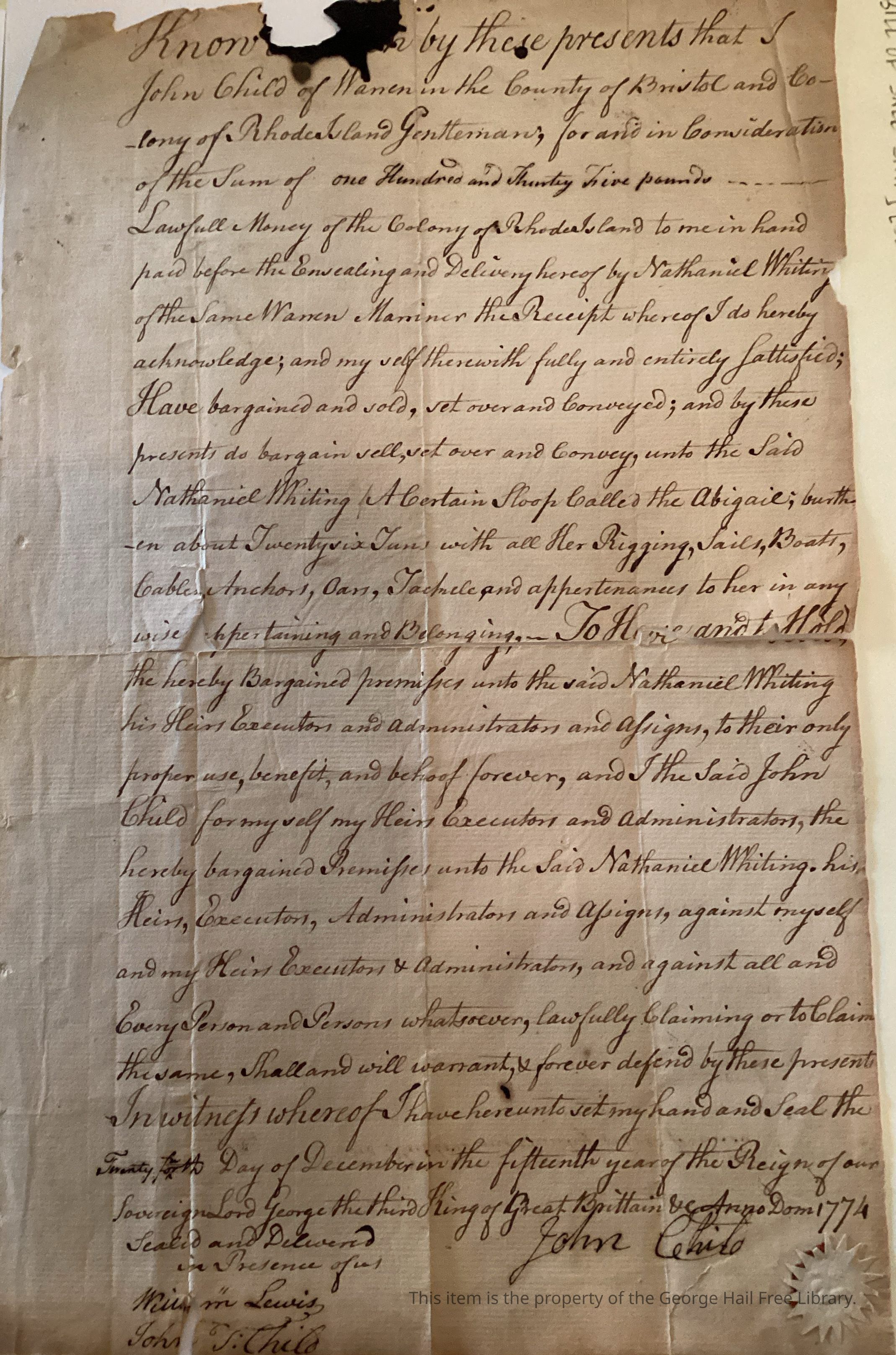 Know [illegible] by these presents that I John Child of Warren in the County of Bristol and Colony of Rhode Island Gentlemen; for and in Consideration of the Sum of one Hundred and Thirty Five pounds Lawfull [LAWFUL] Money of the Colony of Rhode Island to me in hand paid before the Ensealing and Delivery hereof by Nathaniel Whiting of the Same Warren Mariner the Receipt whereof I do hereby acknowledge; and my self therewith fully and entirely Sattisfied [SATISFIED]; Have bargained and sold, set over and Conveyed; and by these presents do bargain sell, set over and Convey, unto the Said Nathaniel Whiting. A Certain Sloop Called the Abigail; burthen [BURDEN] about Twenty six Tuns [TONS] with all Her Rigging, Sails, Boats, Cables, Anchors, Oars, [TACKLE?], and appertenances [APPURTENANCES] to her in any wise appertaining and Belonging, To Have and to Hold the hereby Bargained premises until the said Nathaniel Whiting his Heirs Executors and Administrators and Assigns, to their only proper use, benefit, and behoof forever, and I the Said John Child for myself my Heirs Executors and Administrators, the hereby bargained Premises unto the Said Nathaniel Whiting, his Heirs, Executors, Administrators and Assigns, against myself and my Heirs Executors & Administrators, and against all and Every Person and Persons whatsoever, lawfully Claiming to Claim the same, Shall and will warrant, & forever defend by these presents.