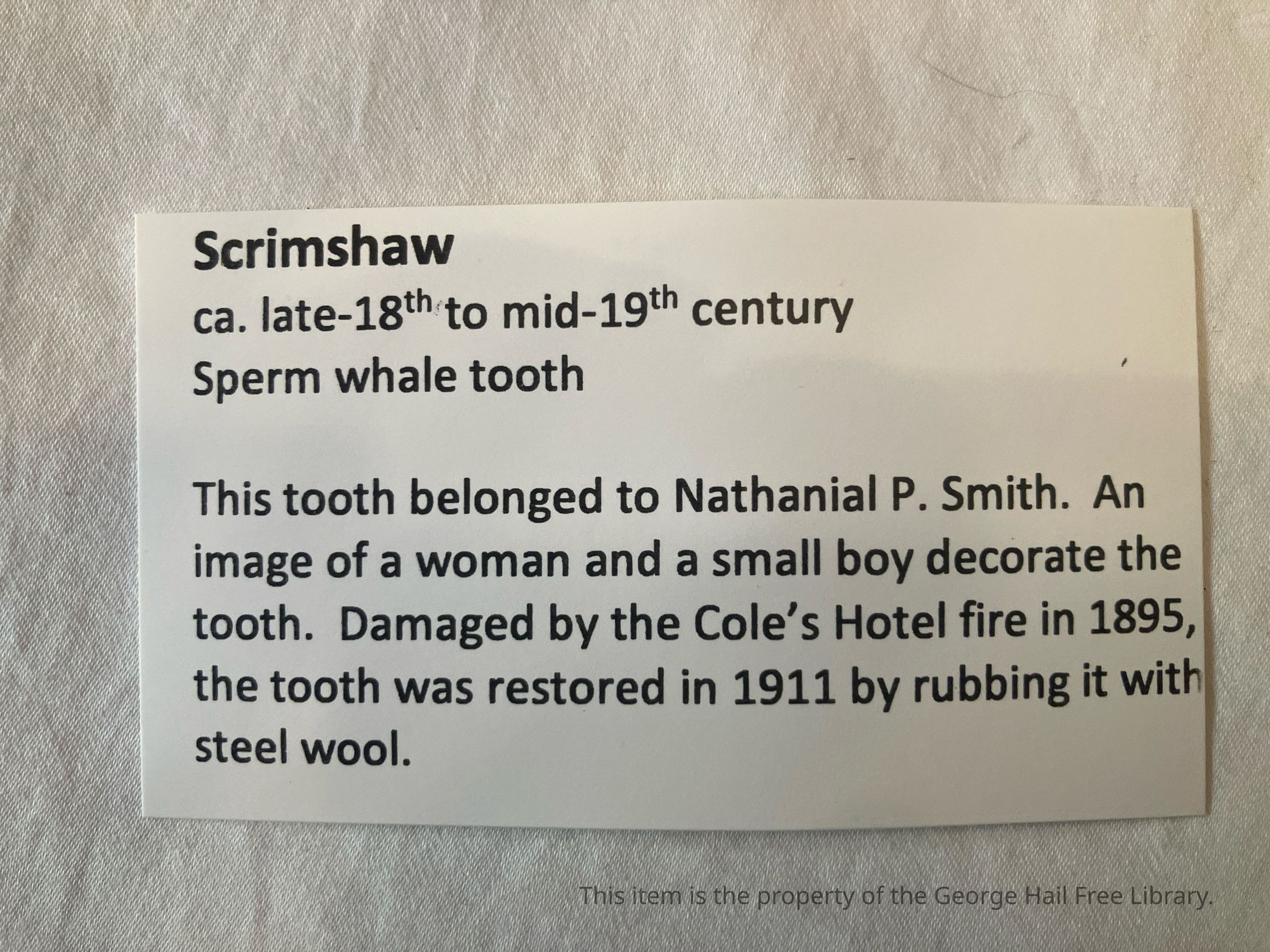 This tooth belonged to Nathanial P. Smith. An image of a woman and a small boy decorate the tooth. Damaged by the Cole's Hotel fire in 1895, the tooth was restored in 1911 by rubbing it with steel wool.Use