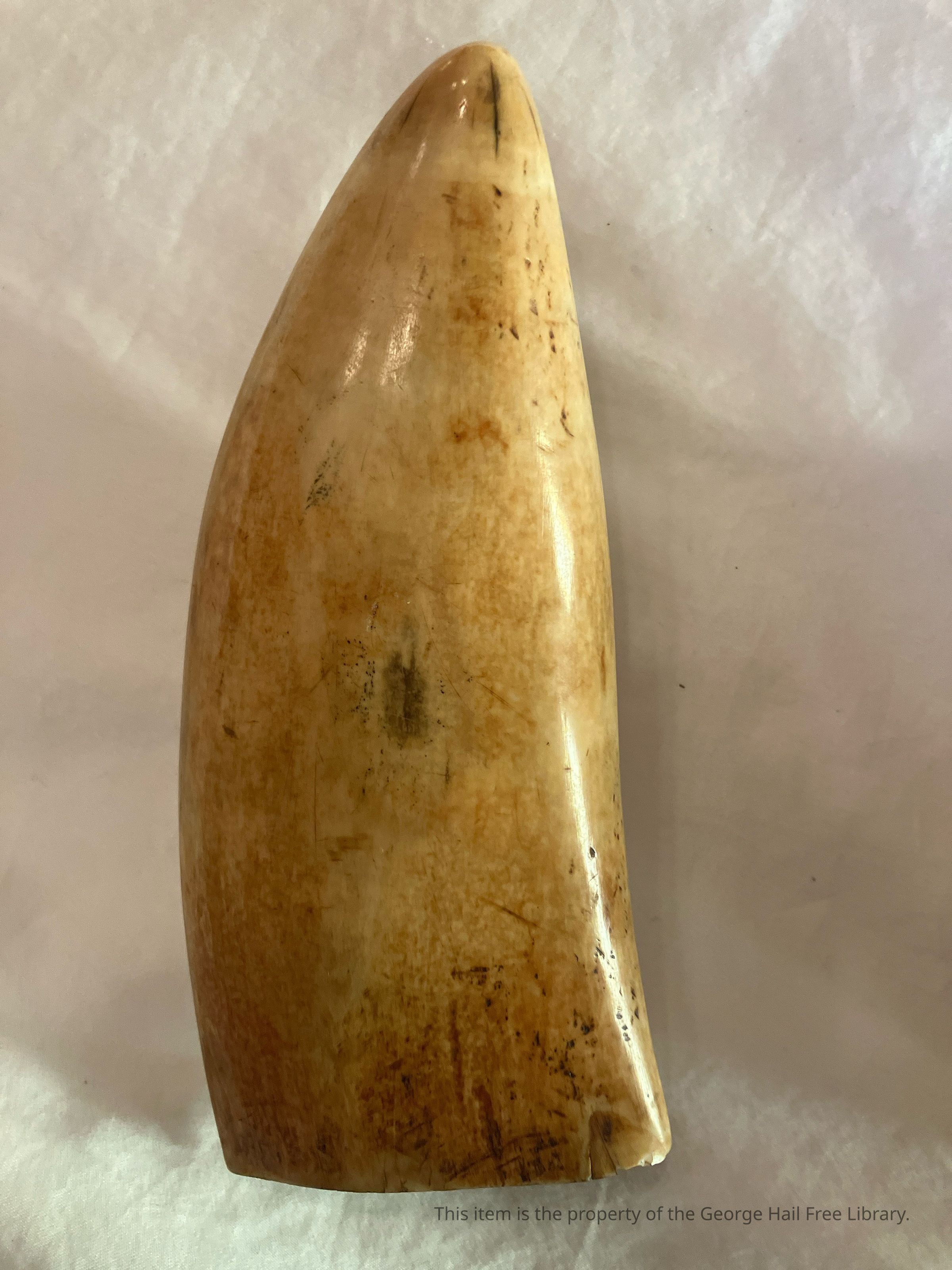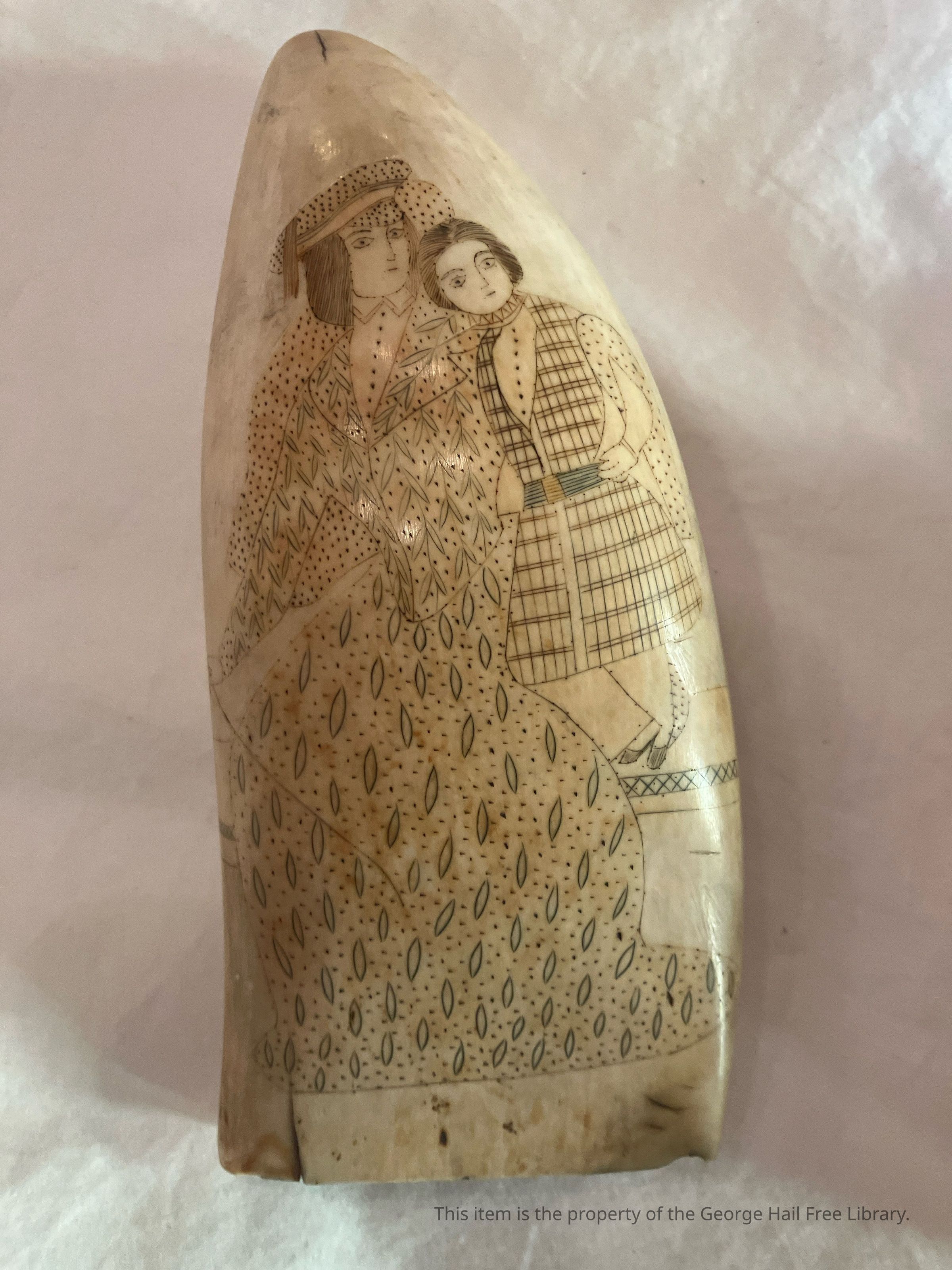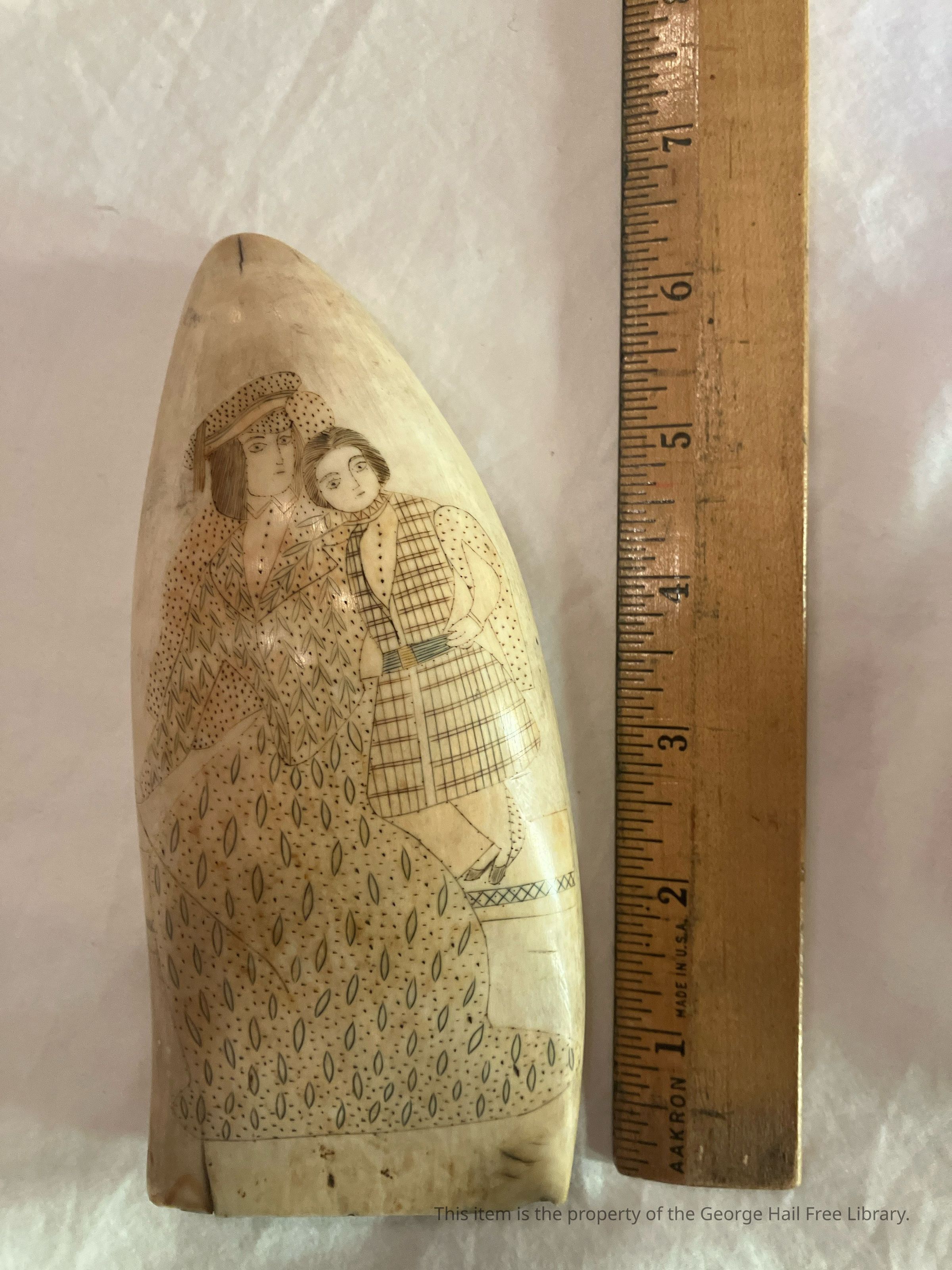 Scrimshaw is scrollwork, engravings, and carvings done in bone, ivory, or whale products such as teeth and baleen. Typically it refers to the artwork created by whalers, engraved on the byproducts of whales. It is most commonly made out of the bones and teeth of sperm whales, the baleen of other whales, and the tusks of walruses. It takes the form of elaborate engravings in the form of pictures and lettering on the surface of the bone or tooth, with the engraving highlighted using a pigment, or, less often, small sculptures made from the same material. (Some content from Wikipedia: https://en.wikipedia.org/wiki/Scrimshaw)