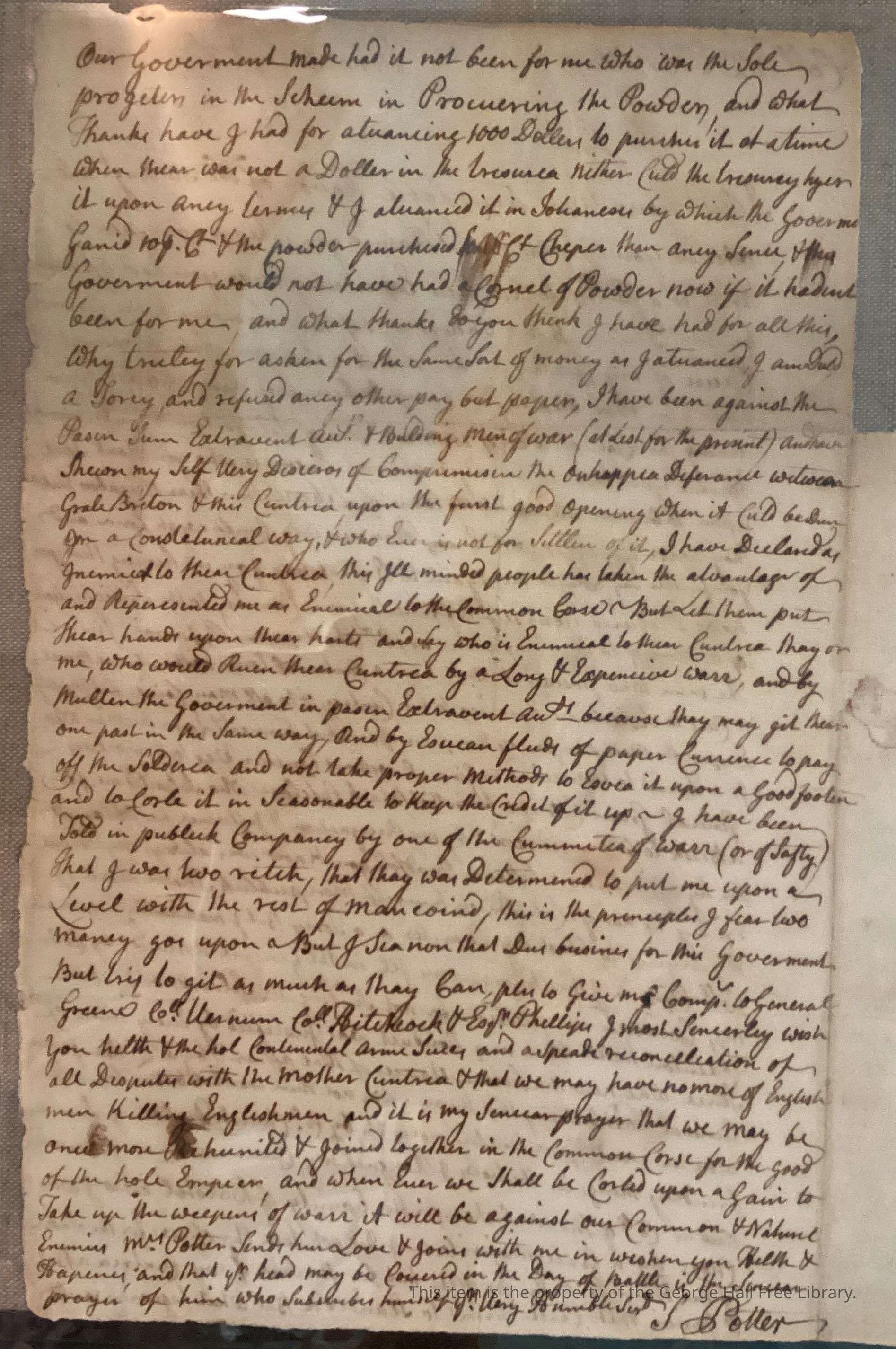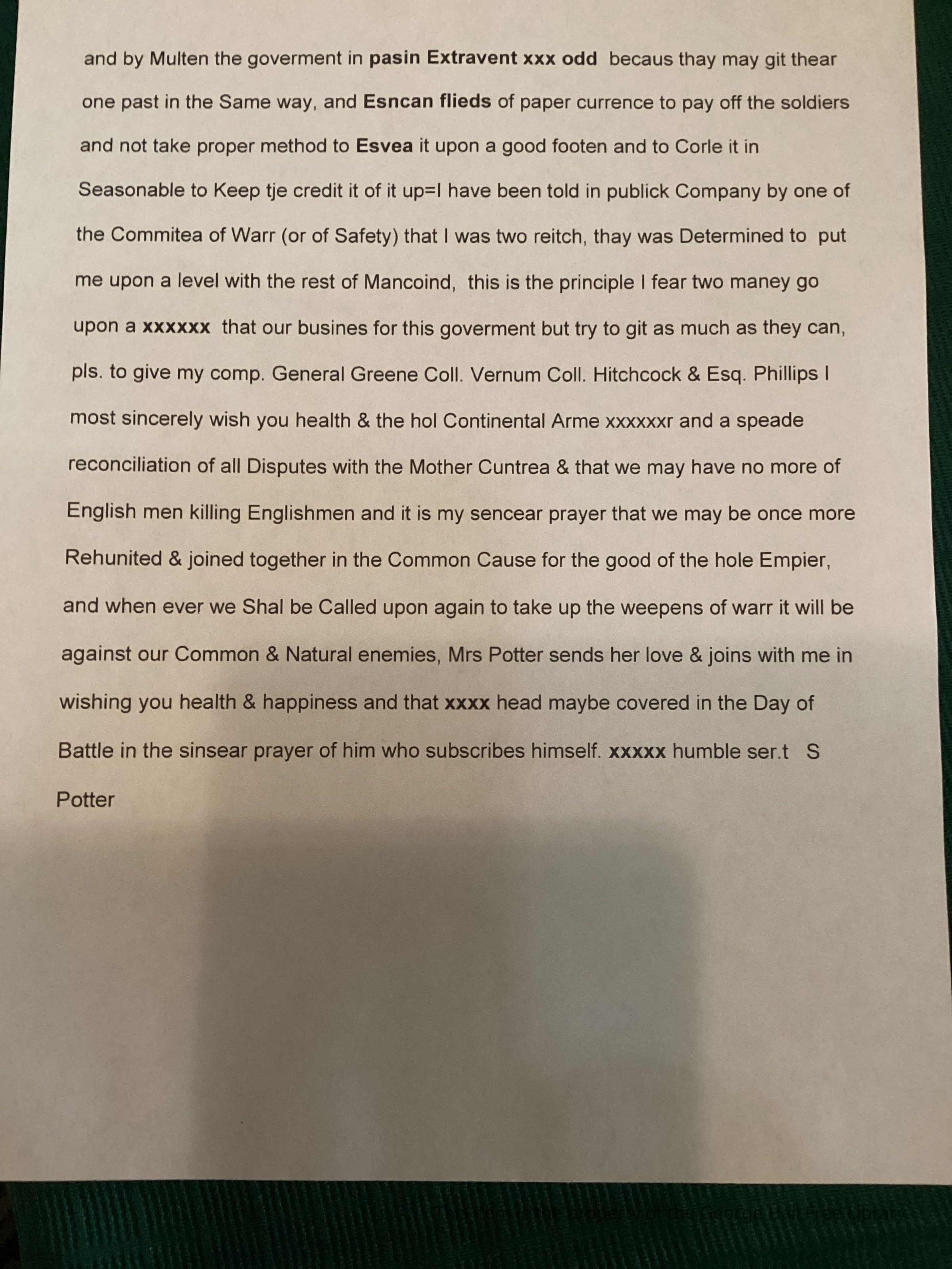 our government made had it not been for me who was the sole progeten [progeny] in the scheme in procuering [procurring] the powder, and what thanks have I had for atuaneing [attaining] 1000 dollars to purches [purchase] it at a time when there was not a dollar in the tresurea [treasury] neither could the tresurey [treasury] hyer [hire] it upon aney [any] [?] & I advanced It in Johanesy [Johannesburg?] by which the gooer me [government?] ganid [gained] 10 p. 6 & the powder purchased for 6 p. cheper [cheaper] than any since & the government would not have had a cornel [kernel] of powder now if it hadn’t been for me and what thanks do you think I have had for all this, why truley [truly] for asking for the same sort of money as I attained. I am branded a Torey and refused any other pay but paper, I have been against the [pasin] sum extra[?]ent au[?] And bulding [building] men of war (at desk for the present) and have shewn [shown] my self very deserving of compassion the onhappea [unhappy] deference witnesses Grate Breton [Great Britain] & this cuntrea [country] upon the furst [first] good opening when it culd [could] be dun [done] in a constetuneal [constitutional] way, & who ever is not for settlen [settling] of it, I have declared as inemies [enemies] to thear cuntrea [their country]. This ill minded people have taken the advantage of and represented me as enemical to the common cose [cause]. But let them put thear [their] hands upon thear harts [their hearts] and say who is enemical to thear cuntrea thay [their country]? Thay [They] or me, who would ruen thear cuntrea [ruin their country] by a long & expensive warr, and by [multen?] the goverment [government] in pasin extravent [passion extravagant] au[?] because they may git thear [get their] one past in the same way, and by [esuean?] fluds [floods] of paper currence [currency] to pay off the [soldiers] and not take proper methods to [eovea?] it upon a good footen [footing] and to [corse?] it in seasonable to keep [crdel?] Fil up -- I have been told in publick [public] company by one of the cummetea of warr (or of safty) that I was too ritch [rich], that thay [they] was determened [determined] to put me upon a level with the rest of man coind [mankind], this is the prenceples [principles] I fear two maney [too many] go upon. But I sea non [sea non] that due busines [do business] for this government. But try to git [get] as much as thay [they] can, [ply] to give my compls [compliments] to the General Greene, Coll. [Colonel] [?]num, Coll. [Colonel] Hitchcock & Esn [Ensign] Phillips. I most sencerley [sincerely] wish you helth [health] & the hol [whole] Contenental Arme [Continental Army] [safety?] and a speade [speedy] reconciliation of all disputes with the mother cuntrea [country] & that we may have no more of Englishman killing Englishman and it is my sencear [sincere] prayer that we may be once more rehunited [reunited] & joined together in the common corse [cause] for the good of the whole empeer [empire], and when ever we shall be [called] upon again to take up the weepons [weapons] of warr [war] it will be against our common & natural enemies. Mr. Potter sends his love & joins with me in wishin [wishing] you helth [health] and hapines [happiness], and that yrs [years] head may be covered in the day of battle is the sincear [sincere] prayer of him who subscriber himself [?]