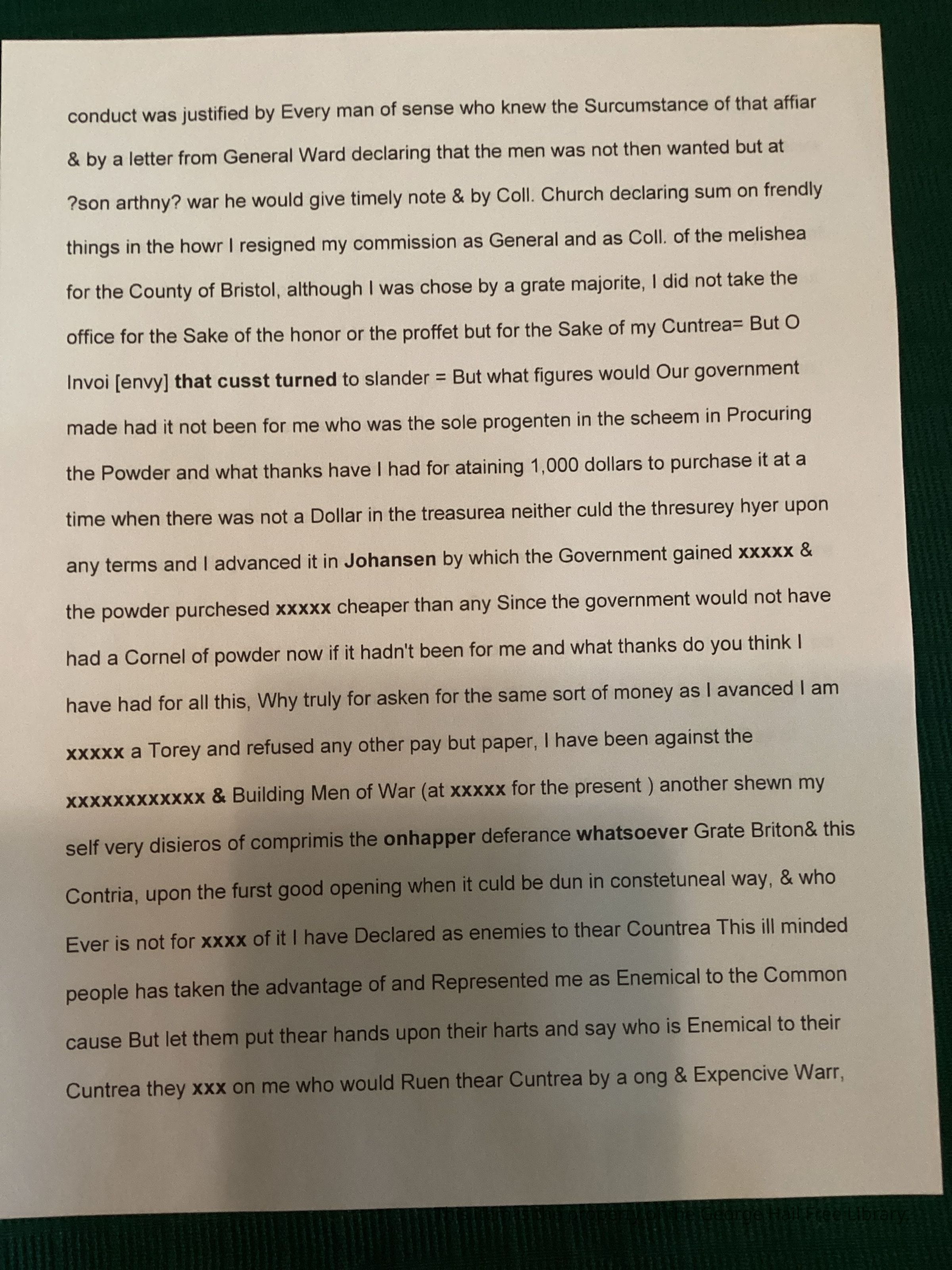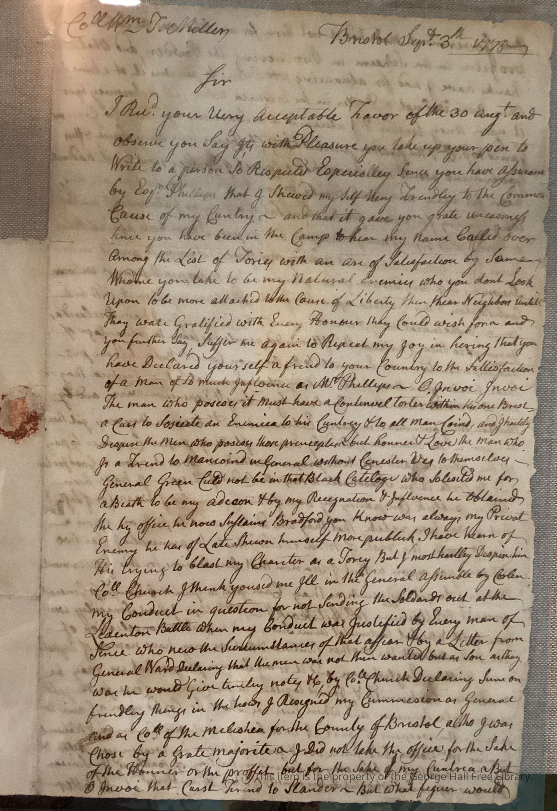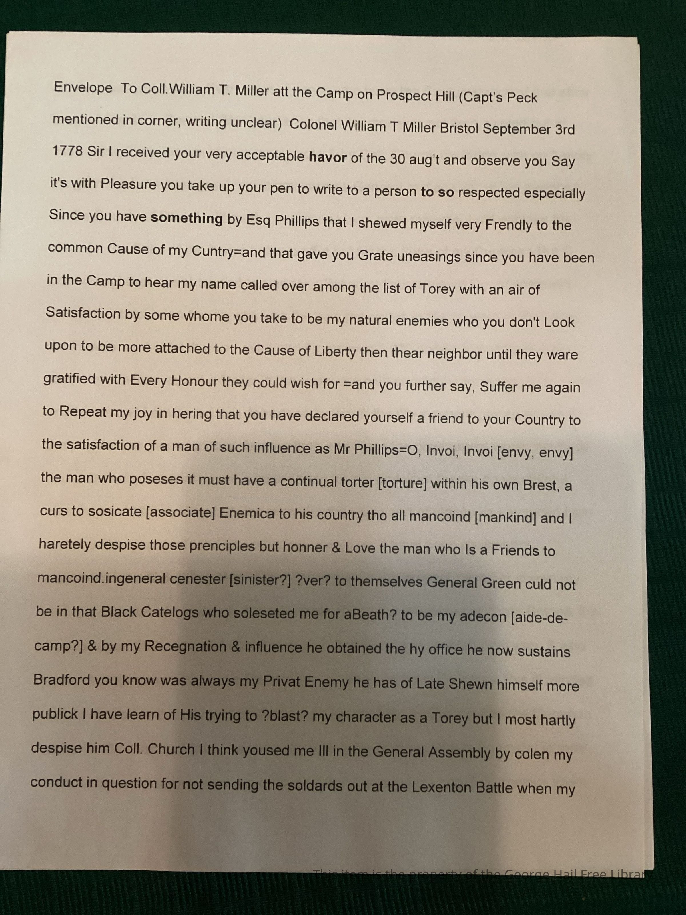 I Recd [received] your very acceptable favor of the 30 Augt [August] and observe you say sir [?] with pleasure you take up your pen to write to a person so respected especially since you have assurance by Ensn. [Ensign] Phillips that I showed myself very friendly to the common cause of the country and that it gave you great uneasiness since you have been in the camp to hear my name called over among the list of Tories with an arc of satisfaction by some whome [whom] you take to be my natural enemies who you don’t look upon to be more attached to the cause of liberty than their neighbors until they were gratified with every honour they could wish for and you further say suffer me again to repeat my joy in hearing that you have declared yourself a friend to your country to the satisfaction of a man of so much influence as [Major] Phillips -- O. Invoi Invoi [O Envoi Envoi]. The man who possesses it must have a continual tarter within his one brest [breast] a curs [curse] to sosieate [society] an enemiea [enemy] to his cuntrey [country] and to all mancoind [mankind], and ghastly despise the men who posese [possess] those prenceples [principles] but honner [honor] & love the man who is a frend [friend] to mancoind [mankind] in general without cenester [sinister] [view] to themselves. General Green [culd] could not be in that black cateloge [catalog] who solisited [solicited] me for a beath to be my adeson & by my resignation & influence he obtained the high office he now sustains. Bradford you know was always my privat [private] enemy he has of late shown himself more publick [public] I have hearn of his trying to blast my character as a Torey but I most hartley [heartily] despise him. Coll. [Colonel] Church I think you sd [said] me ill in the general assembly by corlen [calling] my conduct in question for not sending the soldiers out at the Lexenton [Lexington] Battle when my conduct was justified by every man of sense who new [knew] the sunken slances of that affair & by a letter from General Ward declaring that the men was not then wanted but as son [?] was he would give twenty notes and [?], by Coll. [Colonel] Church declaring some on frendley [unfriendly] things in the hows [house], I resigned my commission as general and as Coll. [Colonel] of the melishea [militia] for the County of Bristol, altho [although] I was chose [chosen] by a grate majorite [great majority] I did not take the office for the sake of the honor or the proffit but for the sake of my cybtrea [country]. But I invoi that curst [cursed] friend to slander. But what seguer would