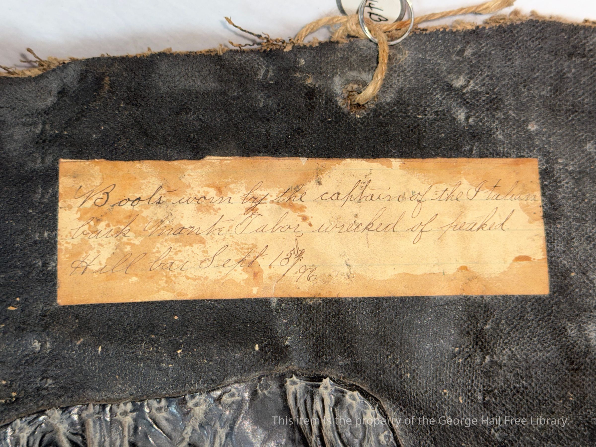 "Boots worn by the captain of the Italian bark Monte Tabor of[f] peaked Hill bar Sept. 13th / ‘96."Clothing/Dress/Costume Details