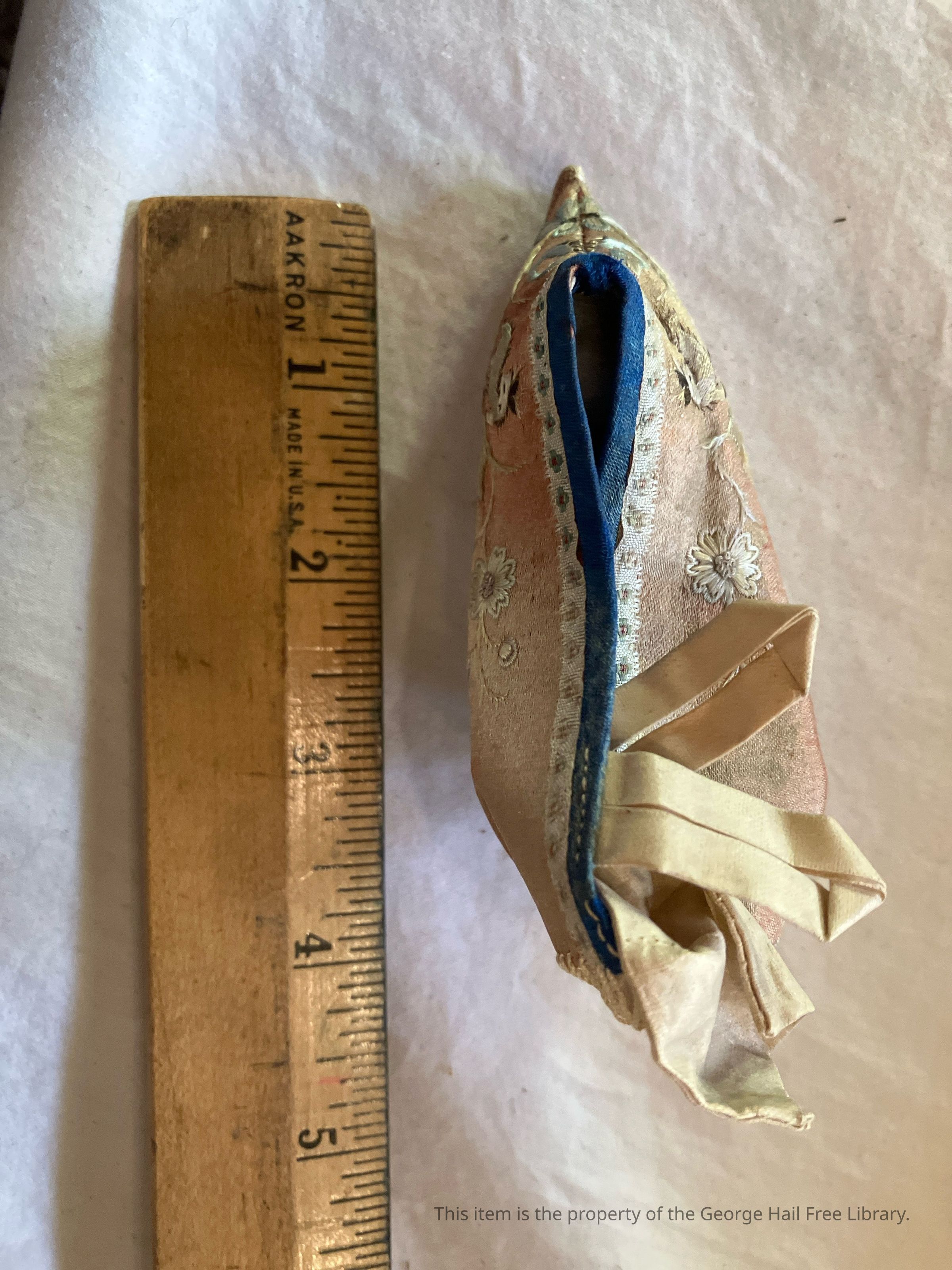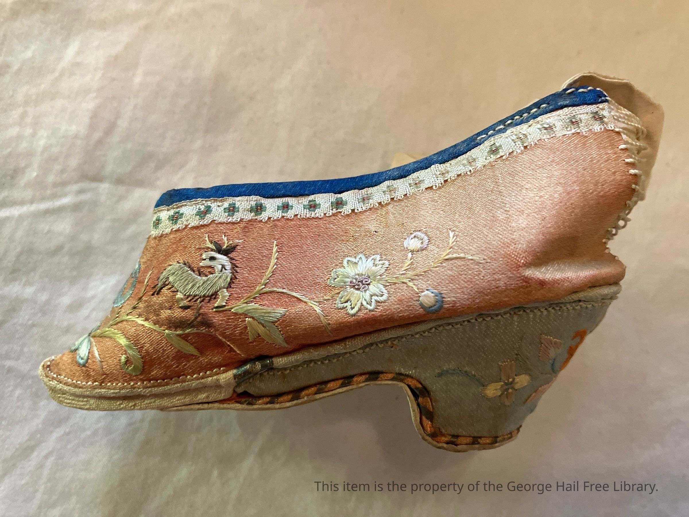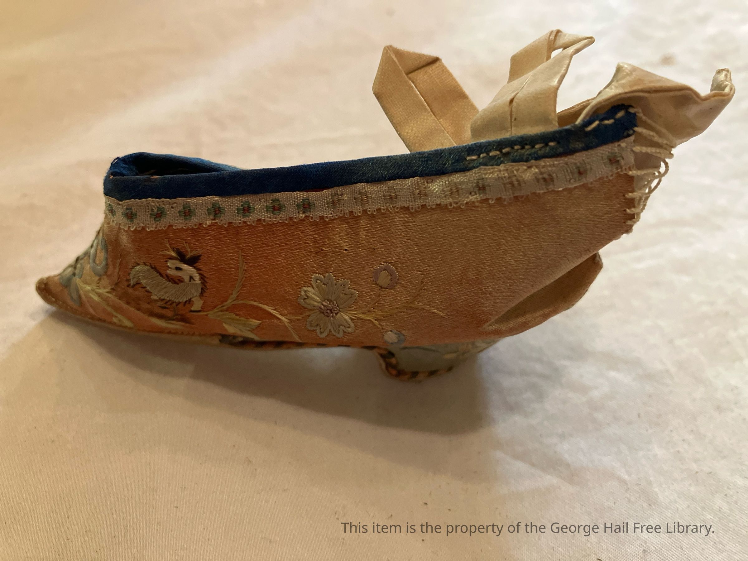 A small embroidered shoe made of pink silk, linen, and leather.Use