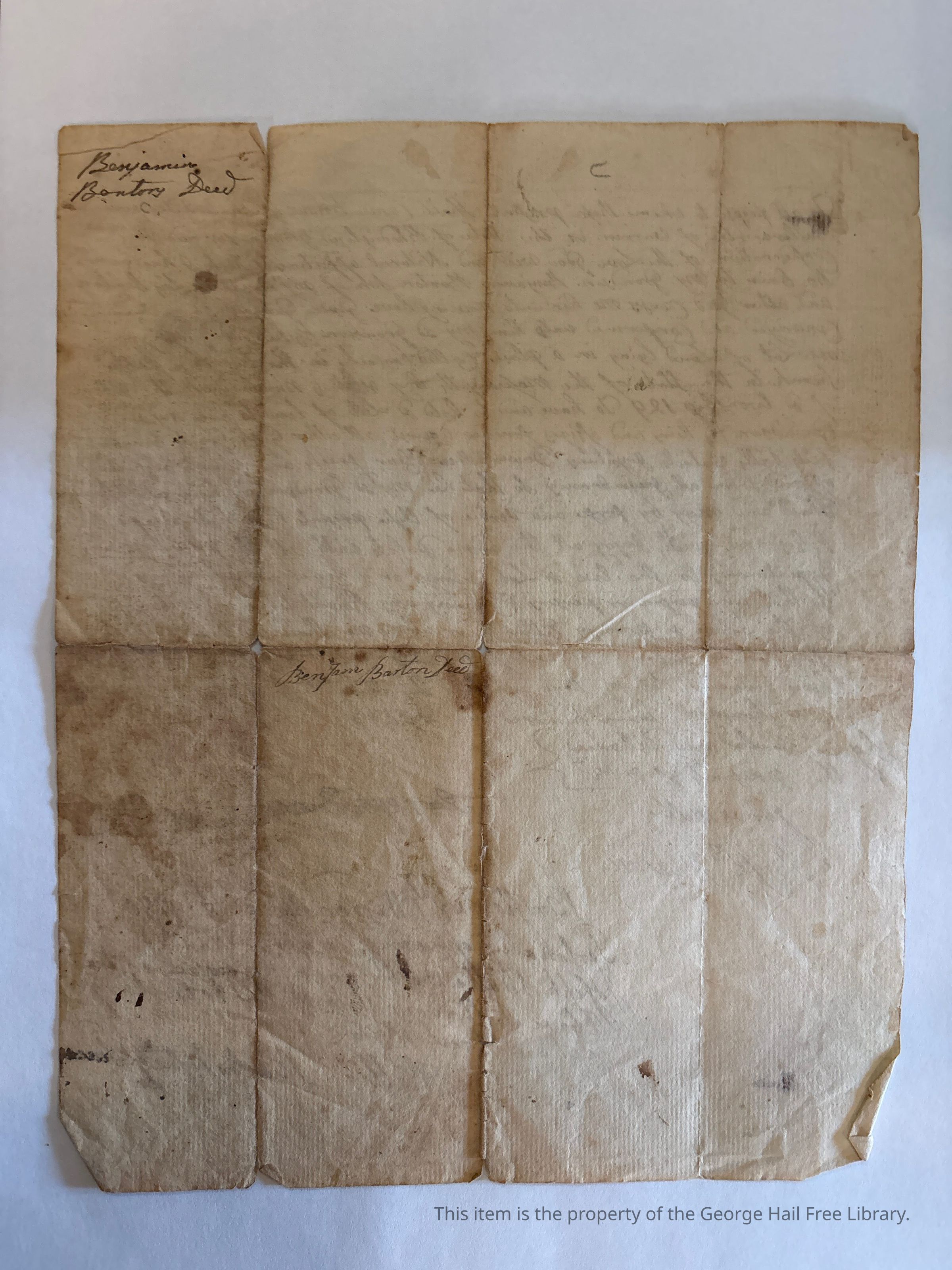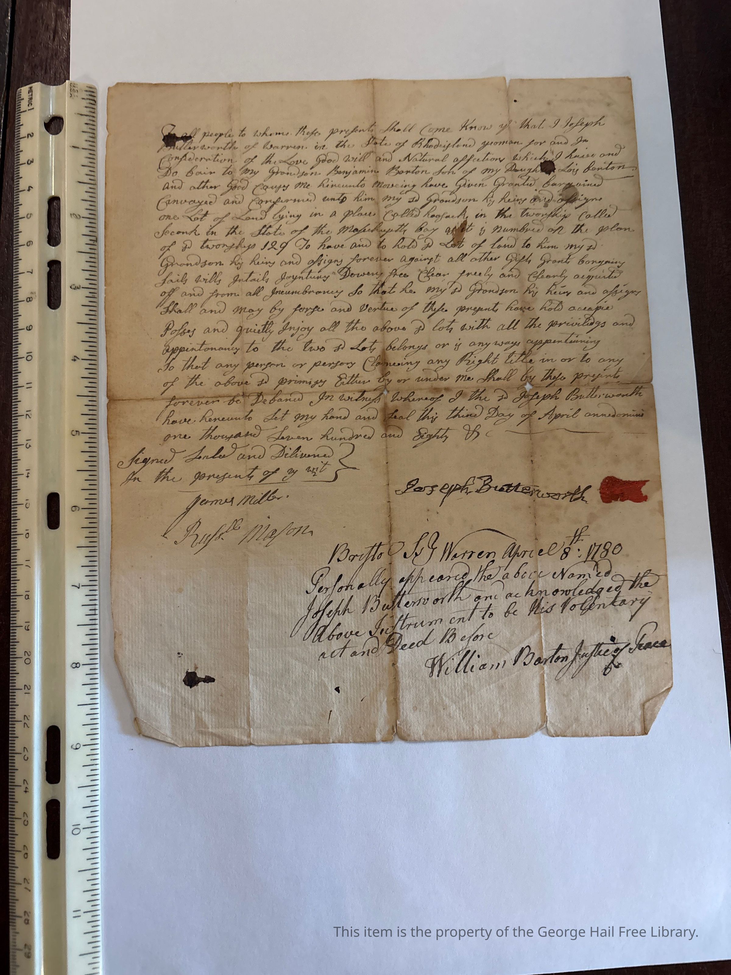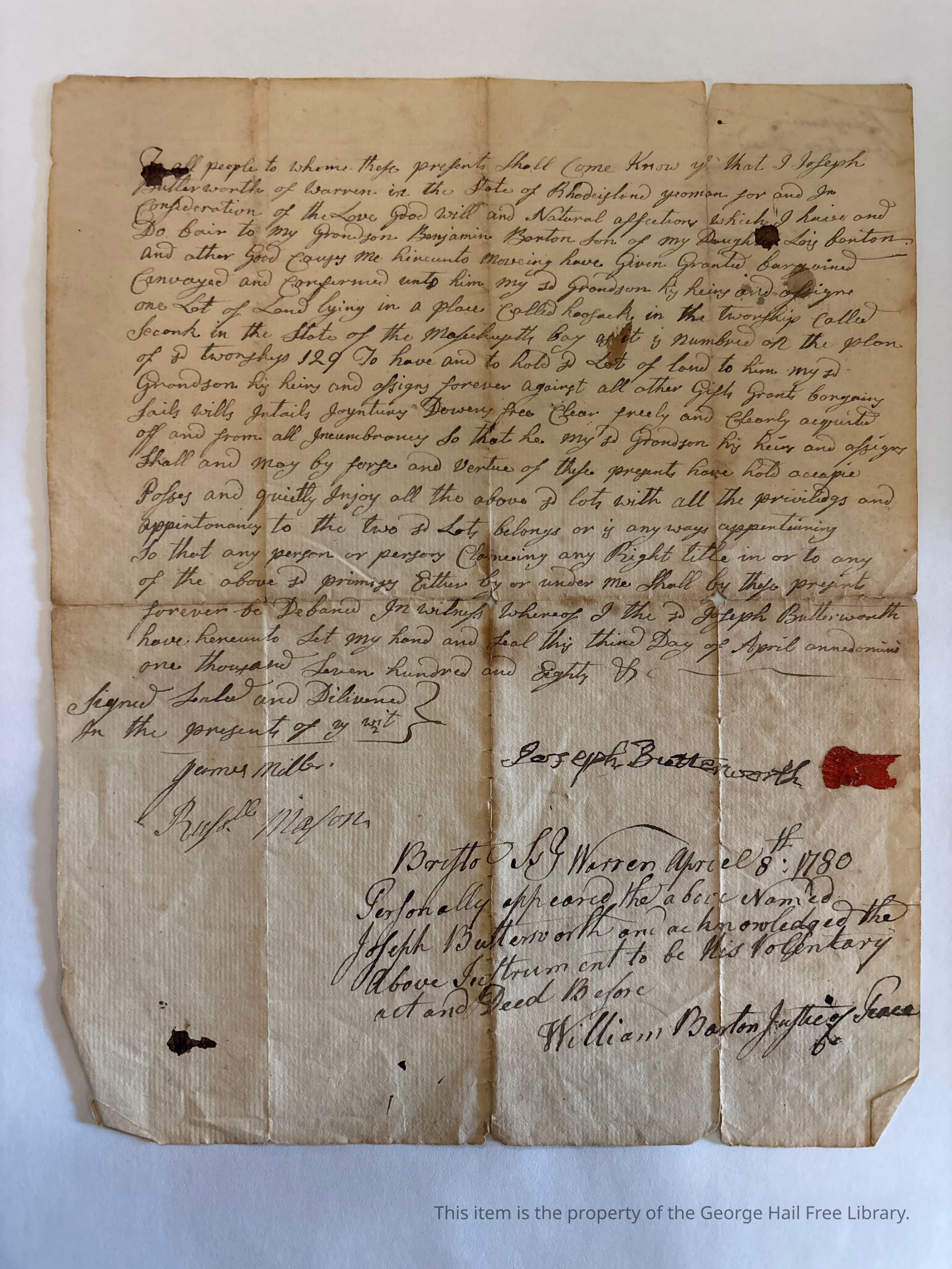To all people to whom these presents shall come know ye that I Joseph Butterworth of Warren in the State of Rhode Island yeoman for and in consideration of the love good will and and natural affection which I have and do fair to my grandson Benjamin Barton son of my daughter Lois Barton and other good causes me to hereunto moveing have given granted bargained conveyed and confirmed unto him my grandson his heirs and assigns one lot of land lying in a place called hoosack in the township called Seconk [Seekonk] in the State of Massachusetts Bay as it is numbered on the plan of said township 129 to have and to hold said lot of land to him my said grandson his heirs and assigns forever against all other gifts grants bargains sails wills intails [illegible phrase] free clear freely and clearly acquited off and from all incumbrancy so that he my said grandson his heirs and assigns shall and may by serve and vertue of these presents have hold occupie posses and quietly injoy all the above said lots with all the privilidgs and appertonances to the two said lots belongs or [?] anyways appertaining so that any person or persons claiming any right title in or to any of the above said primises either by or under me shall by these presents forever be [defamed?] in witness whereof I the said Joseph Butterworth have hereunto set my hand and seal this third day of April annodomini one thousand seven hundred and eight