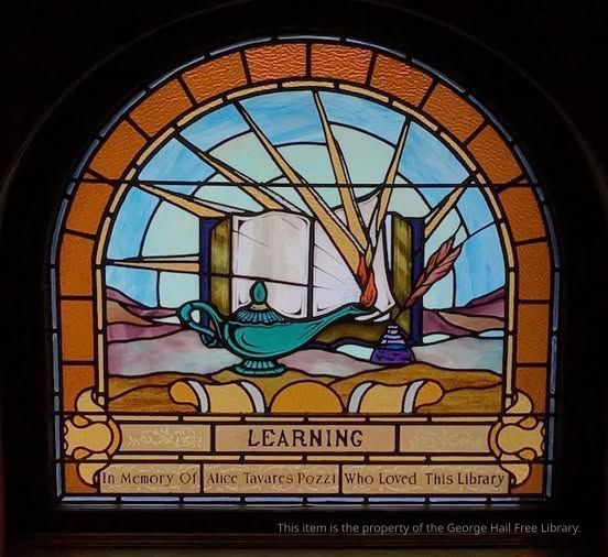 The window’s theme is Learning, and it includes a lamp emitting rays of light, a quill pen in an inkwell, and a book. The dedication at the bottom of the window states, “In Memory of Alice Tavares Pozzi Who Loved This Library”.