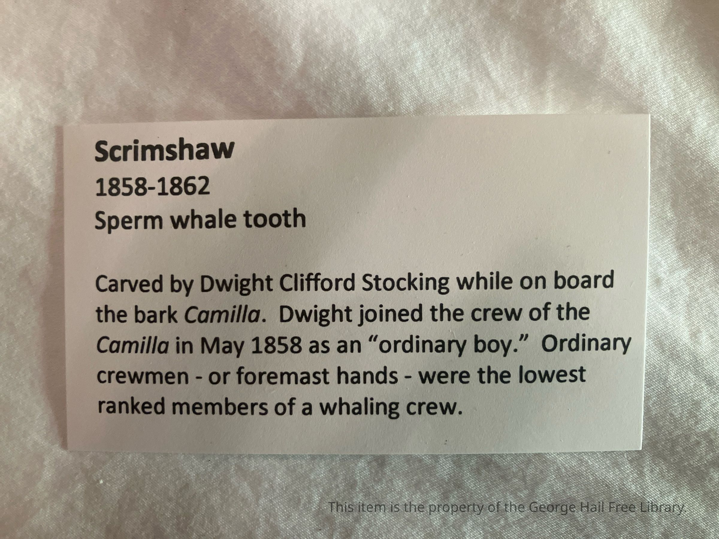 Carved by Dwight Clifford Stocking while on board the bark Camilla. Dwight joined the crew of the Camilla in May 1858 as an "ordinary boy." Ordinary crewmen - or foremast hands - were the lowest ranked members of a whaling crew.