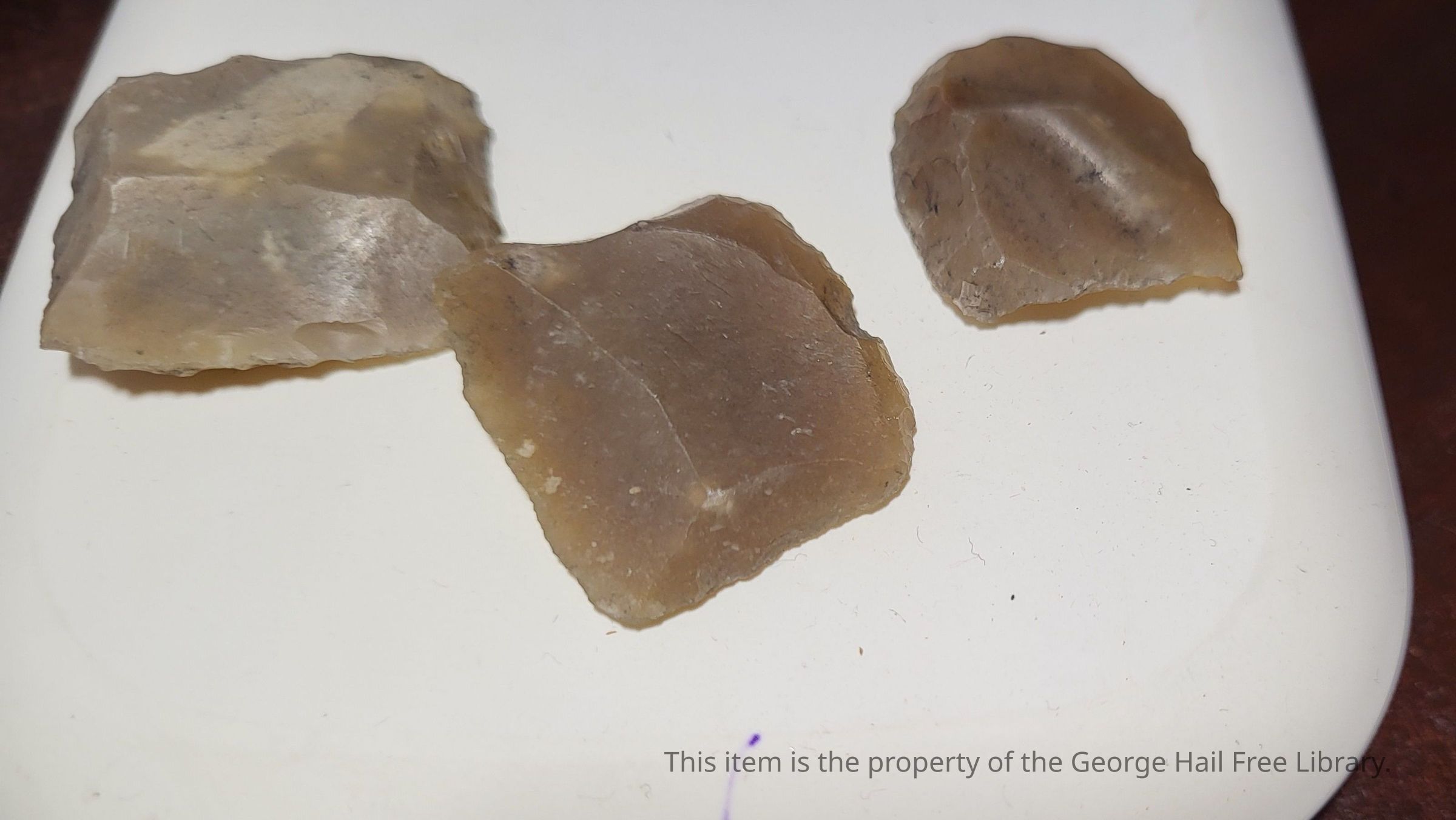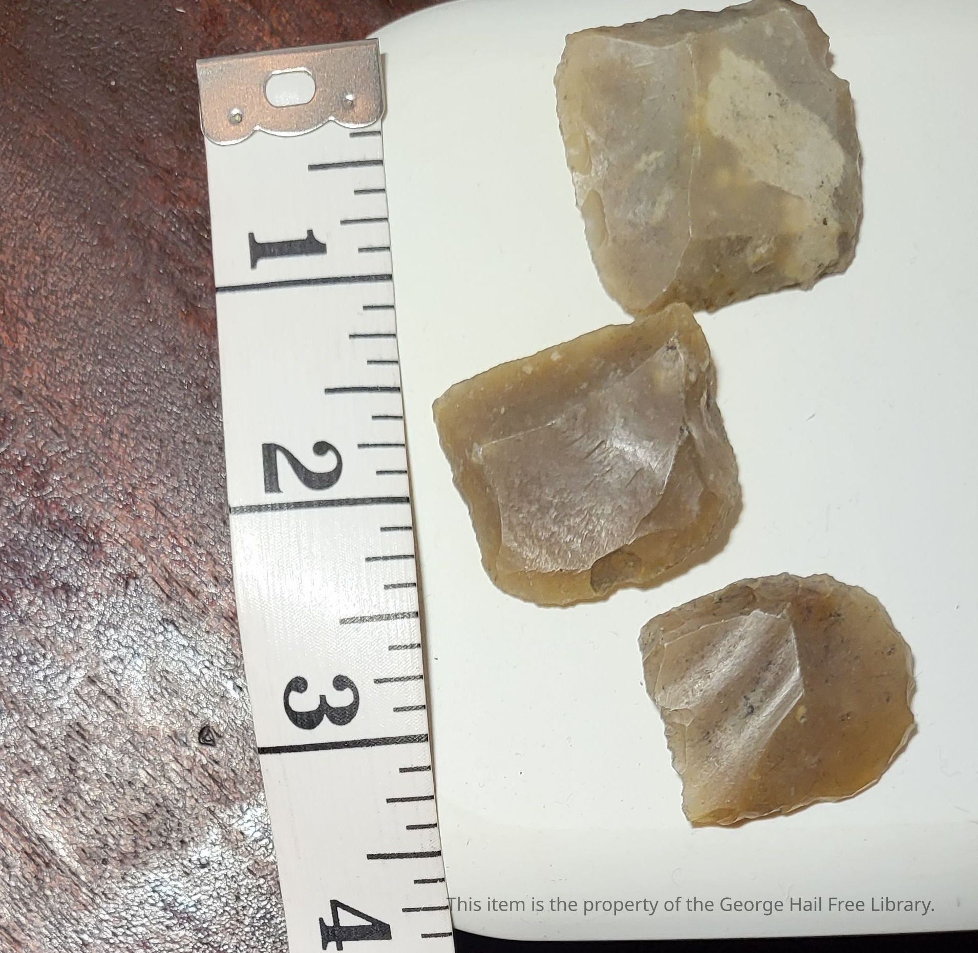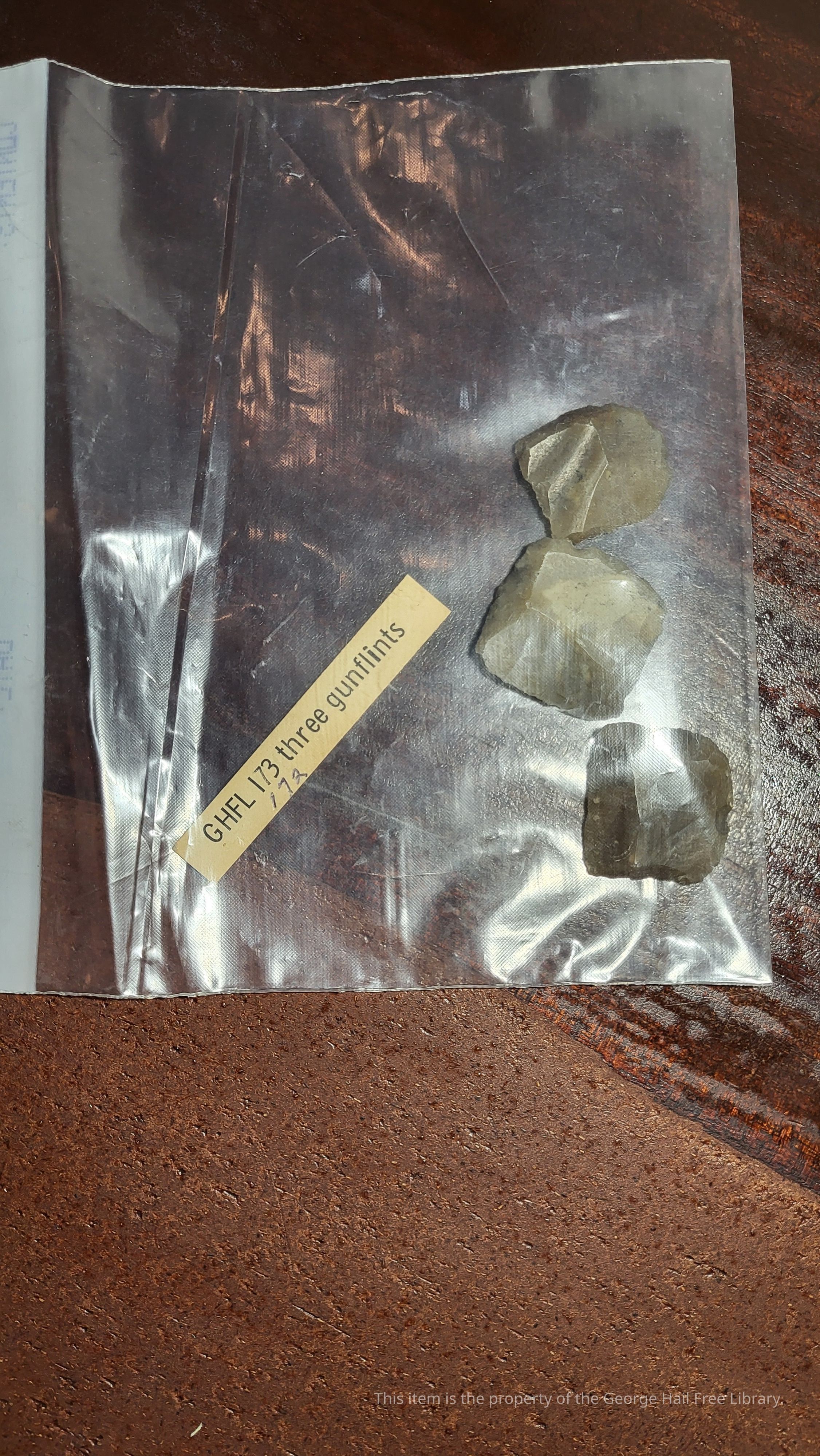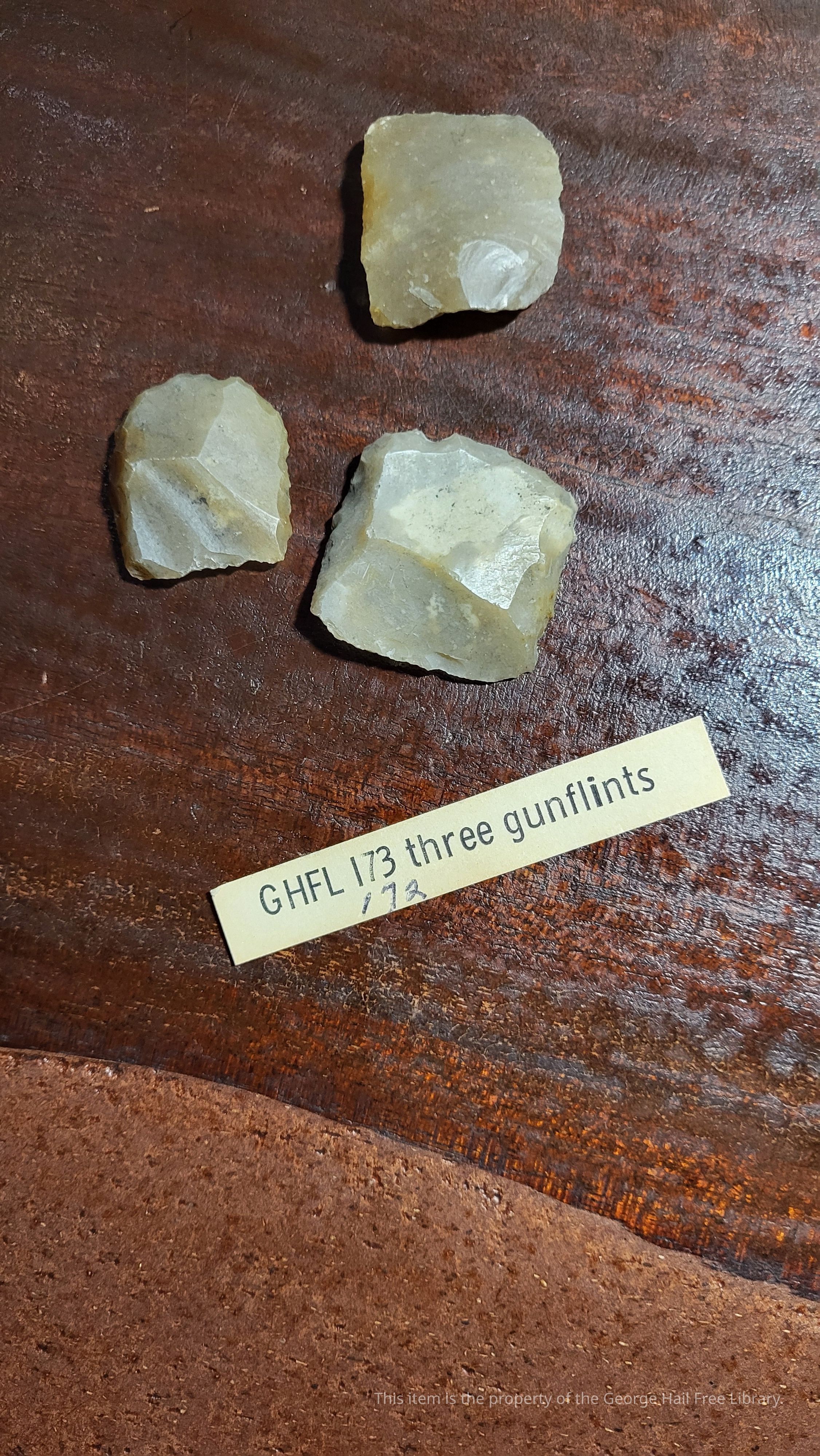 Gunflints were mounted in gun locks of flintlock rifles to strike a spark when the trigger was pulled, igniting the black powder in the pan.