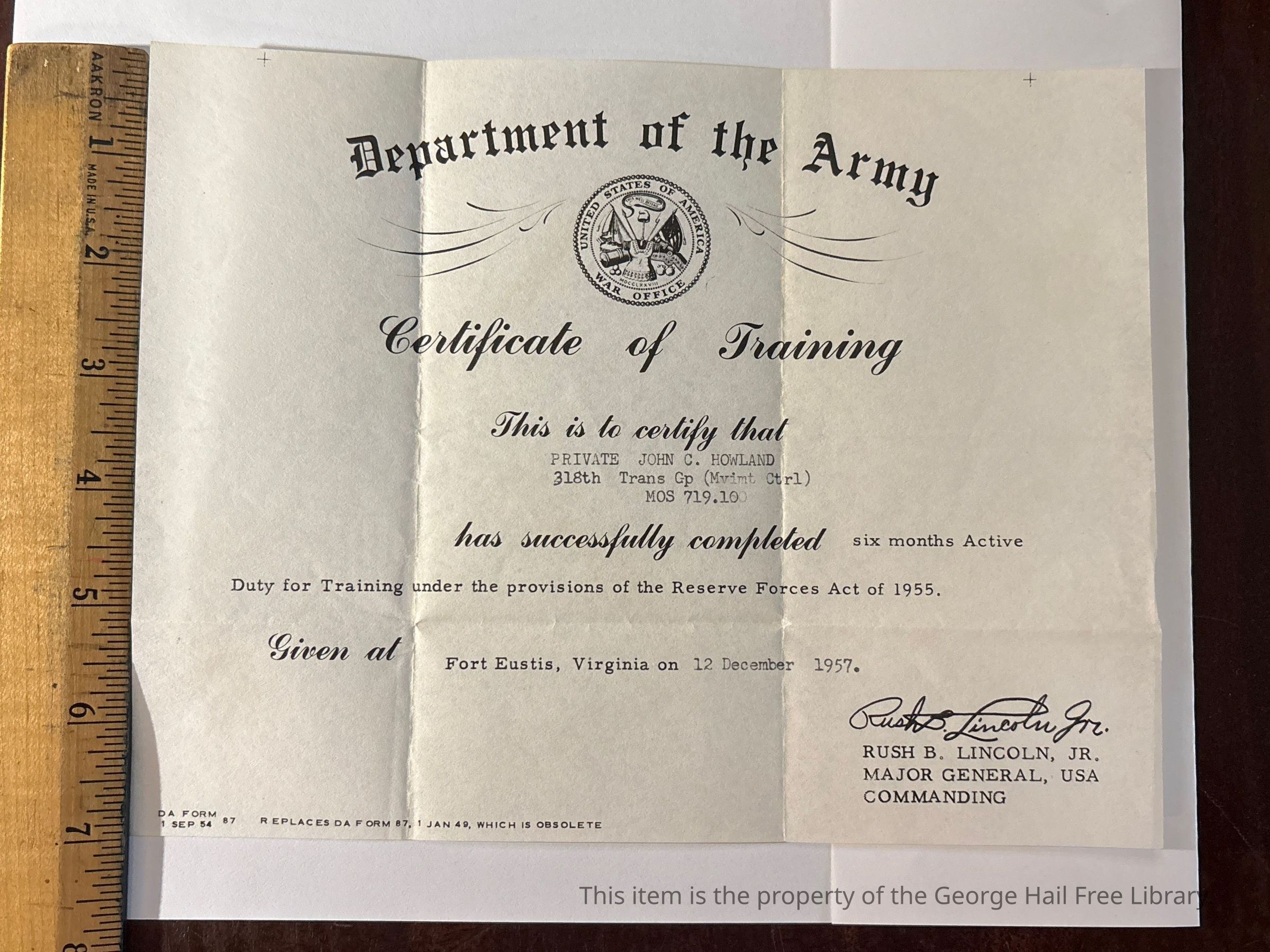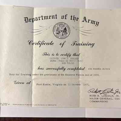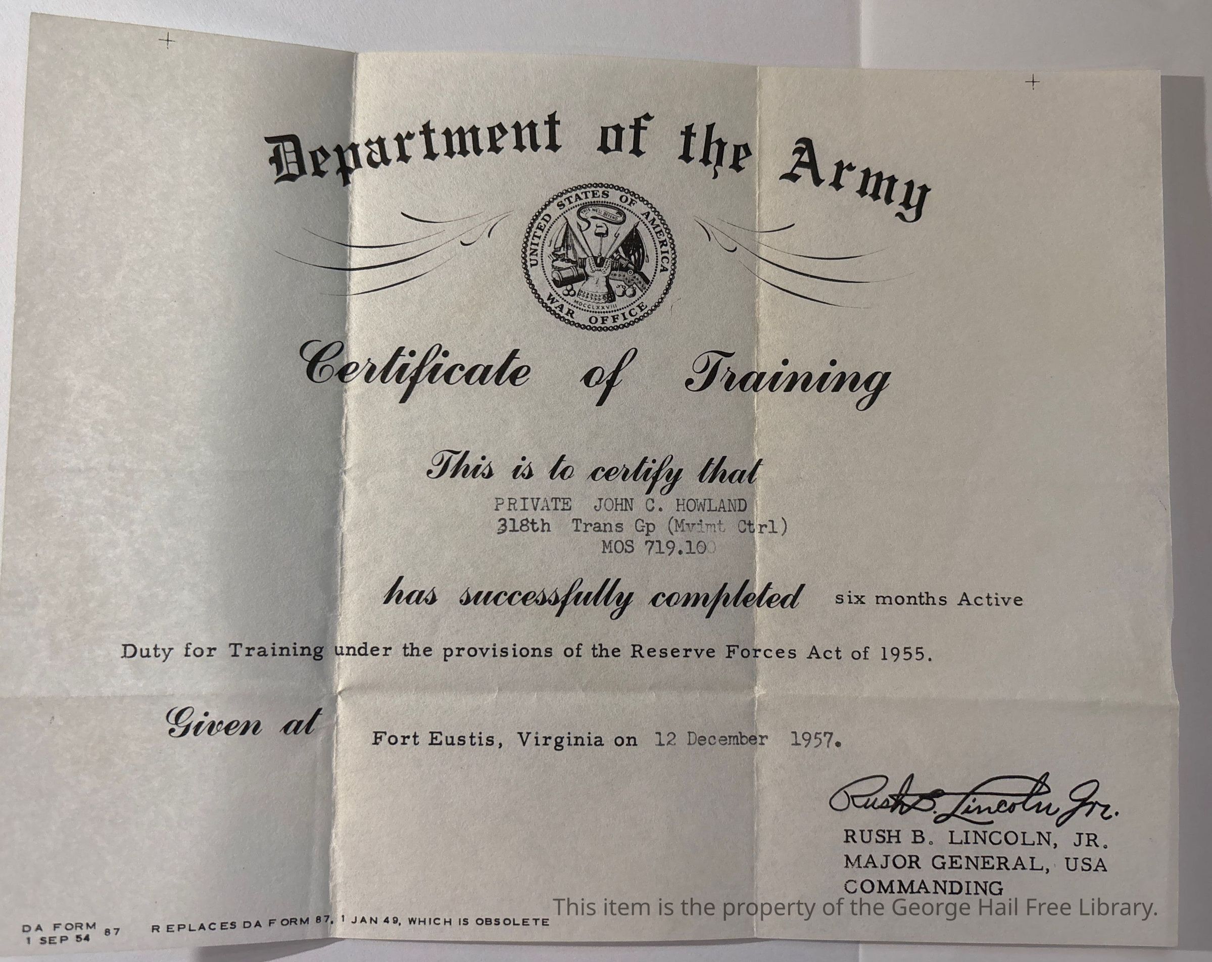 Department of the Army Certificate of Training of John Calder Howland Jr.Entry/Object ID