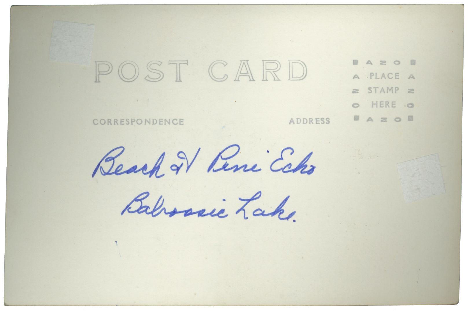 Writing on front: None. Writing on back: "Beach at Pine Echo, Baboosic Lake." Addressed to: None.