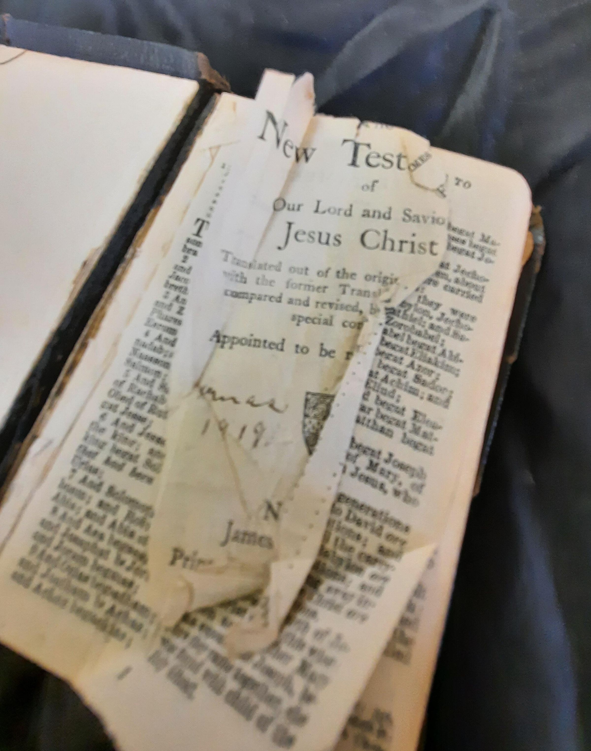 Small New Testament Bible that may have belonged to one of Samuel Melendy's descedents. A written date of 1919 can be seen on front page. Found amongst the belongings of his great-granddaughter Pearl (Hartshorn) Darling.Acquisition