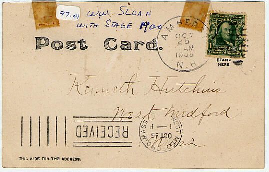 Writing on front: None. Writing on back: "W. W. Sloan with stage 1900." Addressed to: Kenneth Hutchins, West Milford, Mass.Collection