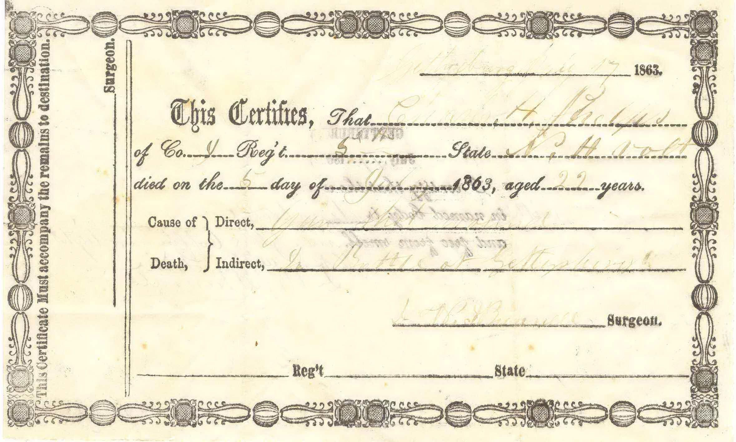 Gettysburg July 17 1863/This Certifies, That Charles H. Phelps/of Co. I Reg't 5th State N.H. volt/died on the 5 day of July 1863, aged 22 years./