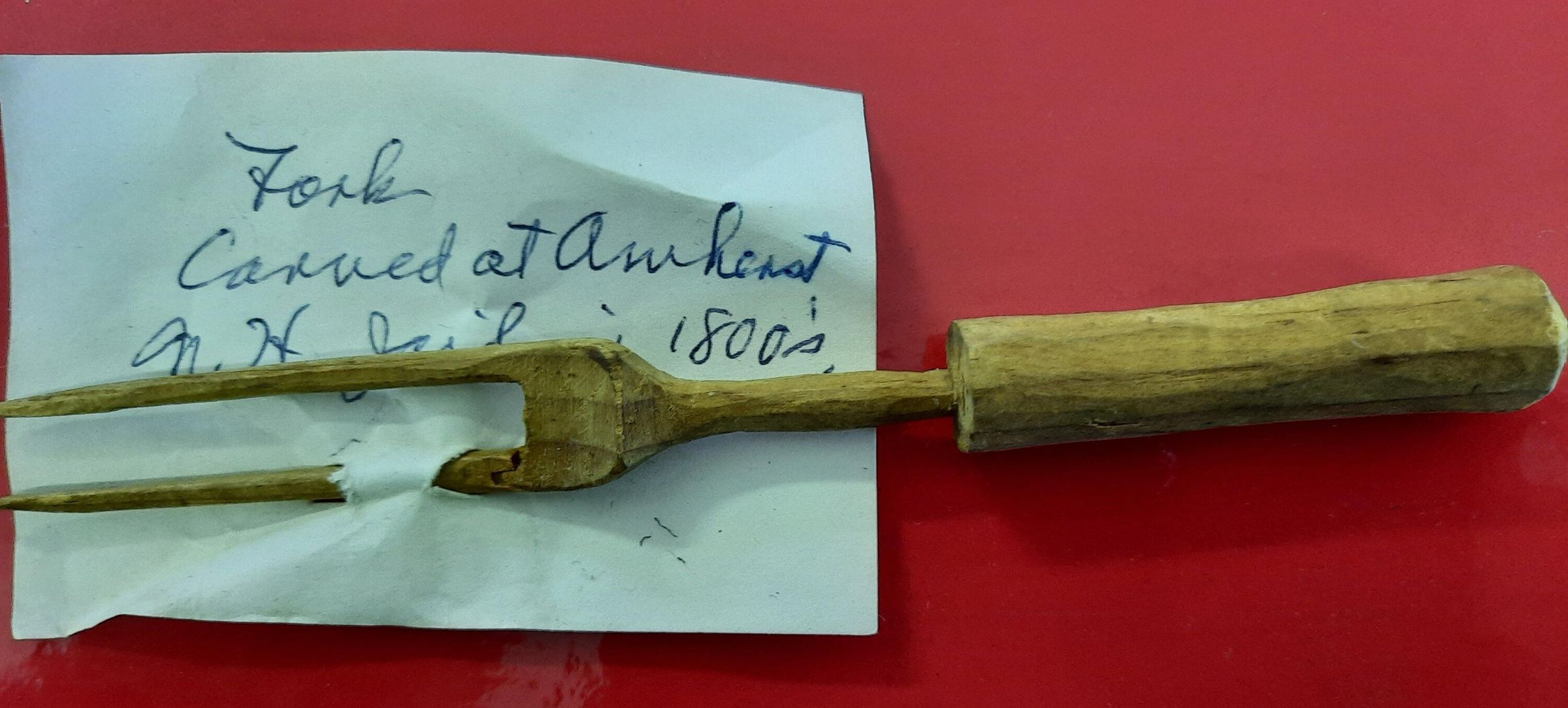A wooden carved fork purported to have been carved in the old jailhouse. Amongst the belongings of Samuel Melendy's great-granddaughter Pearl (Hartshorn) Darling.Acquisition