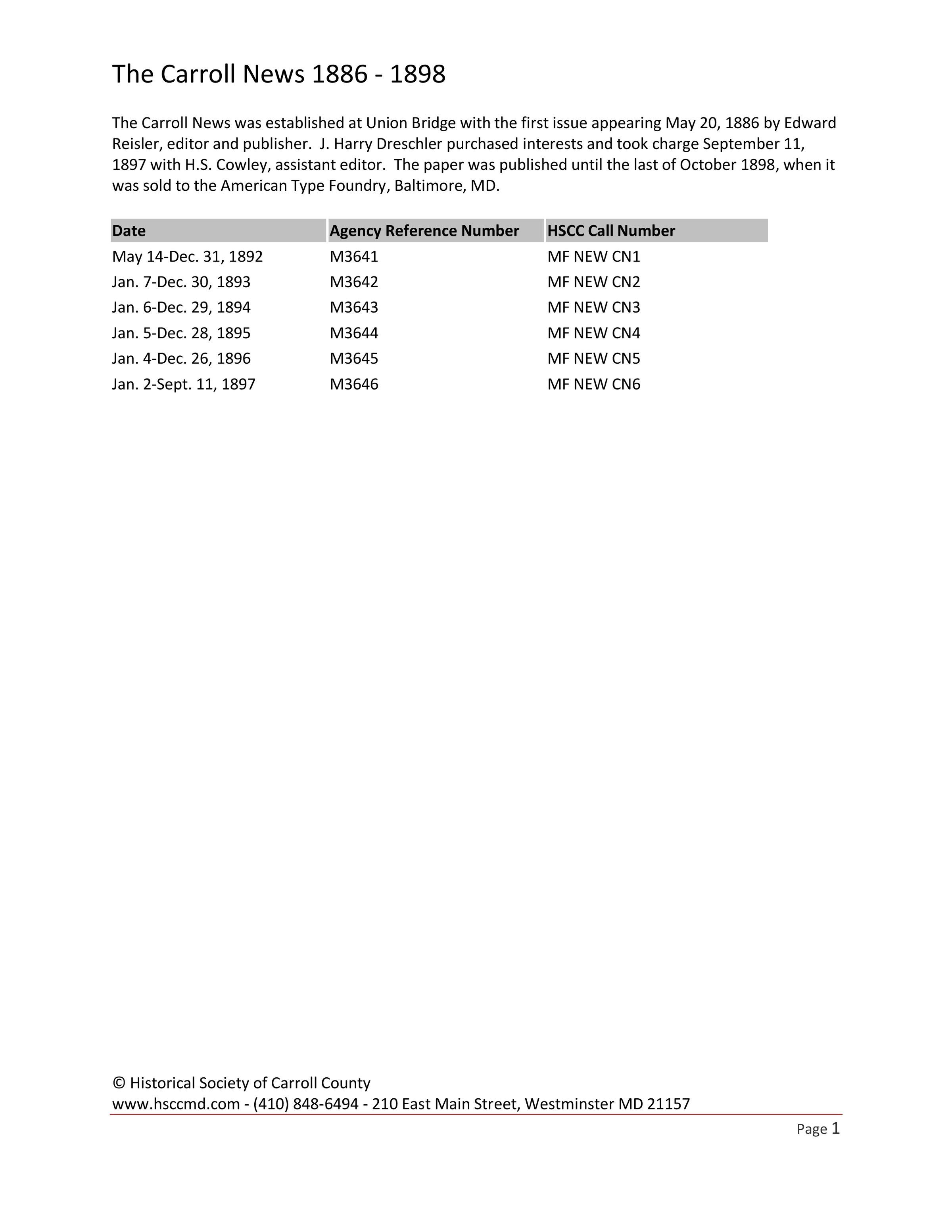 The Carroll News was established at Union Bridge with the first issue appearing May 20, 1886 by Edward Reisler, editor and publisher. J. Harry Dreschler purchased interests and took charge September 11, 1897 with H.S. Cowley, assistant editor. The paper was published until the last of October 1898, when it was sold to the American Type Foundry, Baltimore, MD.