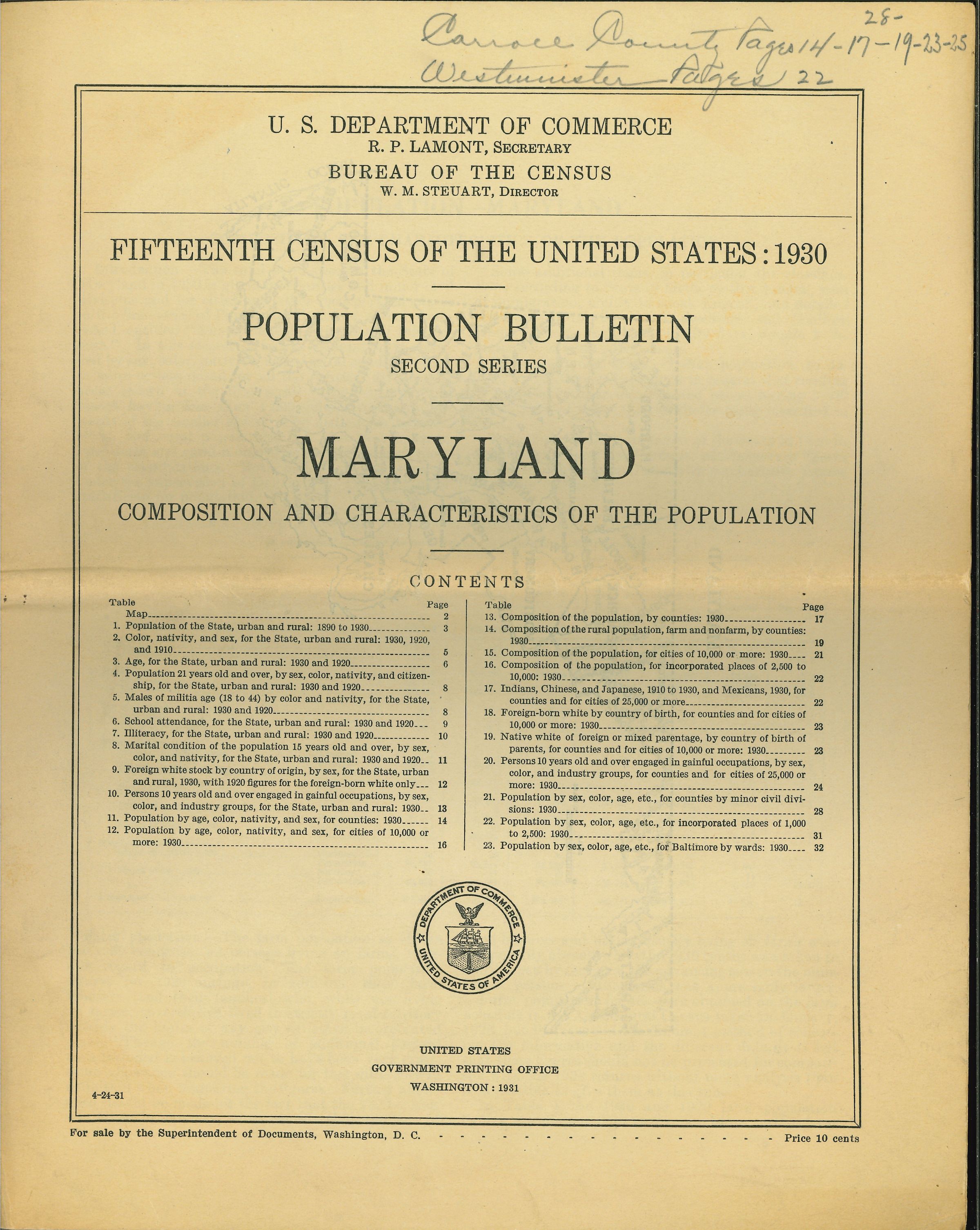 Fifteenth Census of the United States: 1930, Population Bulletin, Second Series, MarylandEntry/Object ID