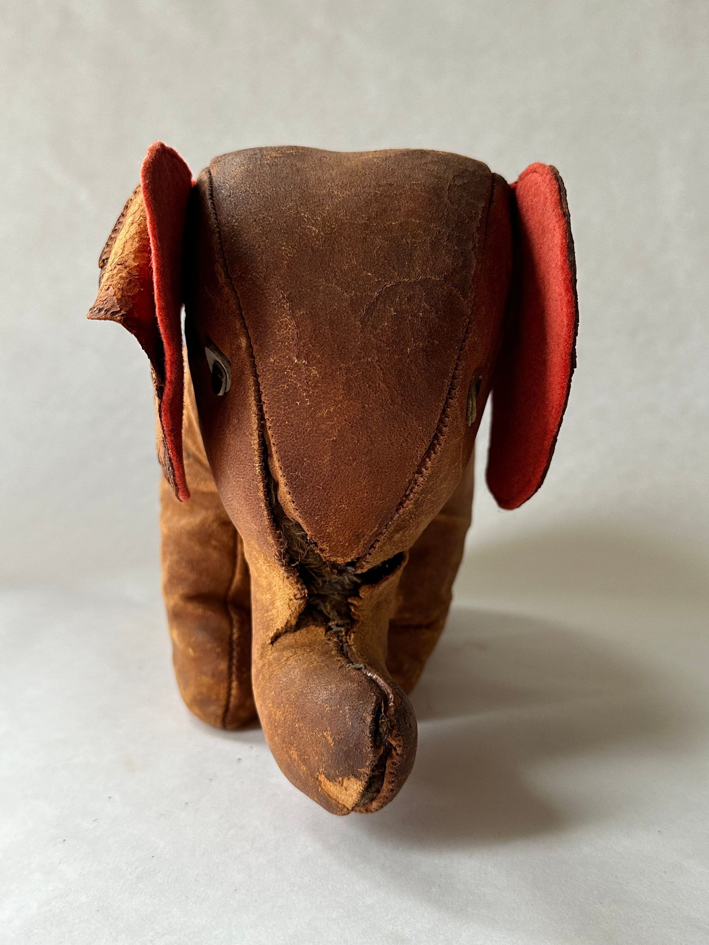 An elephant toy made of leather with a short trunk and two ears, lined in red wool. Their white and black leather eyes are sewn to their head. It stands on four legs. The body and legs are stuffed with an unknown material.