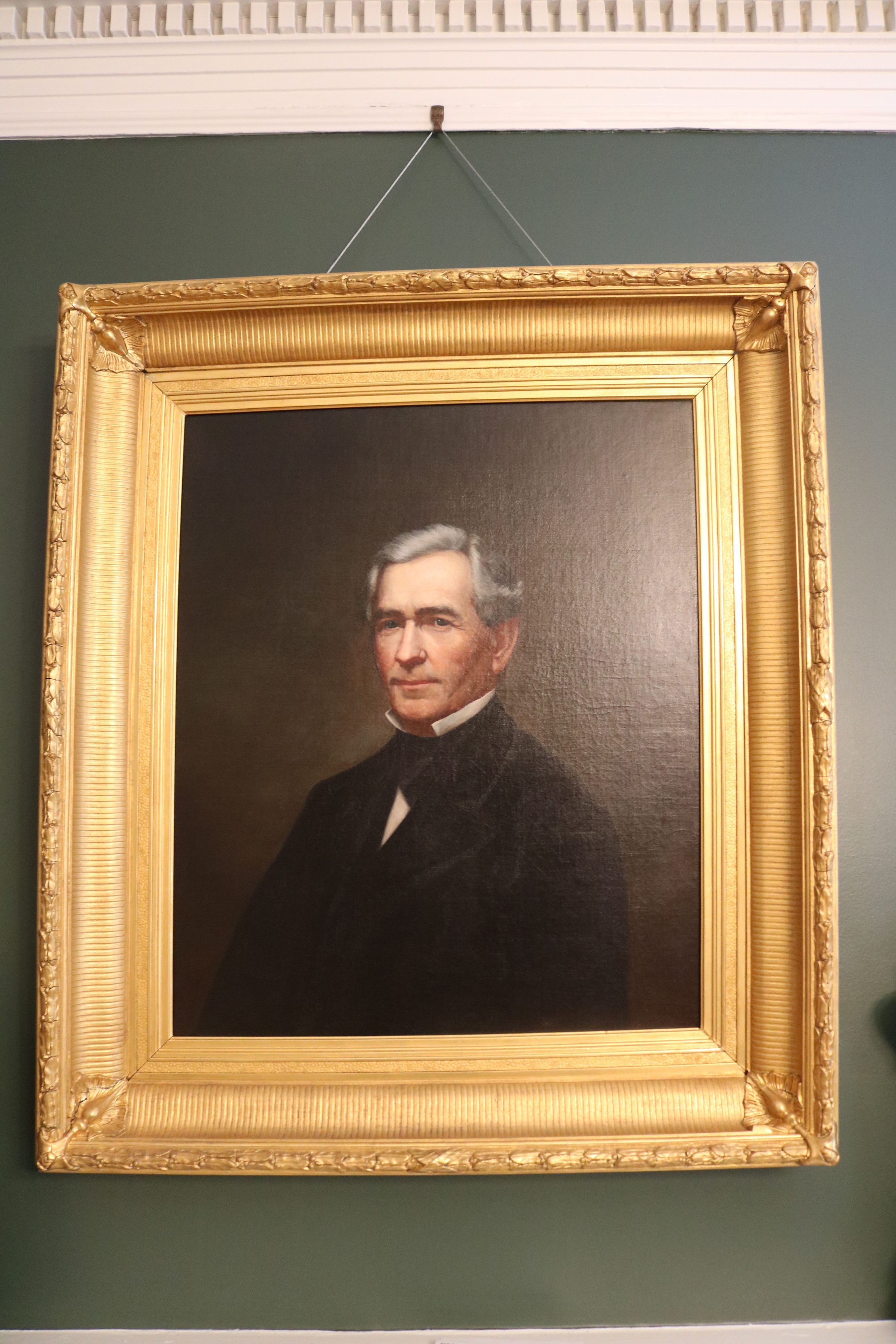 Painting, oil. Portrait of John Longwell on a simple grey background in a large ornate gold frame.