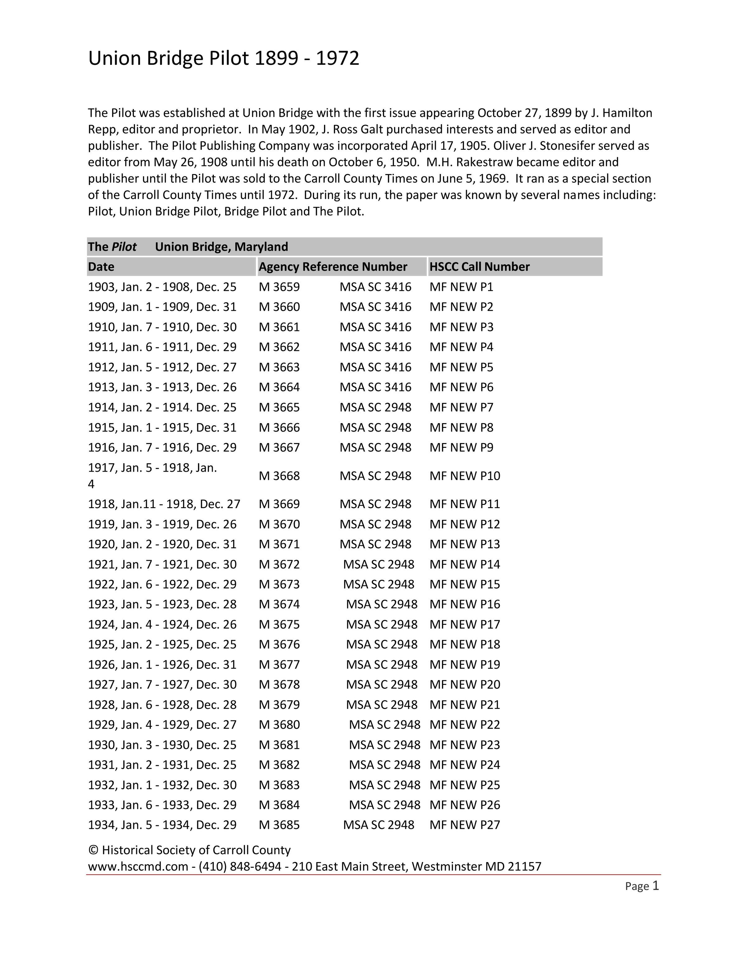 The Pilot was established at Union Bridge with the first issue appearing October 27, 1899 by J. Hamilton Repp, editor and proprietor. In May 1902, J. Ross Galt purchased interests and served as editor and publisher. The Pilot Publishing Company was incorporated April 17, 1905. Oliver J. Stonesifer served as editor from May 26, 1908 until his death on October 6, 1950. M.H. Rakestraw became editor and publisher until the Pilot was sold to the Carroll County Times on June 5, 1969. It ran as a special section of the Carroll County Times until 1972. During its run, the paper was known by several names including: Pilot, Union Bridge Pilot, Bridge Pilot and The Pilot.