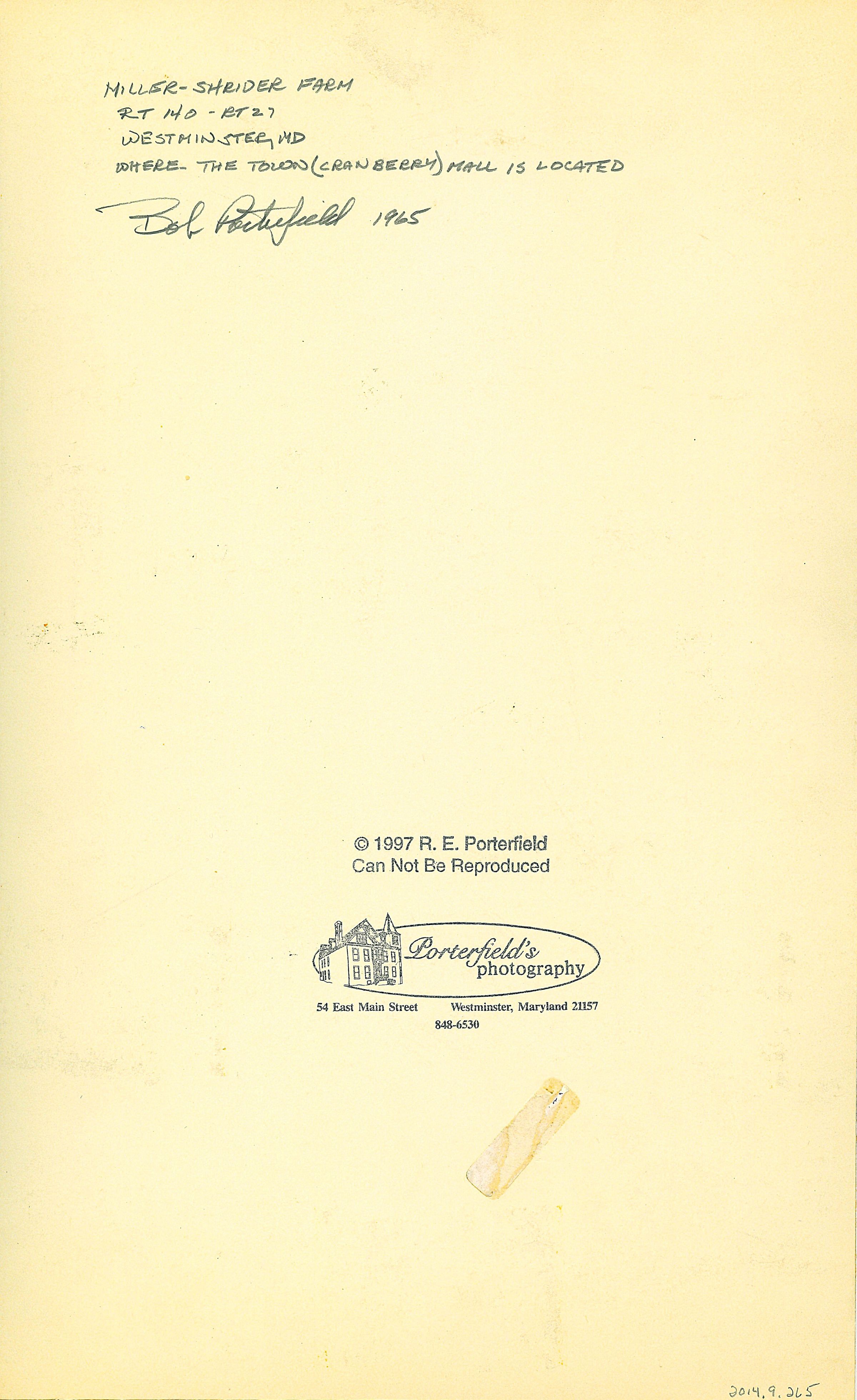 Print, photographic. B/W image taken at the Miller/Shriver farm, 1965. Detail of the gable end of the barn. Building is abandoned. Mounted on cream-colored mat board. Written below image: MILLER-SHRIVER FARM BOB PORTERFIELD ’65. Photographer’s stamp on back: © 1997 R.E. Porterfield 54 East Main Street Westminster, Maryland 21157 848-6530. 13.125” x 8”.Acquisition