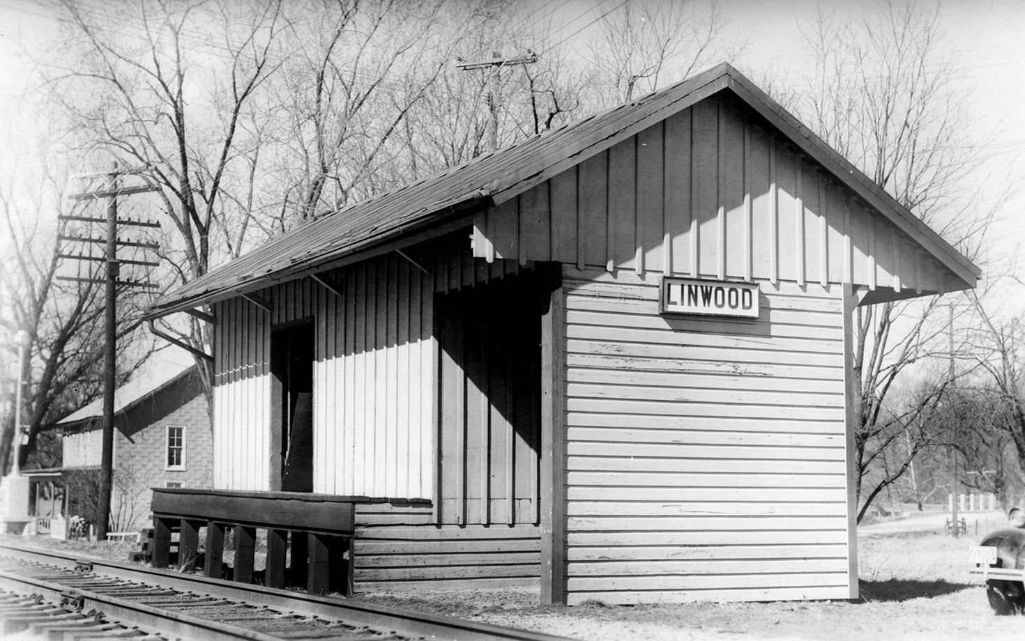 Postcard. B/W photograph of the Western Maryland railroad station at Linwood, 1956. Shows small frame building with raised platform along trackside, sign on side of building reads "LINWOOD." Back reads, "Photo Post Card. Railroad Westrn Maryland. No. Class. BLDR. Date. No. At: Linwood Station, MD. Date: Feb. 26 1956. W.R. Hicks. Address". 3.5" x 5.5"Acquisition