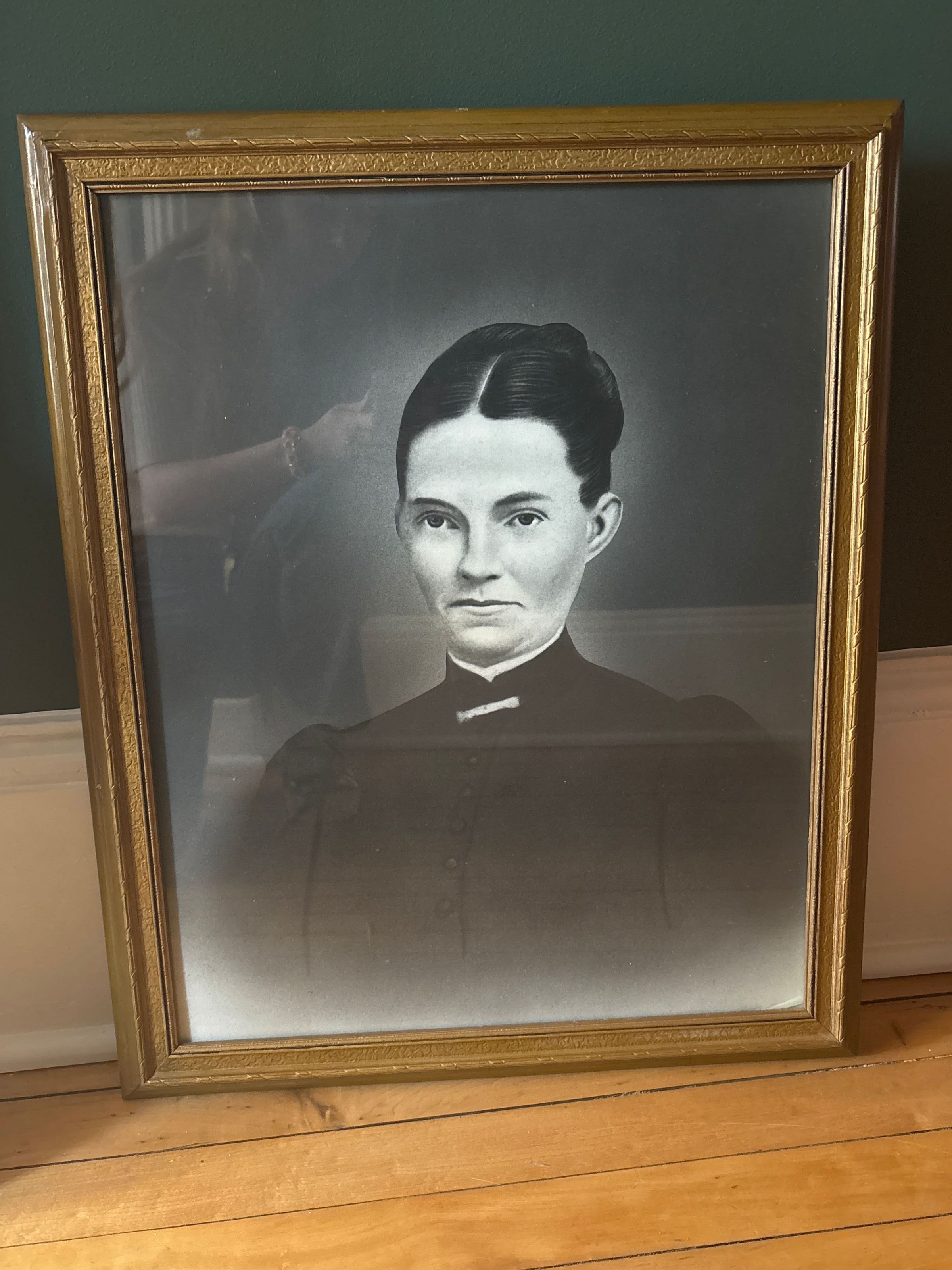 Print, photographic. A: B/W photograph of a drawing of Harriet Virginia Deeds Glover. Original image c.1890. 15.875" x 19.875". B: Frame; wood; painted gold; decorative border around center.Acquisition