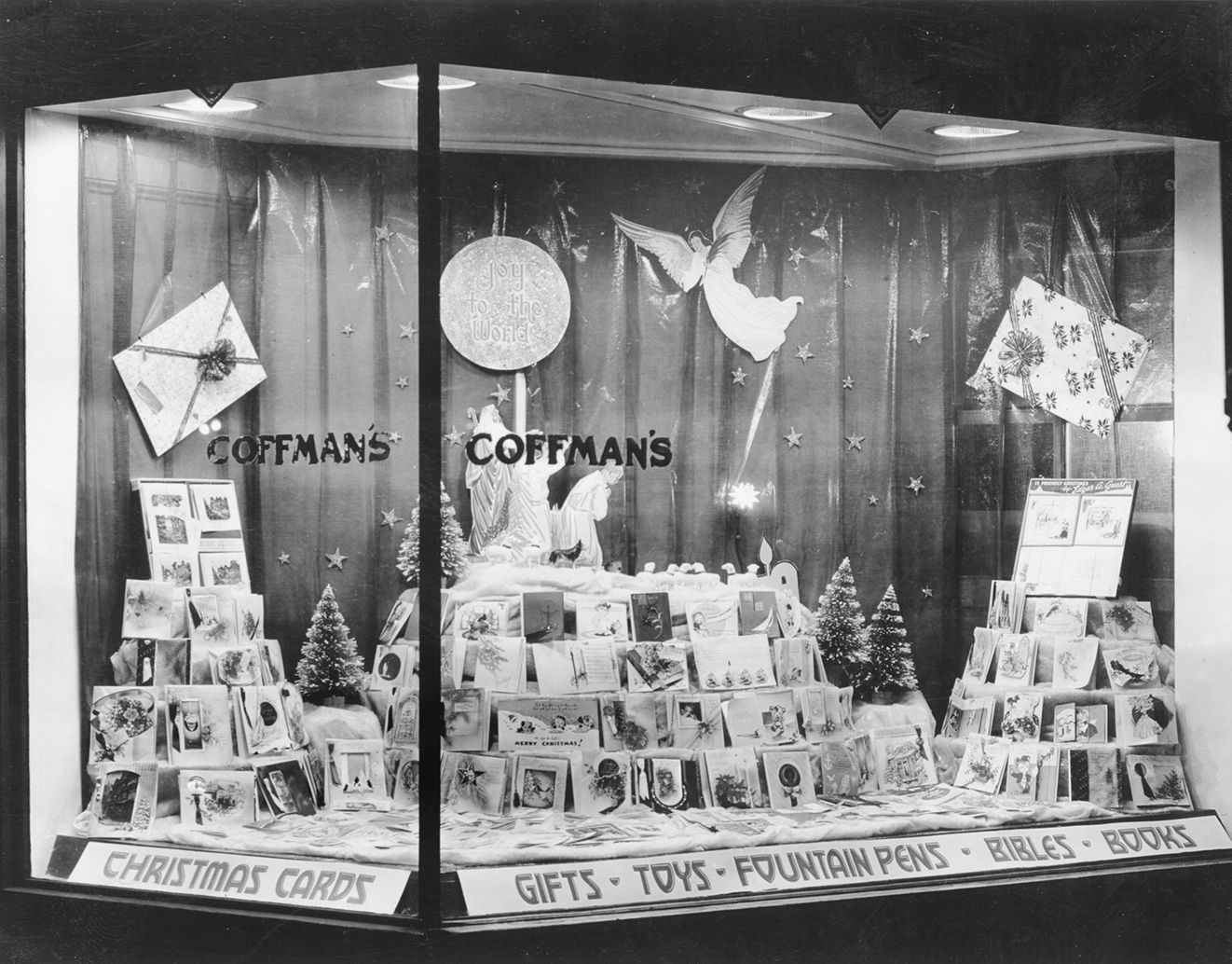 Photograph, page 27, top center, black and white paper gelatin print, Joy to the World", Christmas window display, stamped "64" on the reverse in blue ink, Coffman’s, 1937.Acquisition