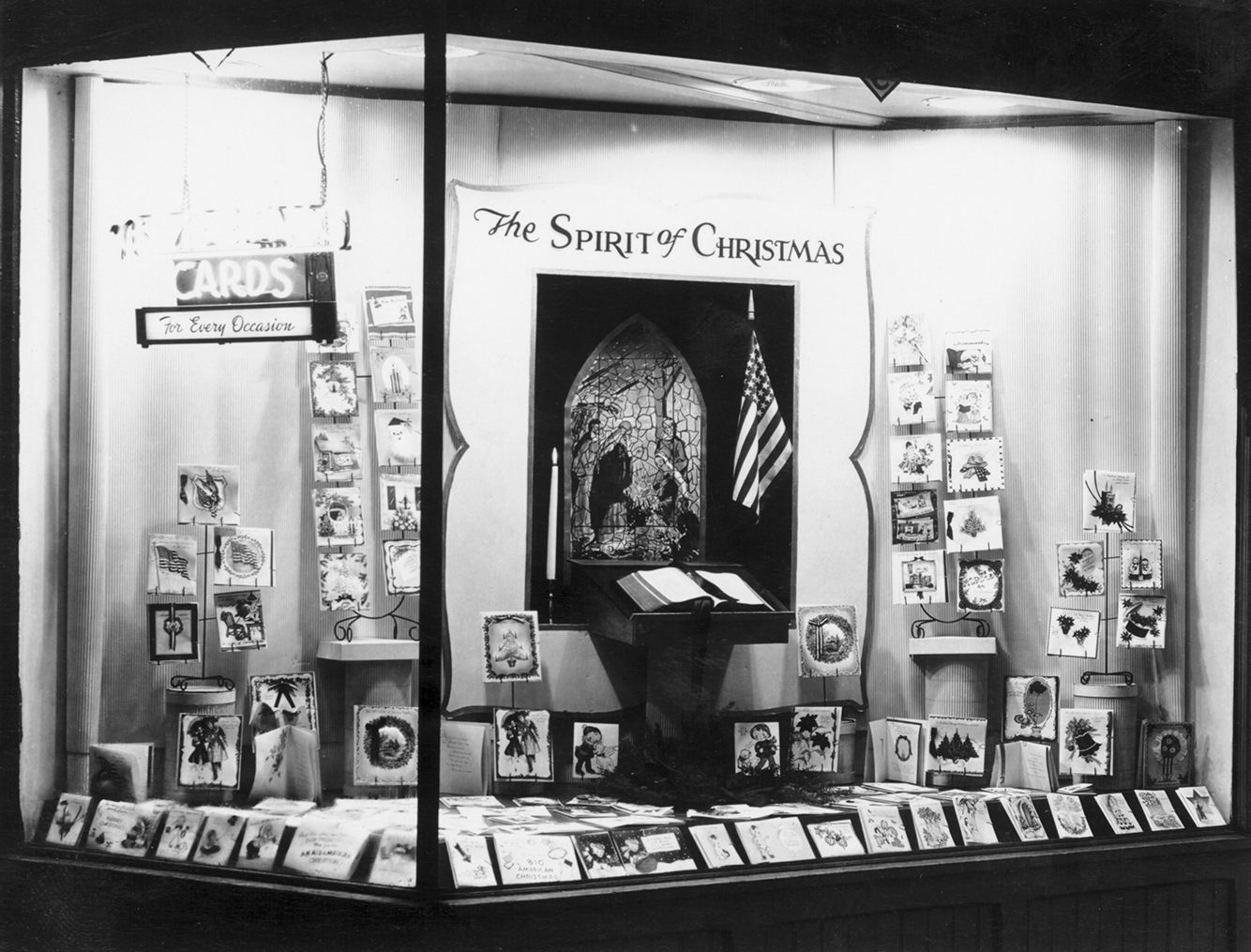 Photograph, page 26, right proper, black and white paper gelatin print, The Spirit of Christmas", Christmas window display, stamped "64" on the reverse in blue ink, Coffman’s, c. 1930.Acquisition