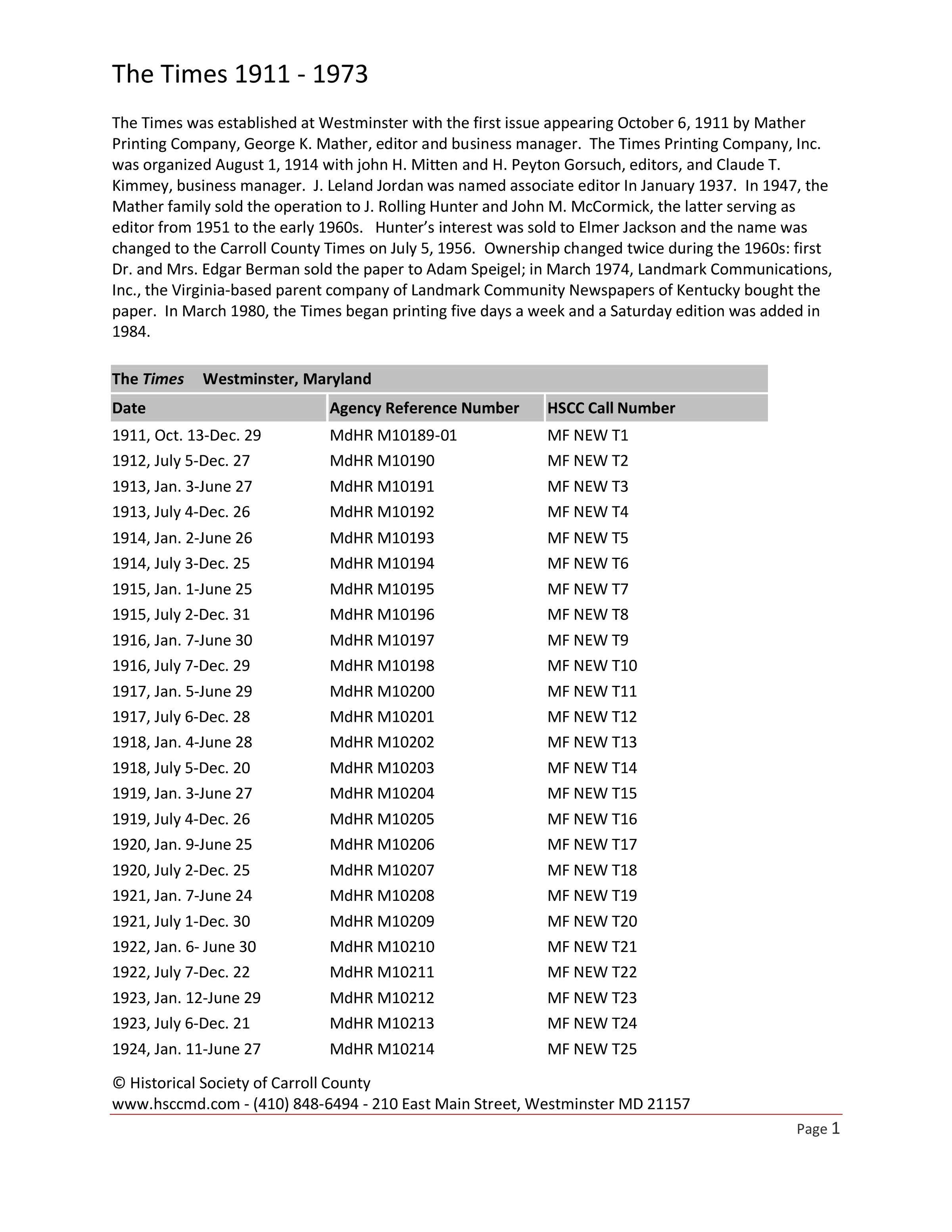 The Times Newspaper (Carroll County Times) 1911 - 1973Description