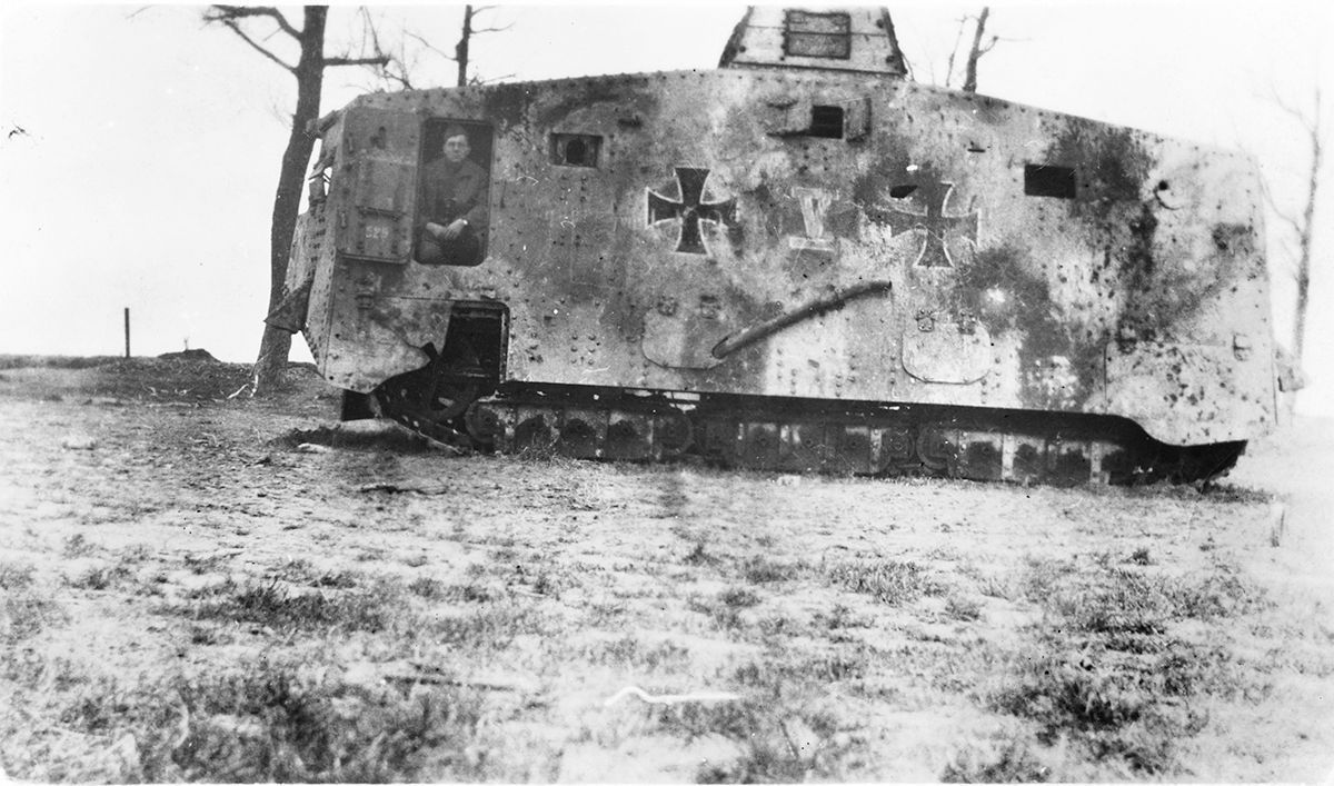 Print, photographic. Nowell L. Norwood of Mount Airy, Carroll County, Maryland, 16th Infantry Regiment, 1st Division, American Expeditionary Forces, posing in a captured German tank, c. 1917-1918. Photographer unknown. 4.5" x 6.5".Acquisition
