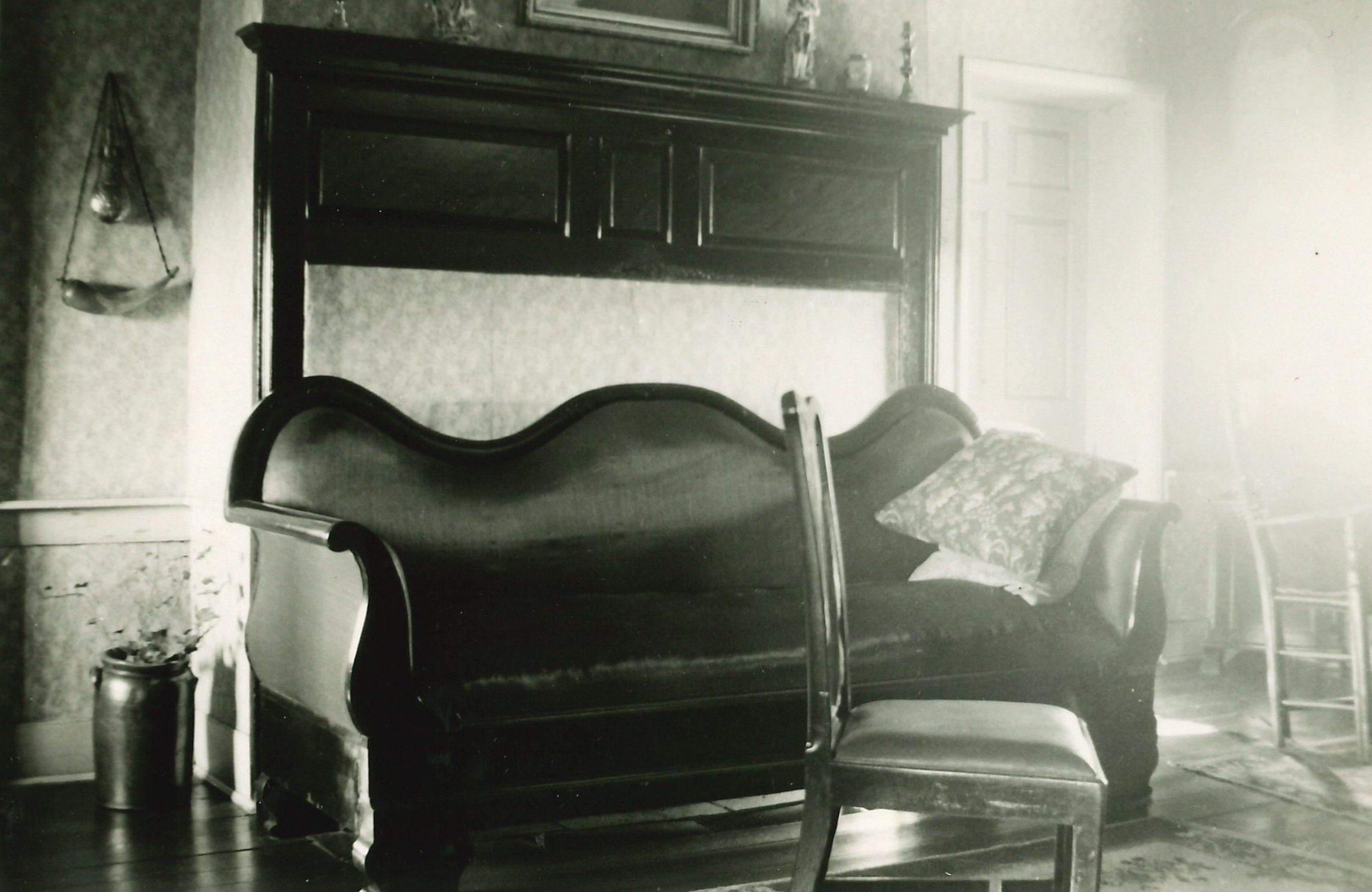 Print, photographic. B/W photograph of the interior of Long Farm in Westminster. Shows the a parlor with a long, dark colored couch in front of what appears to be a bricked up fireplace with wallpaper over it, so that only the mantle is visible. A wooden chair is in front of the couch, while a rocking chair is to the proper right of the couch. Inscription on the back reads, "Mrs. Robert Gist". 4" x 6". C. 1940.Acquisition