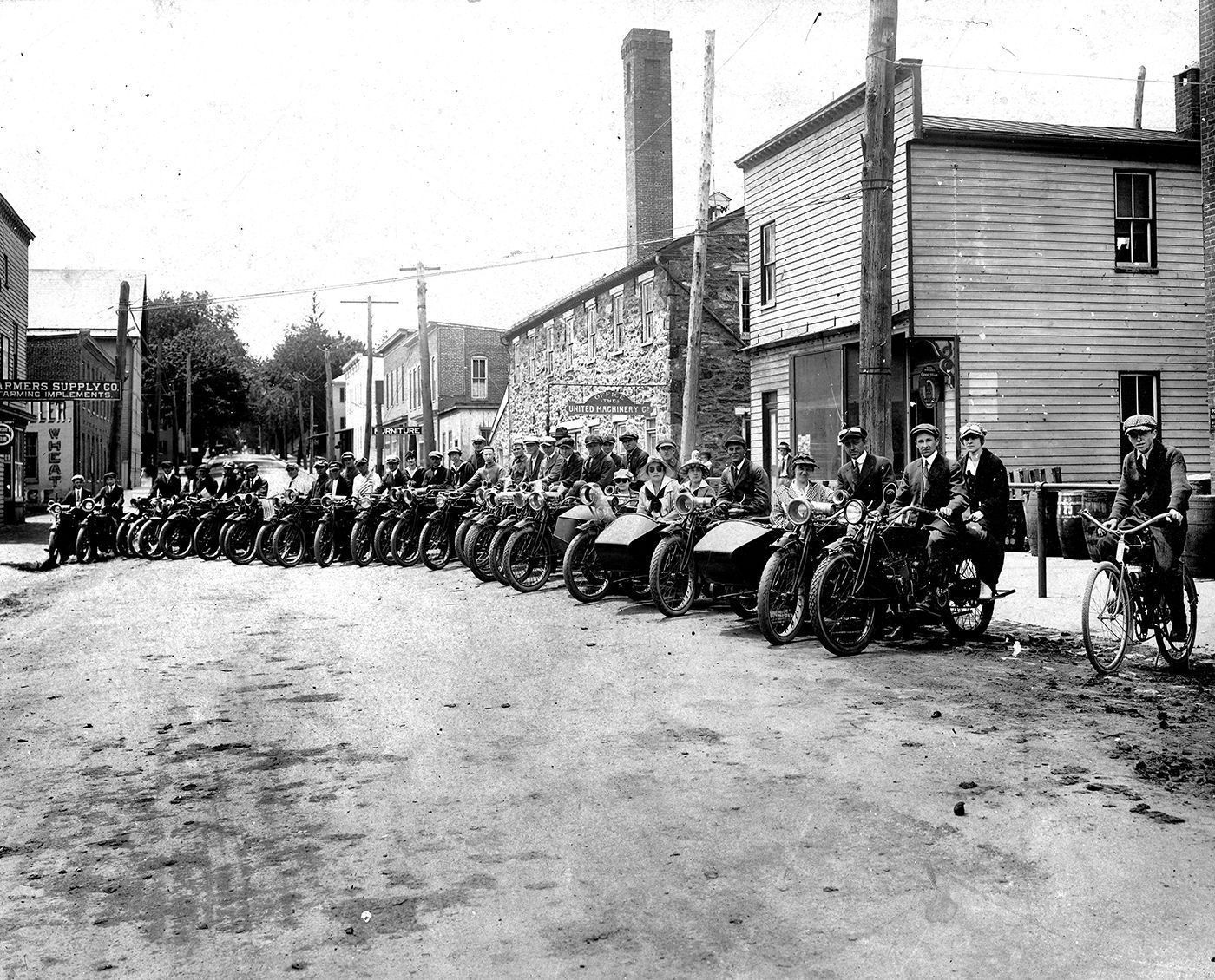 Print, photographic. B/W photograph of a group of motorcycles on Liberty Street, Westminster. The photograph features a group of both woman and men, on their motorcycles, in an arching line going down the road. On the proper right, at the very end of the line, is a young man on a bicycle. The photograph is mounted on cream matboard and in the lower proper right corner, the maker's mark reads, "Lewis Westminster". Overall size:12" x 14"; image size: 7.875" x 9.75". C.1915Acquisition
